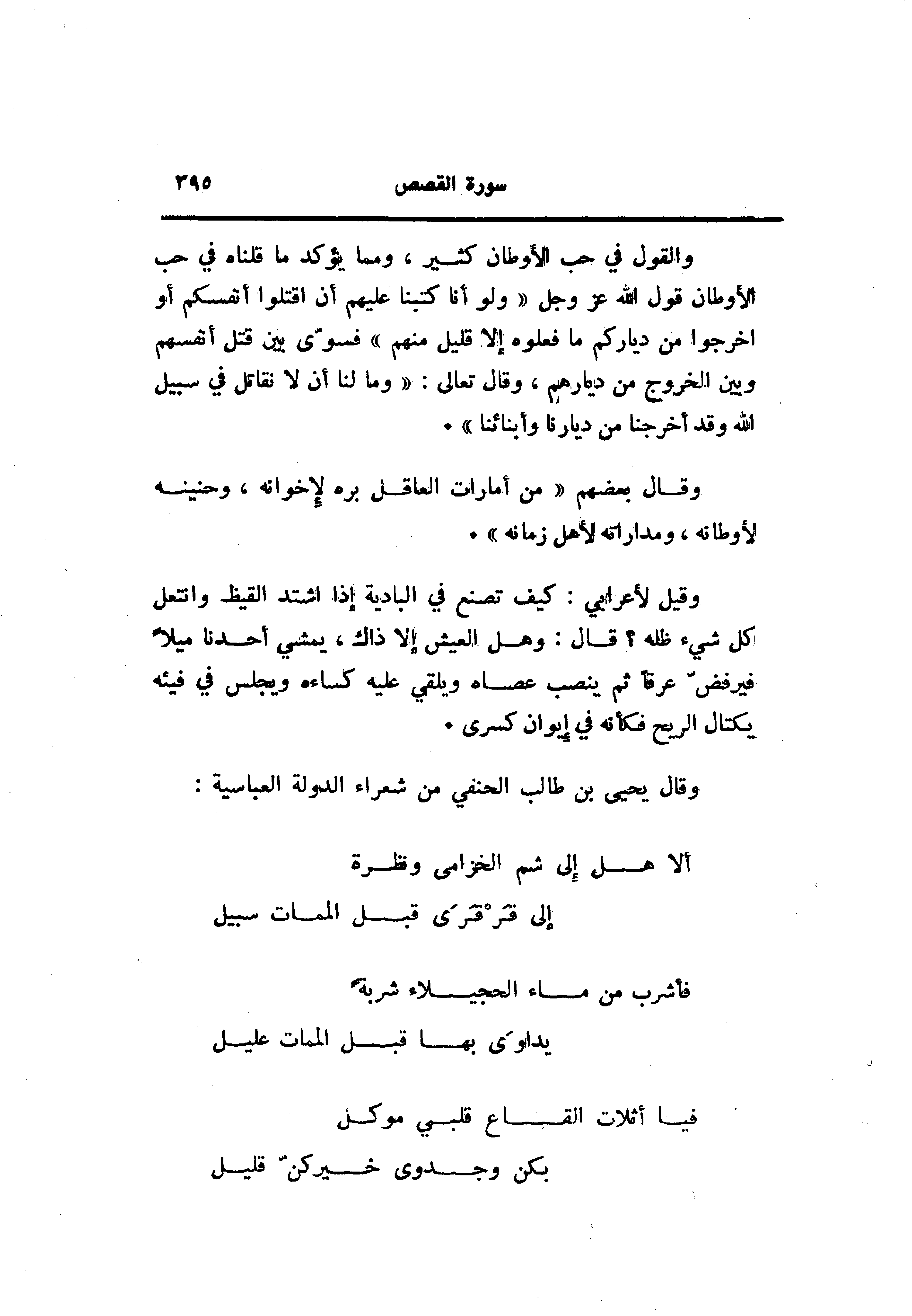 والقول في حب الأوطان كثير، ومما يؤكد ما قلناه في حب الأوطان قول الله عز وجل «ولو أنا كتبنا عليهم أن اقتلوا أنفسكم أو اخرجوا من دياركم ما فعلوه إلا قليل منهم» فسوّى بين قتل أنفسهم وبين الخروج من ديارهم، وقال تعالى: «وما لنا أن لا نقاتل في سبيل الله وقد أخرجنا من ديارنا وأبنائنا» .