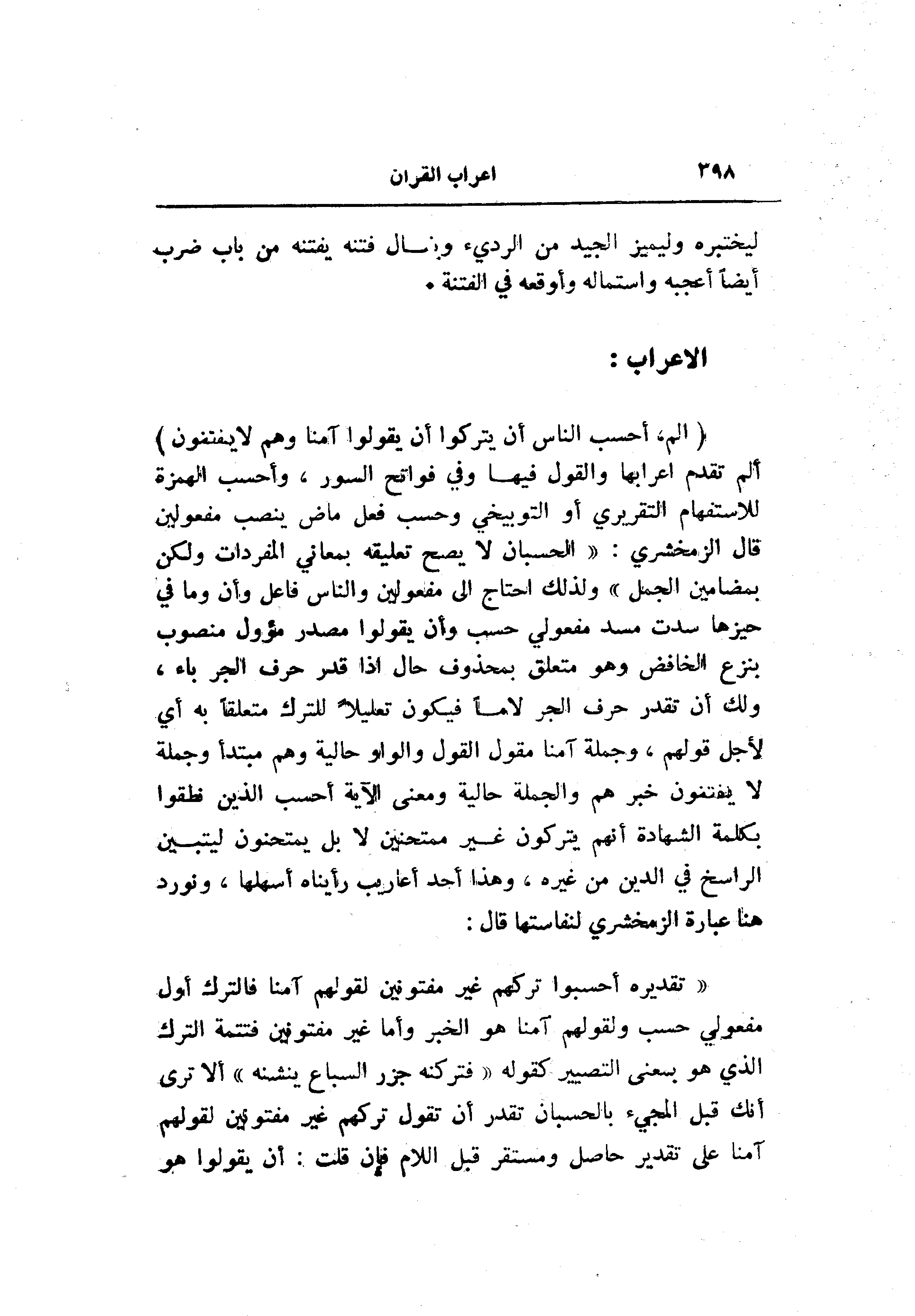 (الم، أَحَسِبَ النَّاسُ أَنْ يُتْرَكُوا أَنْ يَقُولُوا آمَنَّا وَهُمْ لا يُفْتَنُونَ) ألم تقدم اعرابها والقول فيها وفي فواتح السور، وأحسب الهمزة للاستفهام التقريري أو التوبيخي وحسب فعل ماض ينصب مفعولين قال الزمخشري: «الحسبان لا يصح تعليقه بمعاني المفردات ولكن بمضامين الجمل» ولذلك احتاج الى مفعولين والناس فاعل وأن وما في حيزها سدت مسد مفعولي حسب وأن يقولوا مصدر مؤول منصوب بنزع الخافض وهو متعلق بمحذوف حال إذا قدر حرف الجر باء، ولك أن تقدر حرف الجر لاما فيكون تعليلا للترك متعلقا به أي لأجل قولهم، وجملة آمنا مقول القول والواو حالية وهم مبتدأ وجملة لا يفتنون خبر هم والجملة حالية ومعنى الآية أحسب الذين نطقوا بكلمة الشهادة أنهم يتركون غير ممتحنين لا بل يمتحنون ليتبين الراسخ في الدين من غيره، وهذا أحد أعاريب رأيناه أسهلها، ونورد هنا عبارة الزمخشري لنفاستها قال: