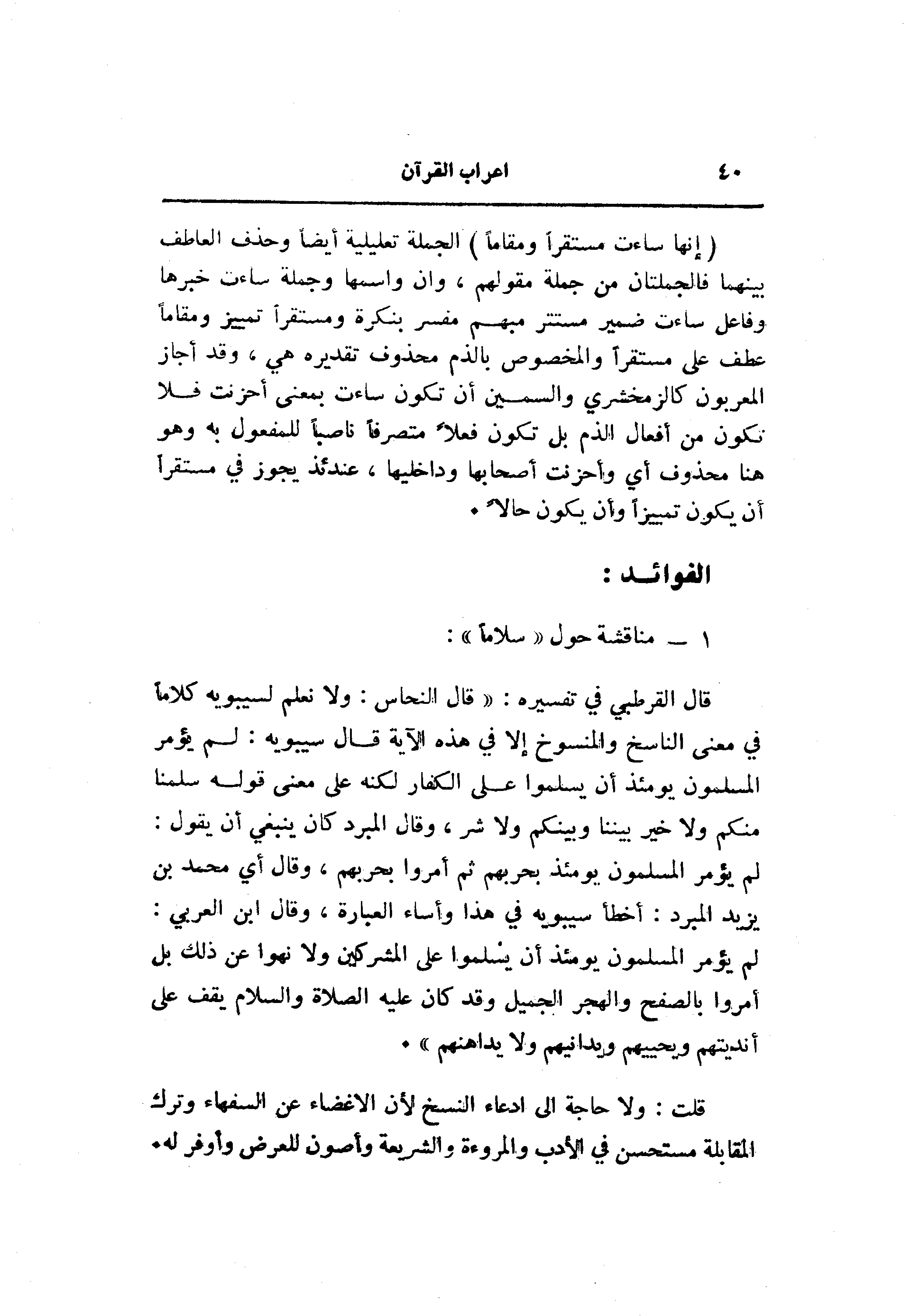 قال القرطبي في تفسيره: «قال النحاس: ولا نعلم لسيبويه كلاما في معنى الناسخ والمنسوخ إلا في هذه الآية قال سيبويه: لم يؤمر المسلمون يومئذ أن يسلموا على الكفار لكنه على معنى قوله سلمنا منكم ولا خير بيننا وبينكم ولا شر، وقال المبرد كان ينبغي أن يقول: