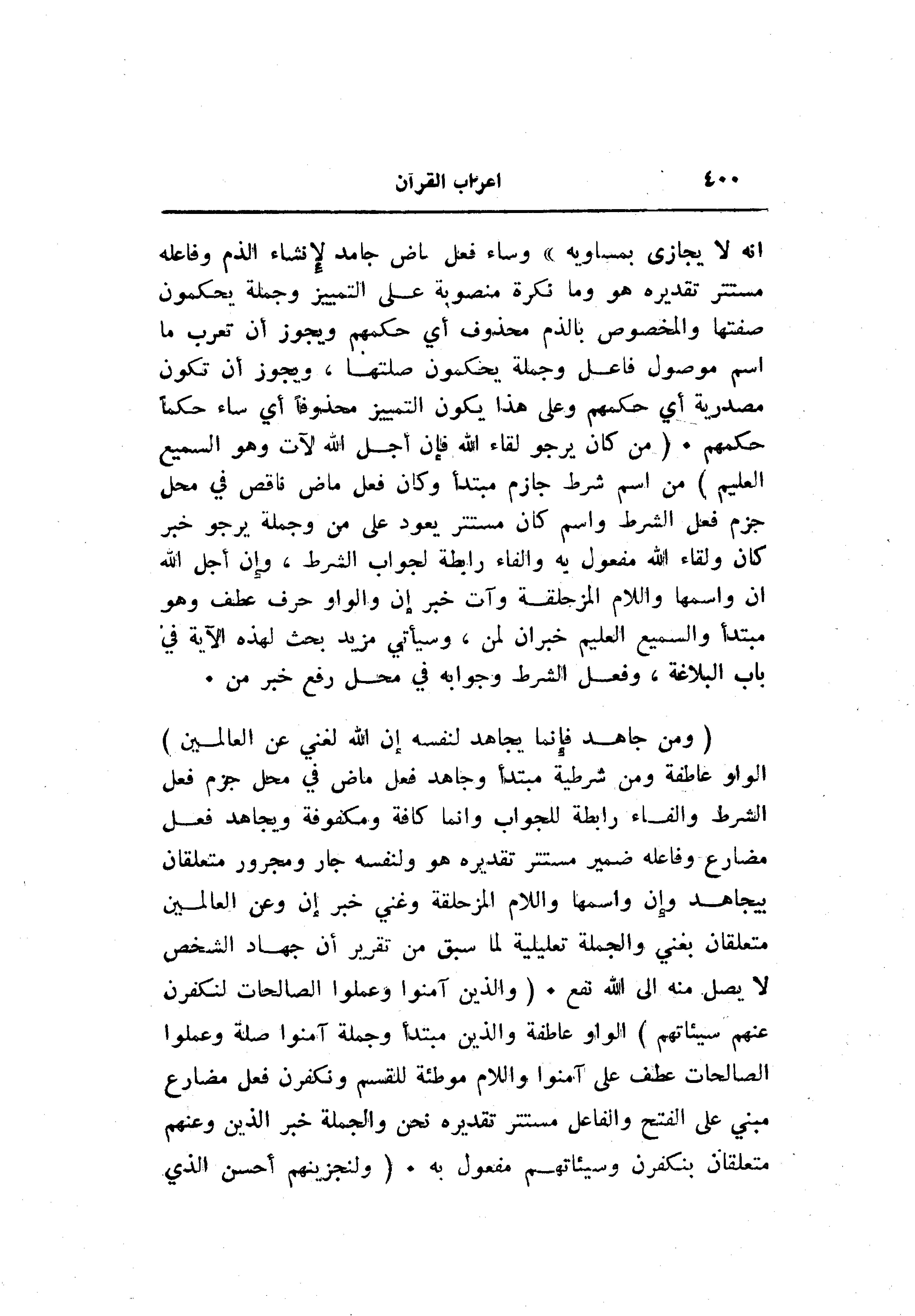 انه لا يجازى بمساويه» وساء فعل ماض جامد لإنشاء الذم وفاعله مستتر تقديره هو وما نكرة منصوبة على التمييز وجملة يحكمون صفتها والمخصوص بالذم محذوف أي حكمهم ويجوز أن تعرب ما اسم موصول فاعل وجملة يحكمون صلتها، ويجوز أن تكون مصدرية أي حكمهم وعلى هذا يكون التمييز محذوفا أي ساء حكما حكمهم. (مَنْ كانَ يَرْجُوا لِقاءَ اللَّهِ فَإِنَّ أَجَلَ اللَّهِ لَآتٍ وَهُوَ السَّمِيعُ الْعَلِيمُ) من اسم شرط جازم مبتدأ وكان فعل ماض ناقص في محل جزم فعل الشرط واسم كان مستتر يعود على من وجملة يرجو خبر كان ولقاء الله مفعول به والفاء رابطة لجواب الشرط، وإن أجل الله ان واسمها واللام المزحلقة وآت خبر إن والواو حرف عطف وهو مبتدأ والسميع العليم خبران لمن، وسيأتي مزيد بحث لهذه الآية في باب البلاغة، وفعل الشرط وجوابه في محل رفع خبر من.
