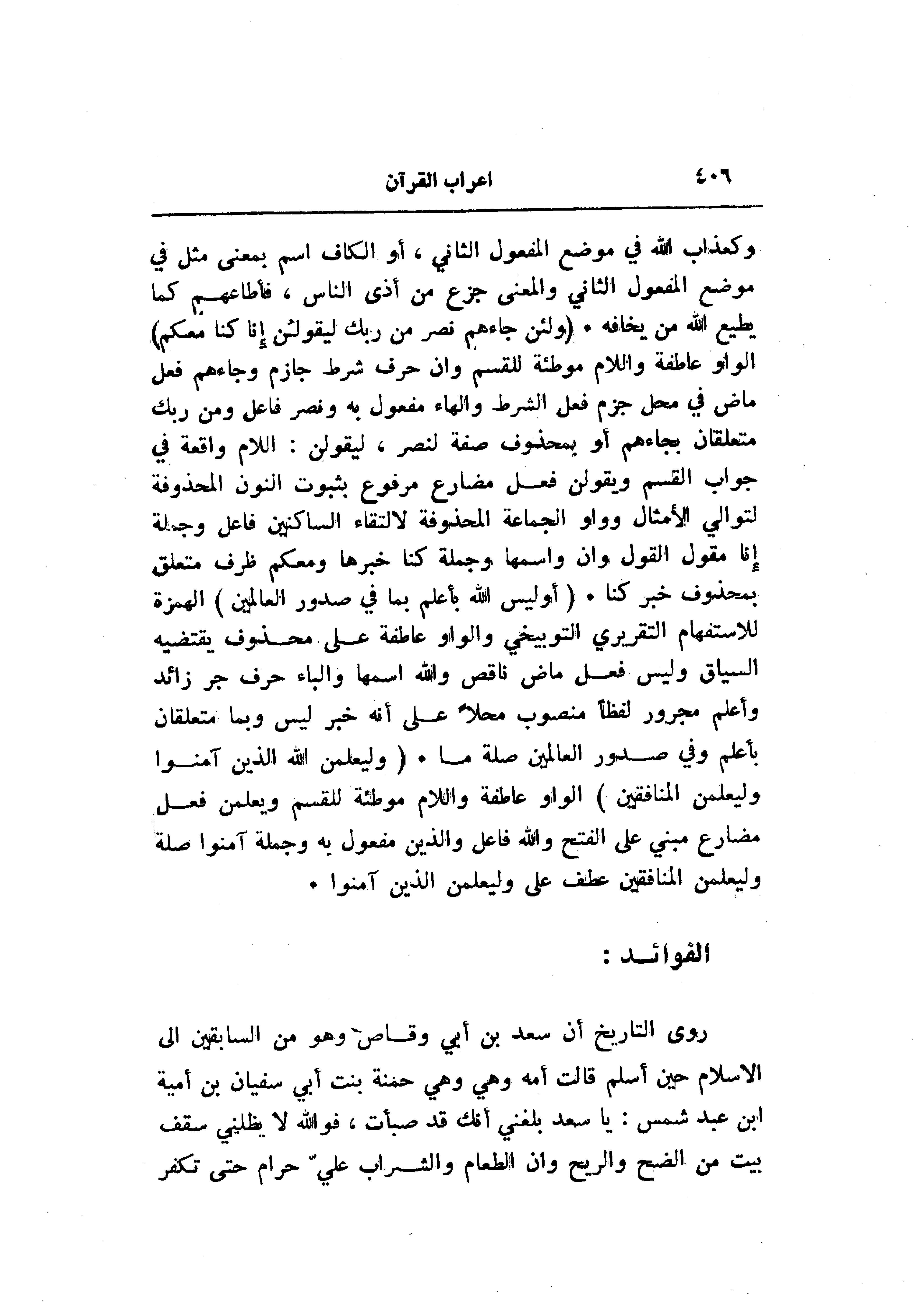 وكعذاب الله في موضع المفعول الثاني، أو الكاف اسم بمعنى مثل في موضع المفعول الثاني والمعنى جزع من أذى الناس، فأطاعهم كما يطيع الله من يخافه. (وَلَئِنْ جاءَ نَصْرٌ مِنْ رَبِّكَ لَيَقُولُنَّ إِنَّا كُنَّا مَعَكُمْ) الواو عاطفة واللام موطئة للقسم وان حرف شرط جازم وجاءهم فعل ماض في محل جزم فعل الشرط والهاء مفعول به ونصر فاعل ومن ربك متعلقان بجاءهم أو بمحذوف صفة لنصر، ليقولن: اللام واقعة في جواب القسم ويقولن فعل مضارع مرفوع بثبوت النون المحذوفة لتوالي الأمثال وواو الجماعة المحذوفة لالتقاء الساكنين فاعل وجملة إنا مقول القول وان واسمها وجملة كنا خبرها ومعكم ظرف متعلق بمحذوف خبر كنا. (أَوَلَيْسَ اللَّهُ بِأَعْلَمَ بِما فِي صُدُورِ الْعالَمِينَ) الهمزة للاستفهام التقريري التوبيخي والواو عاطفة على محذوف يقتضيه السياق وليس فعل ماض ناقص والله اسمها والباء حرف جر زائد وأعلم مجرور لفظا منصوب محلا على أنه خبر ليس وبما متعلقان بأعلم وفي صدور العالمين صلة ما. (وَلَيَعْلَمَنَّ اللَّهُ الَّذِينَ آمَنُوا وَلَيَعْلَمَنَّ الْمُنافِقِينَ) الواو عاطفة واللام موطئة للقسم ويعلمن فعل مضارع مبني على الفتح والله فاعل والذين مفعول به وجملة آمنوا صلة وليعلمن المنافقين عطف على وليعلمن الذين آمنوا.