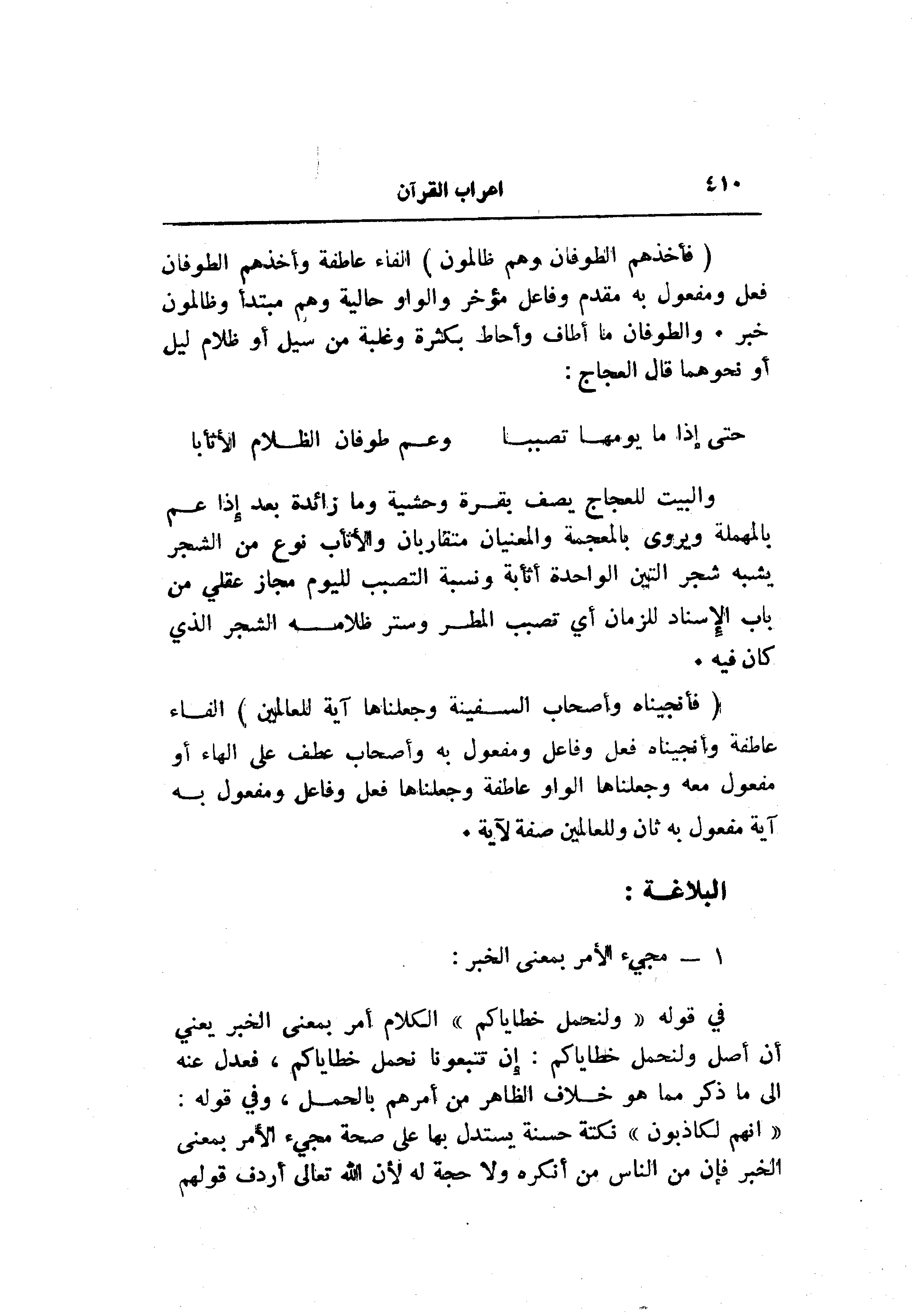 (فَأَخَذَهُمُ الطُّوفانُ وَهُمْ ظالِمُونَ) الفاء عاطفة وأخذهم الطوفان فعل ومفعول به مقدم وفاعل مؤخر والواو حالية وهم مبتدأ وظالمون خبر. والطوفان ما أطاف وأحاط بكثرة وغلبة من سيل أو ظلام ليل أو نحوهما قال العجاج: