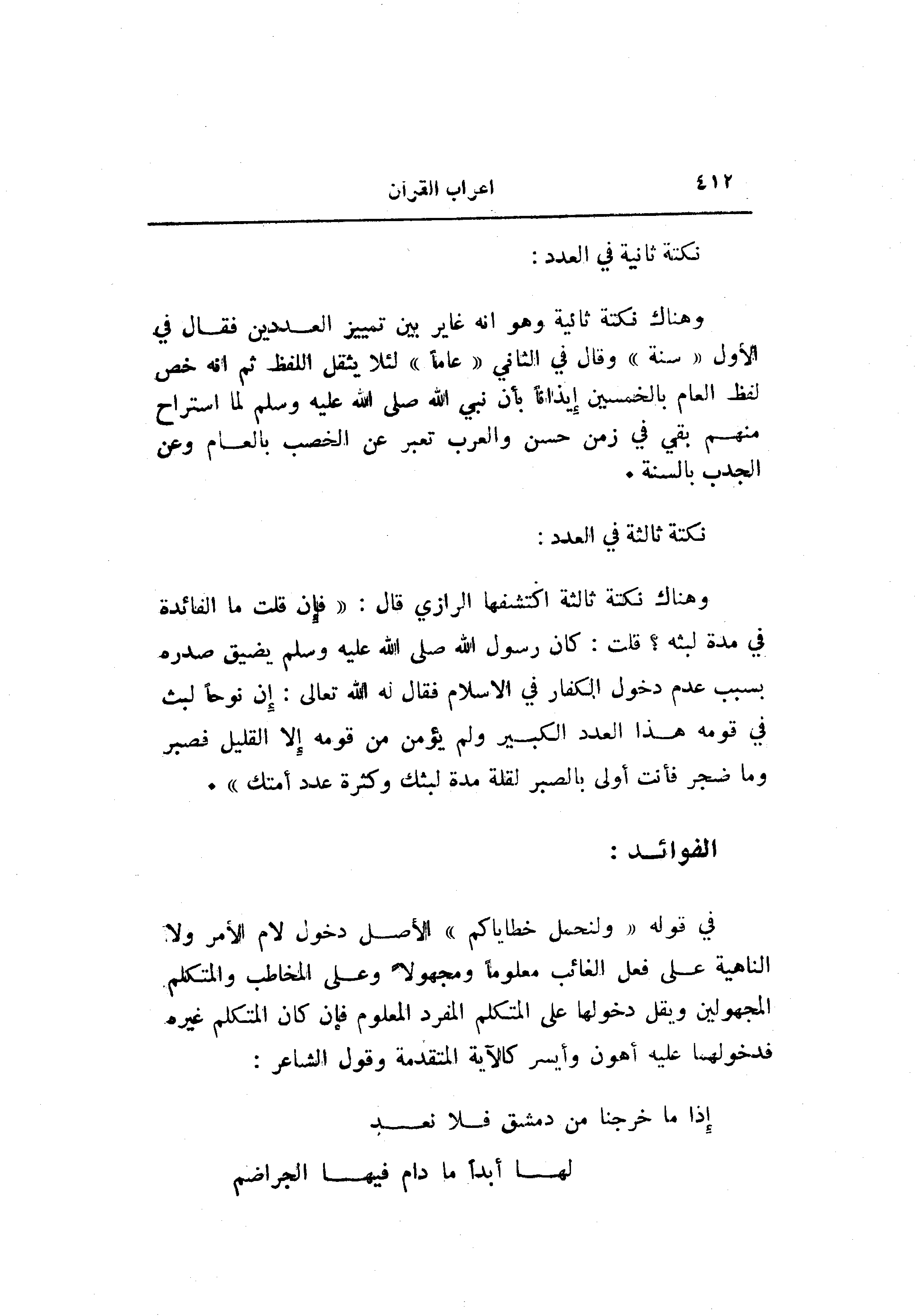 في قوله «ولنحمل خطاياكم» الأصل دخول لام الأمر ولا الناهية على فعل الغائب معلوما ومجهولا وعلى المخاطب والمتكلم المجهولين ويقل دخولها على المتكلم المفرد المعلوم فإن كان المتكلم غيره فدخولهما عليه أهون وأيسر كالآية المتقدمة وقول الشاعر:
