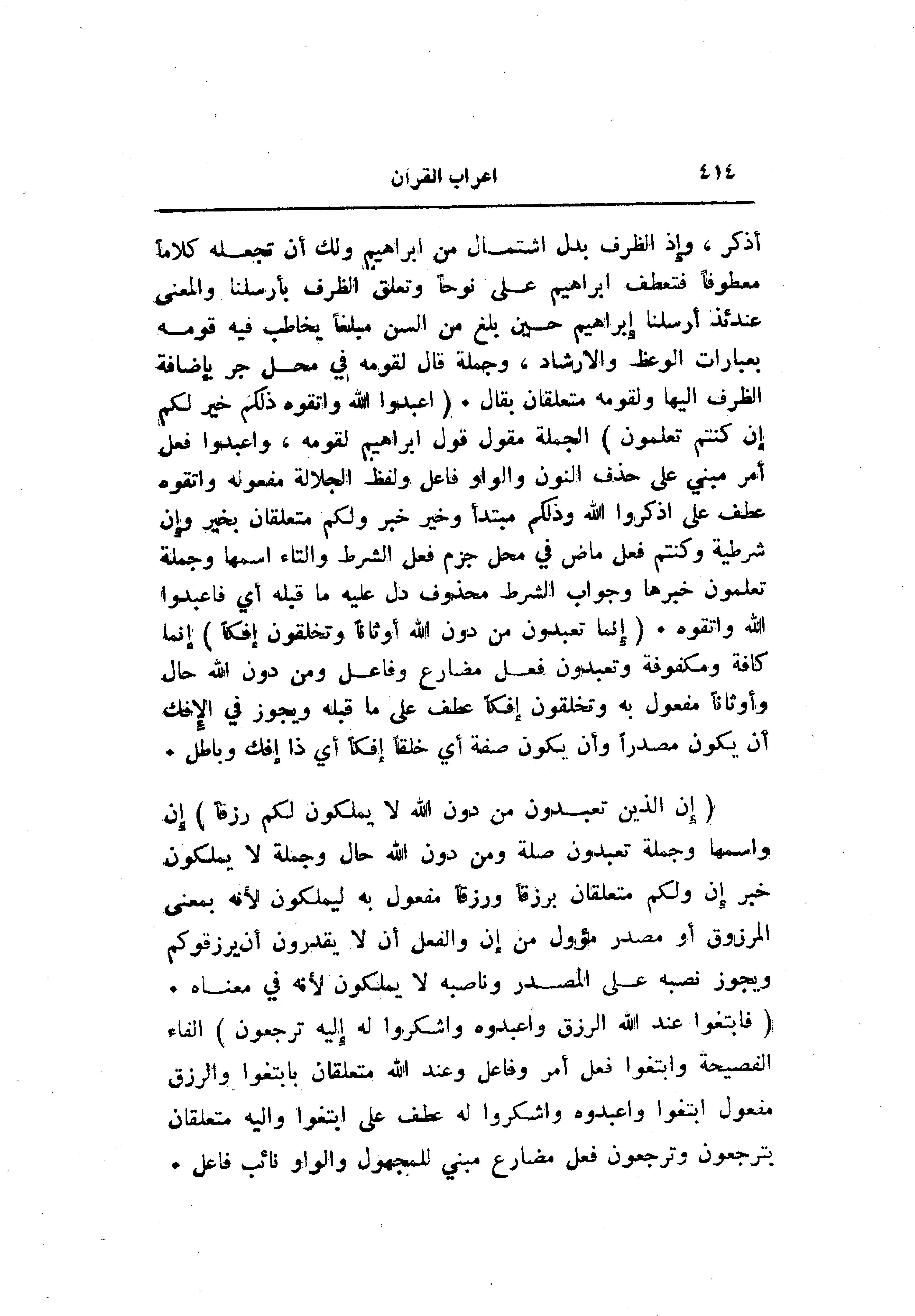 أذكر، وإذ الظرف بدل اشتمال من ابراهيم ولك أن تجعله كلاما معطوفا فتعطف ابراهيم على نوحا وتعلق الظرف بأرسلنا والمعنى عندئذ أرسلنا إبراهيم حين بلغ من السن مبلغا يخاطب فيه قومه بعبارات الوعظ والإرشاد، وجملة قال لقومه في محل جر بإضافة الظرف إليها ولقومه متعلقان بقال. (اعْبُدُوا اللَّهَ وَاتَّقُوهُ ذلِكُمْ خَيْرٌ لَكُمْ إِنْ كُنْتُمْ تَعْلَمُونَ) الجملة مقول قول ابراهيم لقومه، واعبدوا فعل أمر مبني على حذف النون والواو فاعل ولفظ الجلالة مفعوله واتقوه عطف على اذكروا الله وذلكم مبتدأ وخير خبر ولكم متعلقان بخير وإن شرطية وكنتم فعل ماض في محل جزم فعل الشرط والتاء اسمها وجملة تعلمون خبرها وجواب الشرط محذوف دل عليه ما قبله أي فاعبدوا الله واتقوه. (إِنَّما تَعْبُدُونَ مِنْ دُونِ اللَّهِ أَوْثاناً وَتَخْلُقُونَ إِفْكاً) إنما كافة ومكفوفة وتعبدون فعل مضارع وفاعل ومن دون الله حال وأوثانا مفعول به وتخلقون إفكا عطف على ما قبله ويجوز في الإفك أن يكون مصدرا وأن يكون صفة أي خلقا إفكا أي ذا إفك وباطل.