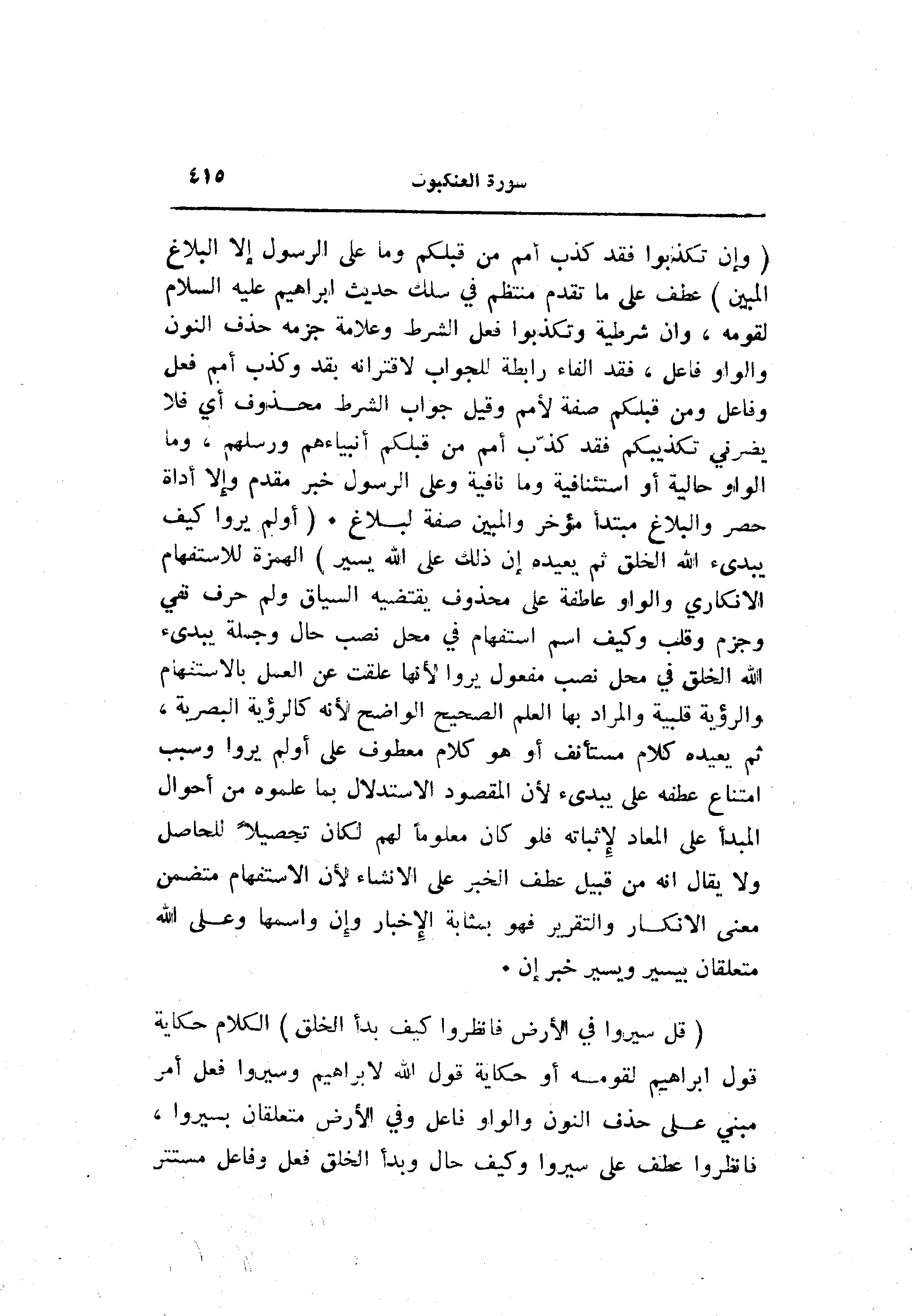(وَإِنْ تُكَذِّبُوا فَقَدْ كَذَّبَ أُمَمٌ مِنْ قَبْلِكُمْ وَما عَلَى الرَّسُولِ إِلَّا الْبَلاغُ الْمُبِينُ) عطف على ما تقدم منتظم في سلك حديث ابراهيم عليه السلام لقومه، وان شرطية وتكذبوا فعل الشرط وعلامة جزمه حذف النون والواو فاعل، فقد الفاء رابطة للجواب لاقترانه بقد وكذب أمم فعل وفاعل ومن قبلكم صفة لأمم وقيل جواب الشرط محذوف أي فلا يضرني تكذيبكم فقد كذّب أمم من قبلكم أنبياءهم ورسلهم، وما الواو حالية أو استئنافية وما نافية وعلى الرسول خبر مقدم وإلا أداة حصر والبلاغ مبتدأ مؤخر والمبين صفة لبلاغ. (أَوَلَمْ يَرَوْا كَيْفَ يُبْدِئُ اللَّهُ الْخَلْقَ ثُمَّ يُعِيدُهُ إِنَّ ذلِكَ عَلَى اللَّهِ يَسِيرٌ) الهمزة للاستفهام الانكاري والواو عاطفة على محذوف يقتضيه السياق ولم حرف نفي وجزم وقلب وكيف اسم استفهام في محل نصب حال وجملة يبدىء الله الخلق في محل نصب مفعول يروا لأنها علقت عن العمل بالاستفهام والرؤية قلبية والمراد بها العلم الصحيح الواضح لأنه كالرؤية البصرية، ثم يعيده كلام مستأنف أو هو كلام معطوف على أولم يروا وسبب امتناع عطفه على يبدىء لأن المقصود الاستدلال بما علموه من أحوال المبدأ على المعاد لإثباته فلو كان معلوما لهم لكان تحصيلا للحاصل ولا يقال انه من قبيل عطف الخبر على الإنشاء لأن الاستفهام متضمن معنى الإنكار والتقرير فهو بمثابة الإخبار وإن واسمها وعلى الله متعلقان بيسير ويسير خبر إن.