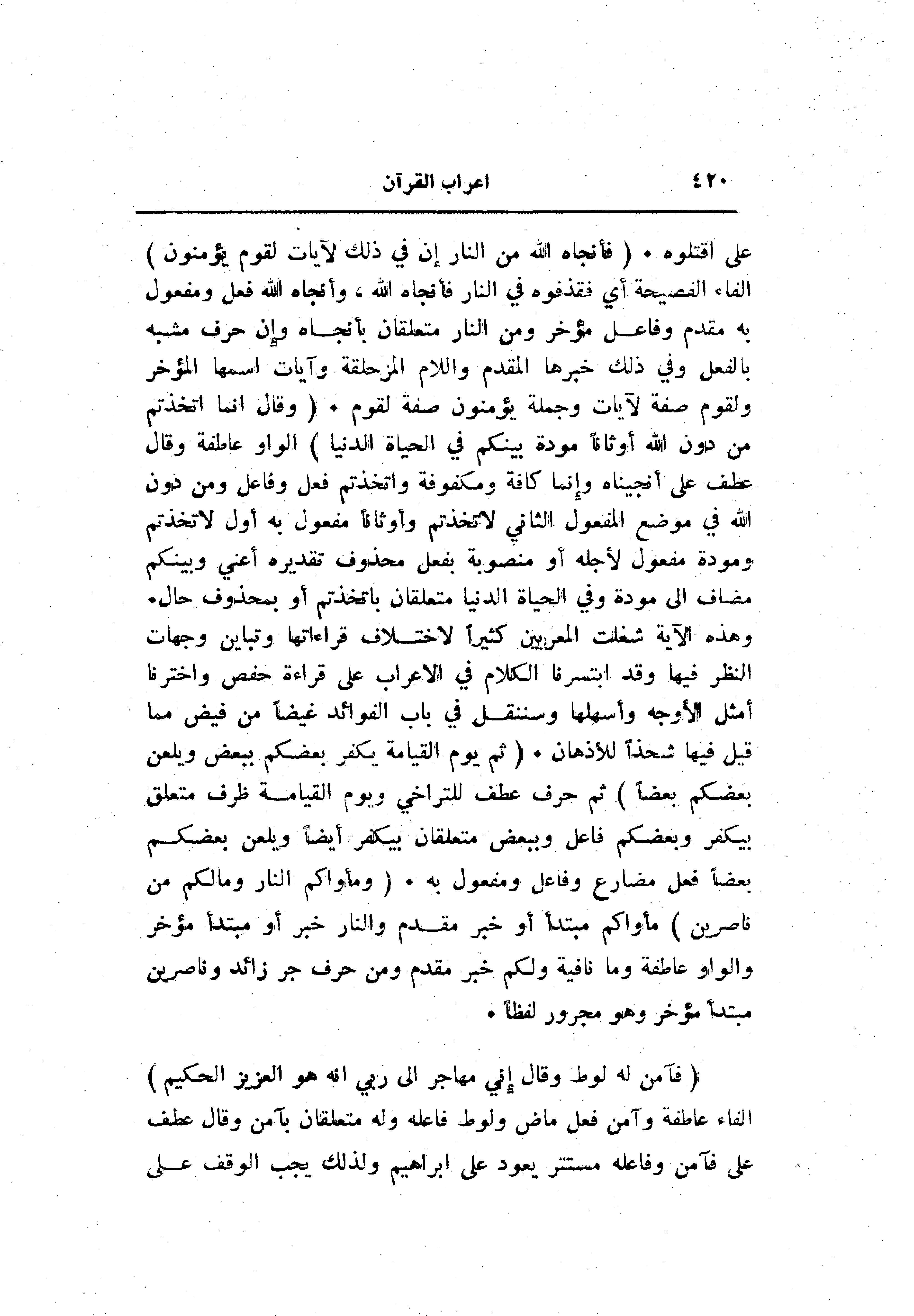 على اقتلوه. (فَأَنْجاهُ اللَّهُ مِنَ النَّارِ إِنَّ فِي ذلِكَ لَآياتٍ لِقَوْمٍ يُؤْمِنُونَ) الفاء الفصيحة أي فقذفوه في النار فأنجاه الله، وأنجاه الله فعل ومفعول به مقدم وفاعل مؤخر ومن النار متعلقان بأنجاه وإن حرف مشبه بالفعل وفي ذلك خبرها المقدم واللام المزحلقة وآيات اسمها المؤخر ولقوم صفة لآيات وجملة يؤمنون صفة لقوم. (وَقالَ إِنَّمَا اتَّخَذْتُمْ مِنْ دُونِ اللَّهِ أَوْثاناً مَوَدَّةَ بَيْنِكُمْ فِي الْحَياةِ الدُّنْيا) الواو عاطفة وقال عطف على أنجيناه وإنما كافة ومكفوفة واتخذتم فعل وفاعل ومن دون الله في موضع المفعول الثاني لاتخذتم وأوثانا مفعول به أول لاتخذتم ومودة مفعول لأجله أو منصوبة بفعل محذوف تقديره أعني وبينكم مضاف الى مودة وفي الحياة الدنيا متعلقان باتخذتم أو بمحذوف حال.