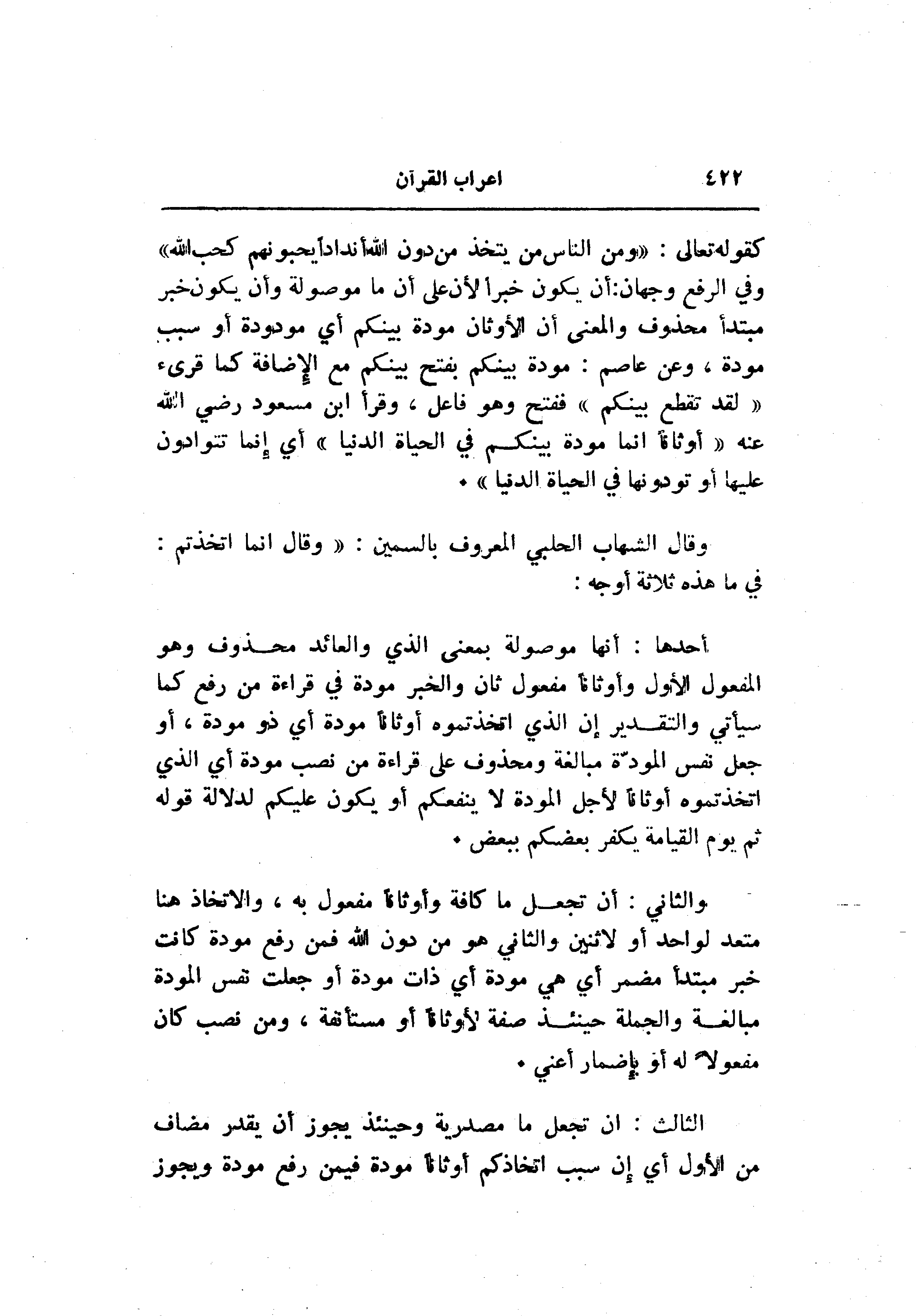 الثالث: ان تجعل ما مصدرية وحينئذ يجوز أن يقدر مضاف من الأول أي إن سبب اتخاذكم أوثانا مودة فيمن رفع مودة ويجوز