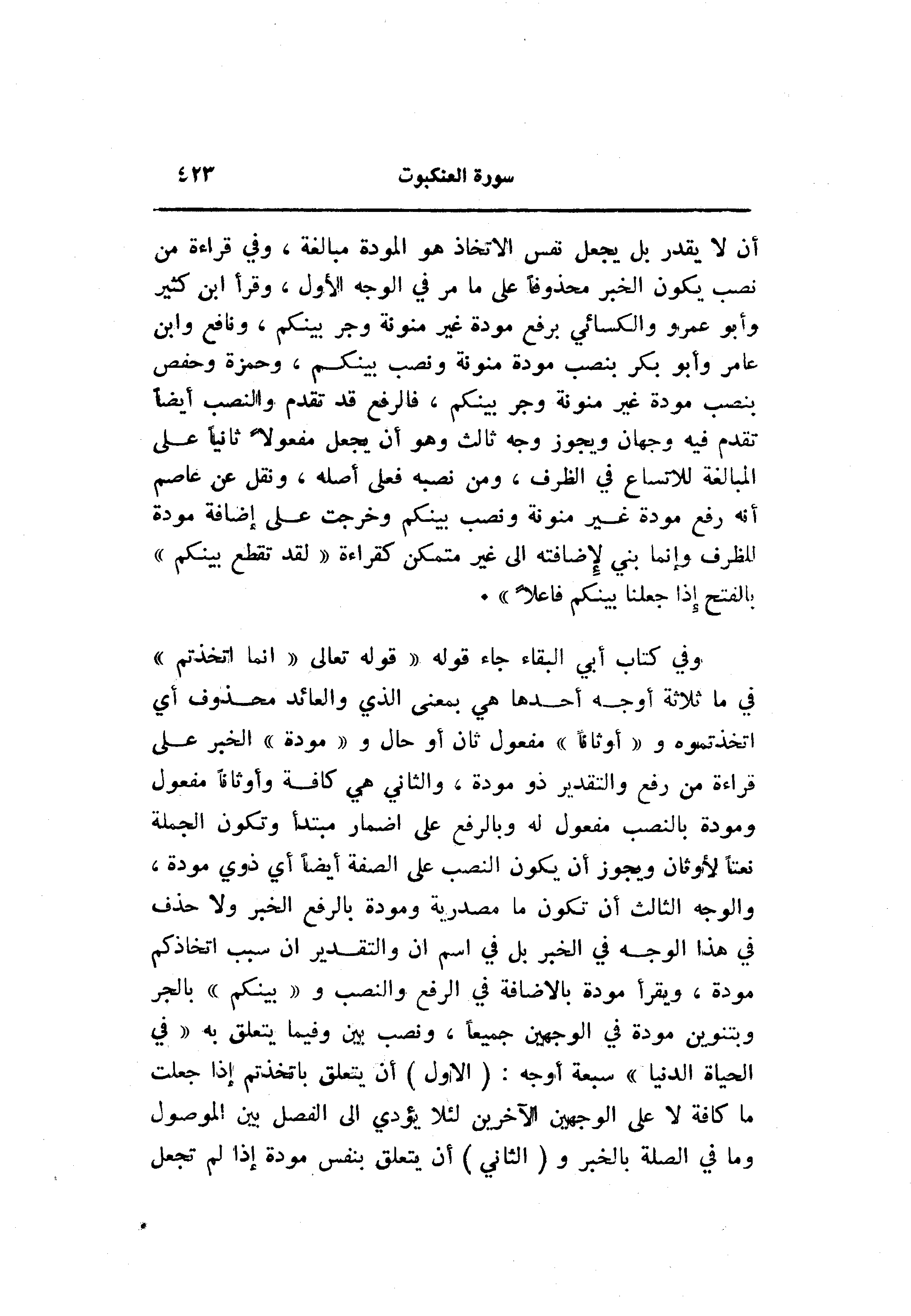 وفي كتاب أبي البقاء جاء قوله «قوله تعالى «انما اتخذتم» في ما ثلاثة أوجه أحدها هي بمعنى الذي والعائد محذوف أي اتخذتموه و «أوثانا» مفعول ثان أو حال و «مودة» الخبر على قراءة من رفع والتقدير ذو مودة، والثاني هي كافة وأوثانا مفعول ومودة بالنصب مفعول له وبالرفع على إضمار مبتدأ وتكون الجملة نعتا لأوثان ويجوز أن يكون النصب على الصفة أيضا أي ذوي مودة، والوجه الثالث أن تكون ما مصدرية ومودة بالرفع الخبر ولا حذف في هذا الوجه في الخبر بل في اسم ان والتقدير ان سبب اتخاذكم مودة، ويقرأ مودة بالاضافة في الرفع والنصب و «بينكم» بالجر وبتنوين مودة في الوجهين جميعا، ونصب بين وفيما يتعلق به «في الحياة الدنيا» سبعة أوجه: (الاول) أن يتعلق باتخذتم إذا جعلت ما كافة لا على الوجهين الآخرين لئلا يؤدي الى الفصل بين الموصول وما في الصلة بالخبر و (الثاني) أن يتعلق بنفس مودة إذا لم تجعل