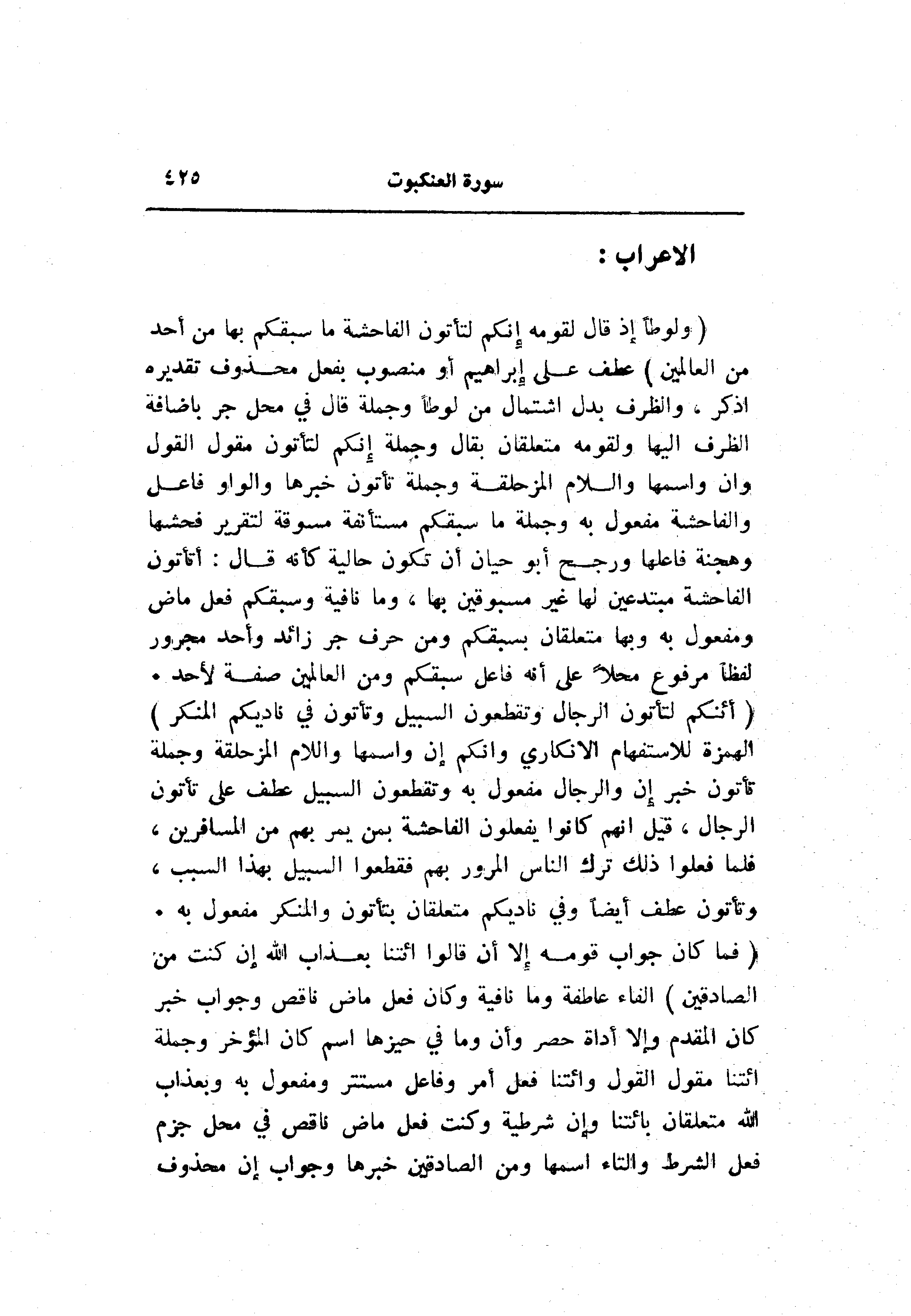 (وَلُوطاً إِذْ قالَ لِقَوْمِهِ إِنَّكُمْ لَتَأْتُونَ الْفاحِشَةَ ما سَبَقَكُمْ بِها مِنْ أَحَدٍ مِنَ الْعالَمِينَ) عطف على إبراهيم أو منصوب بفعل محذوف تقديره اذكر، والظرف بدل اشتمال من لوطا وجملة قال في محل جر باضافة الظرف إليها ولقومه متعلقان بقال وجملة إنكم لتأتون مقول القول وان واسمها واللام المزحلقة وجملة تأتون خبرها والواو فاعل والفاحشة مفعول به وجملة ما سبقكم مستأنفة مسوقة لتقرير فحشها وهجنة فاعلها ورجح أبو حيان أن تكون حالية كأنه قال: أتأتون الفاحشة مبتدعين لها غير مسبوقين بها، وما نافية وسبقكم فعل ماض ومفعول به وبها متعلقان بسبقكم ومن حرف جر زائد وأحد مجرور لفظا مرفوع محلا على أنه فاعل سبقكم ومن العالمين صفة لأحد.