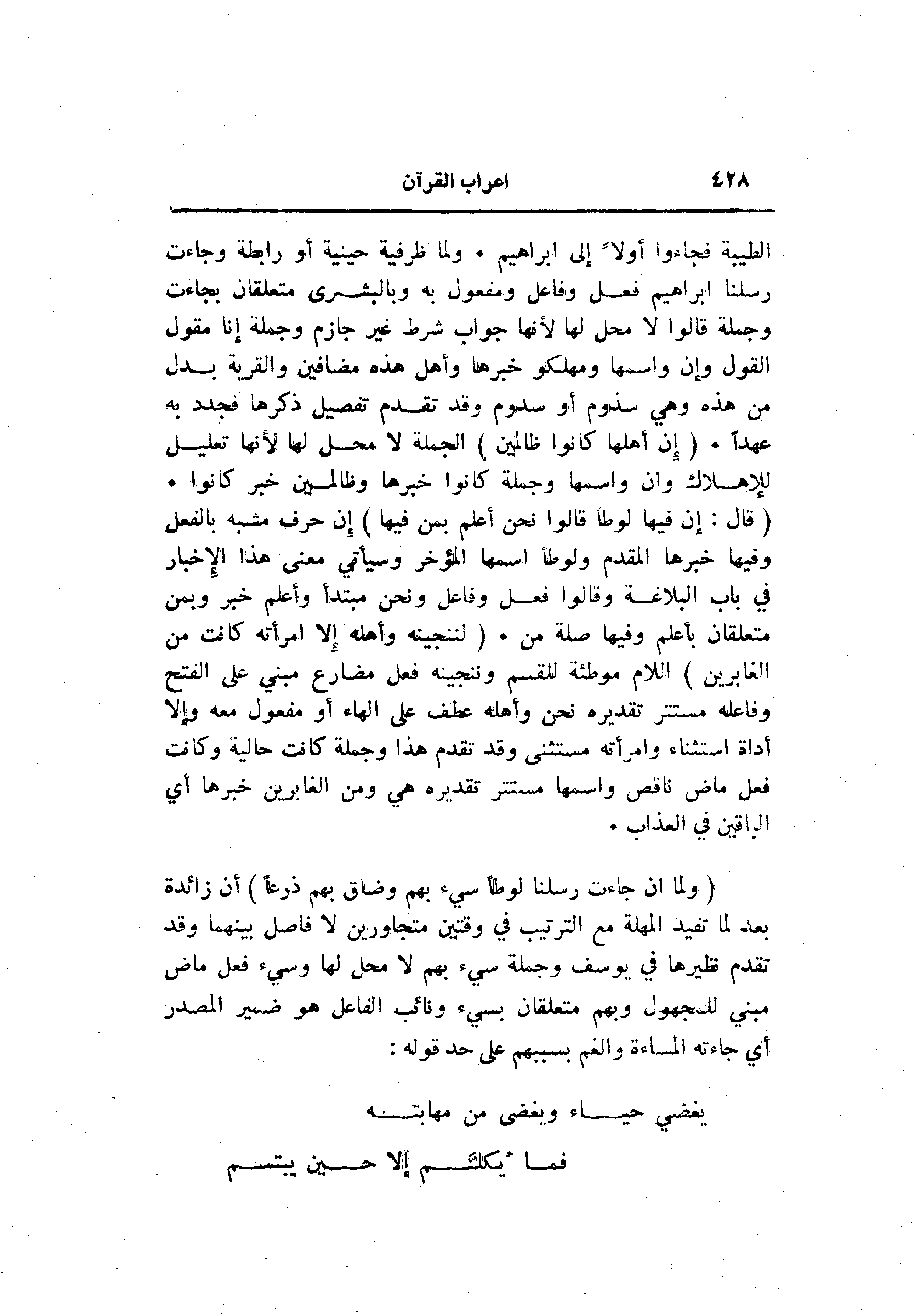 (قالَ: إِنَّ فِيها لُوطاً قالُوا نَحْنُ أَعْلَمُ بِمَنْ فِيها) إن حرف مشبه بالفعل وفيها خبرها المقدم ولوطا اسمها المؤخر وسيأتي معنى هذا الإخبار في باب البلاغة وقالوا فعل وفاعل ونحن مبتدأ وأعلم خبر وبمن متعلقان بأعلم وفيها صلة من. (لَنُنَجِّيَنَّهُ وَأَهْلَهُ إِلَّا امْرَأَتَهُ كانَتْ مِنَ الْغابِرِينَ) اللام موطئة للقسم وننجينه فعل مضارع مبني على الفتح وفاعله مستتر تقديره نحن وأهله عطف على الهاء أو مفعول معه وإلا أداة استثناء وامرأته مستثنى وقد تقدم هذا وجملة كانت حالية وكانت فعل ماض ناقص واسمها مستتر تقديره هي ومن الغابرين خبرها أي الباقين في العذاب.