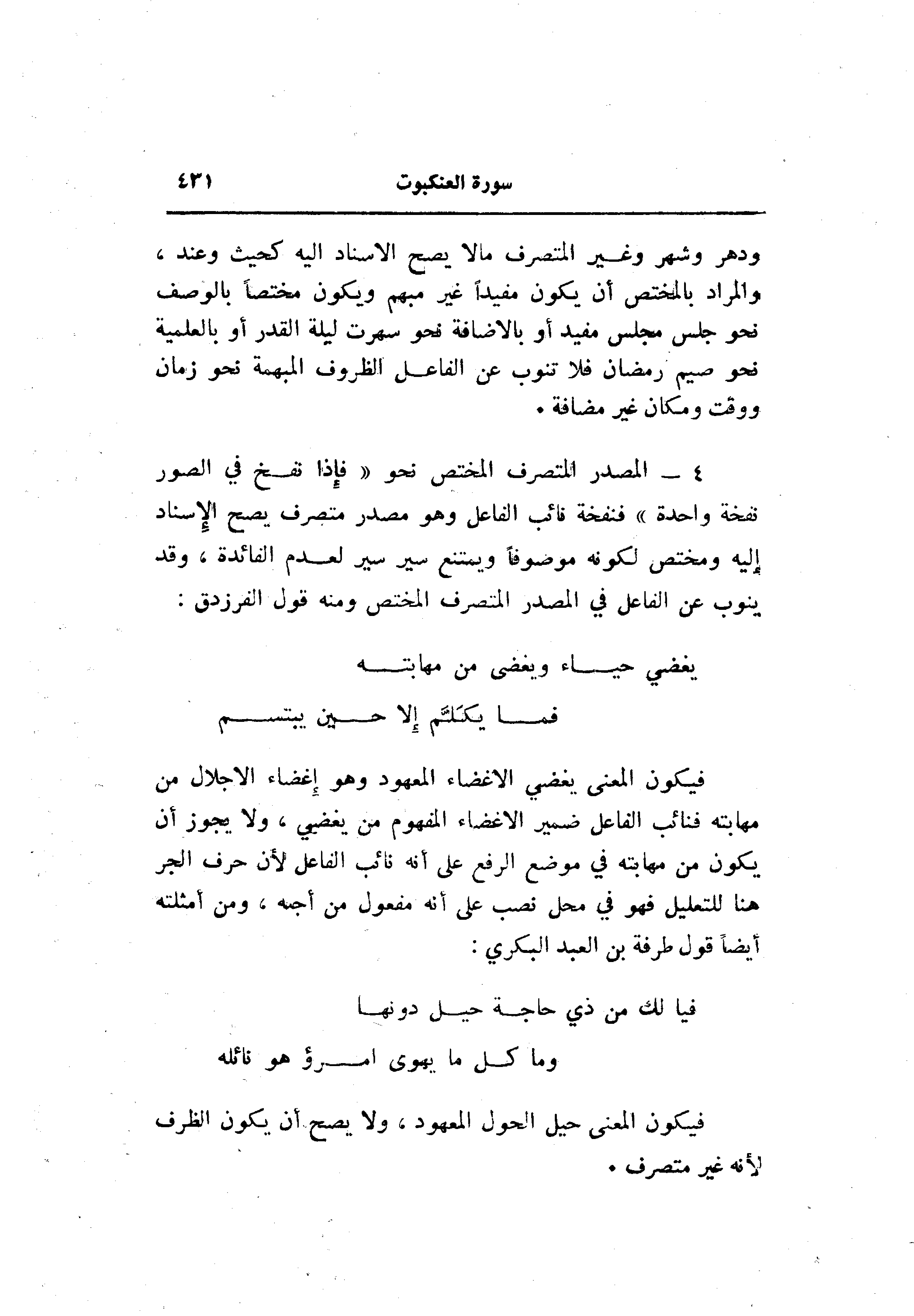 4- المصدر المتصرف المختص نحو «فإذا نفخ في الصور نفخة واحدة» فنفخة نائب الفاعل وهو مصدر متصرف يصح الإسناد إليه ومختص لكونه موصوفا ويمتنع سير سير لعدم الفائدة، وقد ينوب عن الفاعل في المصدر المتصرف المختص ومنه قول الفرزدق:
