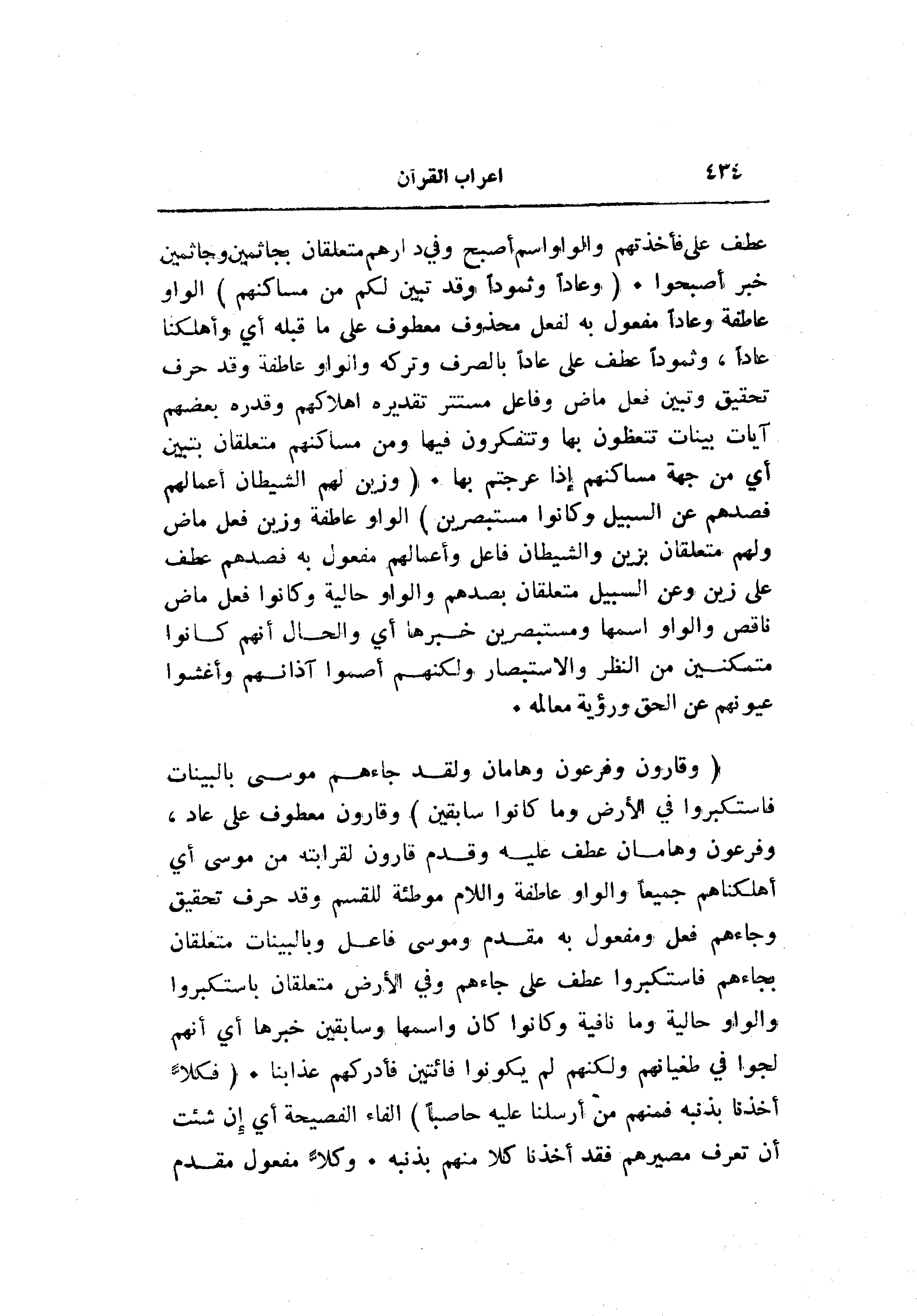 عطف على فأخذتهم والواو اسم أصبح وفي دارهم متعلقان بجاثمين وجاثمين خبر أصبحوا. (وَعاداً وَثَمُودَ وَقَدْ تَبَيَّنَ لَكُمْ مِنْ مَساكِنِهِمْ) الواو عاطفة وعادا مفعول به لفعل محذوف معطوف على ما قبله أي وأهلكنا عادا، وثمودا عطف على عادا بالصرف وتركه والواو عاطفة وقد حرف تحقيق وتبين فعل ماض وفاعل مستتر تقديره إهلاكهم وقدره بعضهم آيات بينات تتعظون بها وتتفكرون فيها ومن مساكنهم متعلقان بتبين أي من جهة مساكنهم إذا عرجتم بها. (وَزَيَّنَ لَهُمُ الشَّيْطانُ أَعْمالَهُمْ فَصَدَّهُمْ عَنِ السَّبِيلِ وَكانُوا مُسْتَبْصِرِينَ) الواو عاطفة وزين فعل ماض ولهم متعلقان بزين والشيطان فاعل وأعمالهم مفعول به فصدهم عطف على زين وعن السبيل متعلقان بصدهم والواو حالية وكانوا فعل ماض ناقص والواو اسمها ومستبصرين خبرها أي والحال أنهم كانوا متمكنين من النظر والاستبصار ولكنهم أصموا آذانهم وأغشوا عيونهم عن الحق ورؤية معالمه.