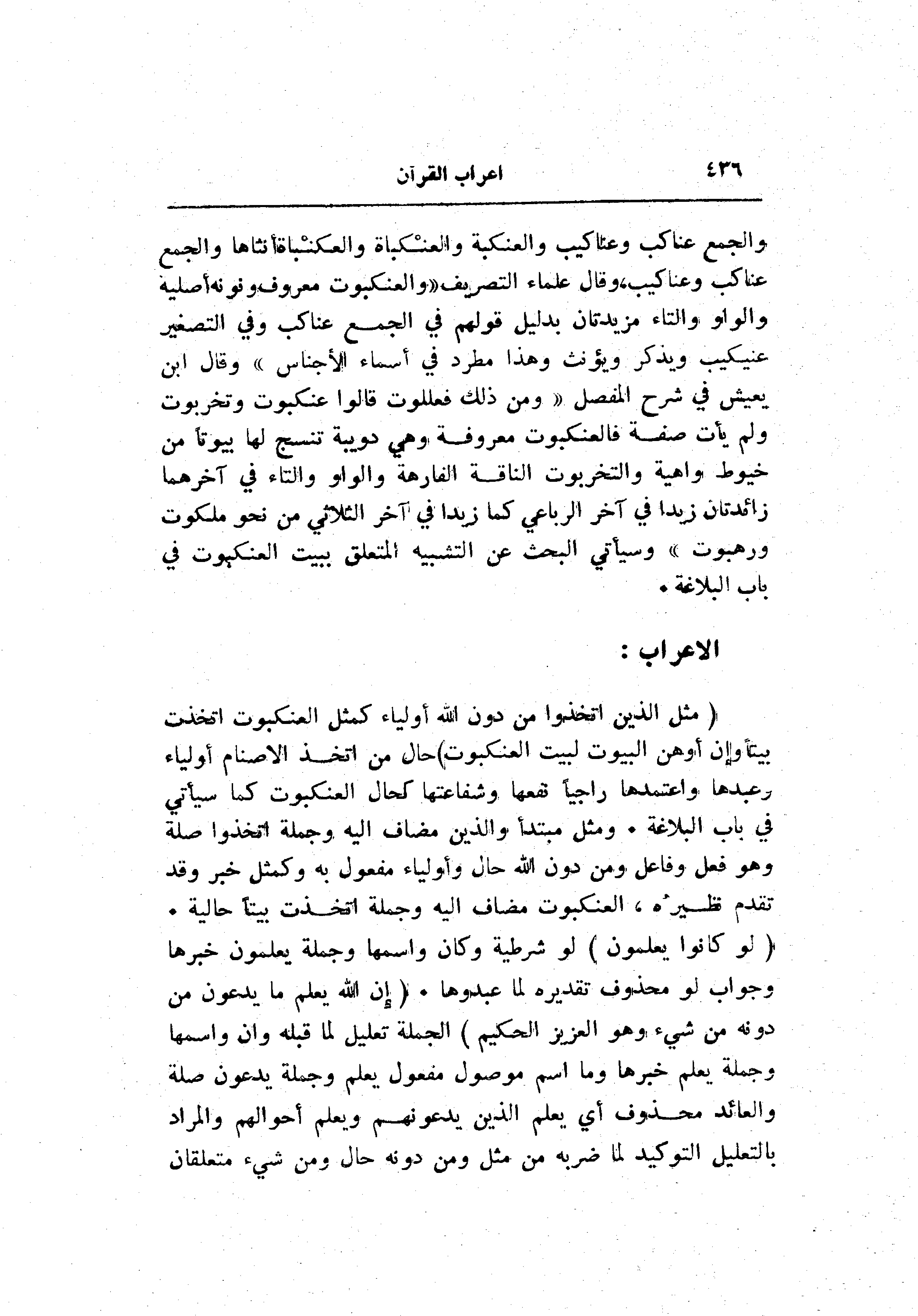 (مَثَلُ الَّذِينَ اتَّخَذُوا مِنْ دُونِ اللَّهِ أَوْلِياءَ كَمَثَلِ الْعَنْكَبُوتِ اتَّخَذَتْ بَيْتاً وَإِنَّ أَوْهَنَ الْبُيُوتِ لَبَيْتُ الْعَنْكَبُوتِ) حال من اتخذ الأصنام أولياء وعبدها واعتمدها راجيا نفعها وشفاعتها كحال العنكبوت كما سيأتي في باب البلاغة. ومثل مبتدأ والذين مضاف اليه وجملة اتخذوا صلة وهو فعل وفاعل ومن دون الله حال وأولياء مفعول به وكمثل خبر وقد تقدم نظيره، العنكبوت مضاف اليه وجملة اتخذت بيتا حالية.