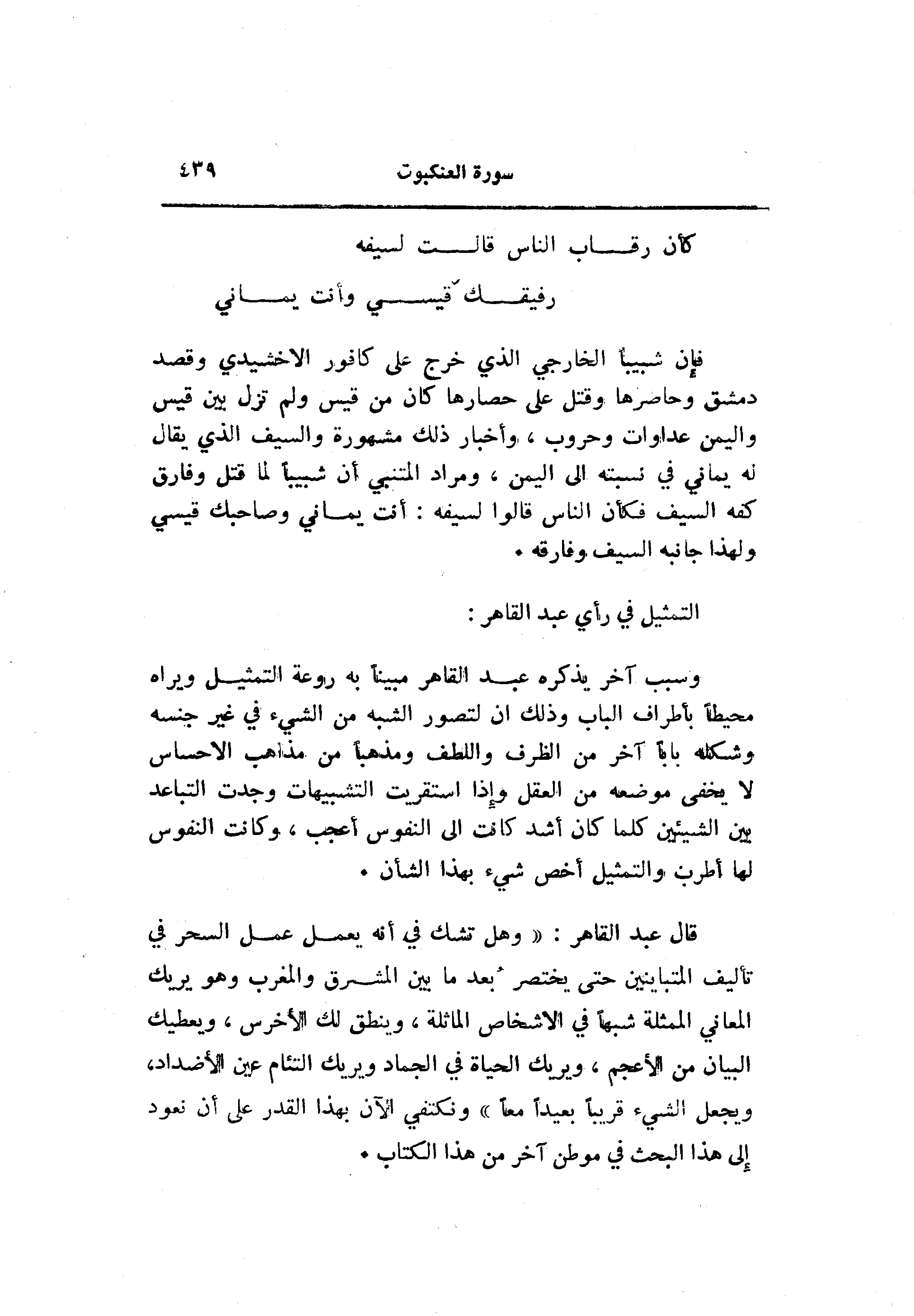 قال عبد القاهر: «وهل تشك في أنه يعمل عمل السحر في تأليف المتباينين حتى يختصر بعد ما بين المشرق والمغرب وهو يريك المعاني الممثلة شبها في الاشخاص الماثلة، وينطق لك الأخرس، ويعطيك البيان من الأعجم، ويريك الحياة في الجماد ويريك التئام عين الأضداد، ويجعل الشيء قريبا بعيدا معا» ونكتفي الآن بهذا القدر على أن نعود إلى هذا البحث في موطن آخر من هذا الكتاب.