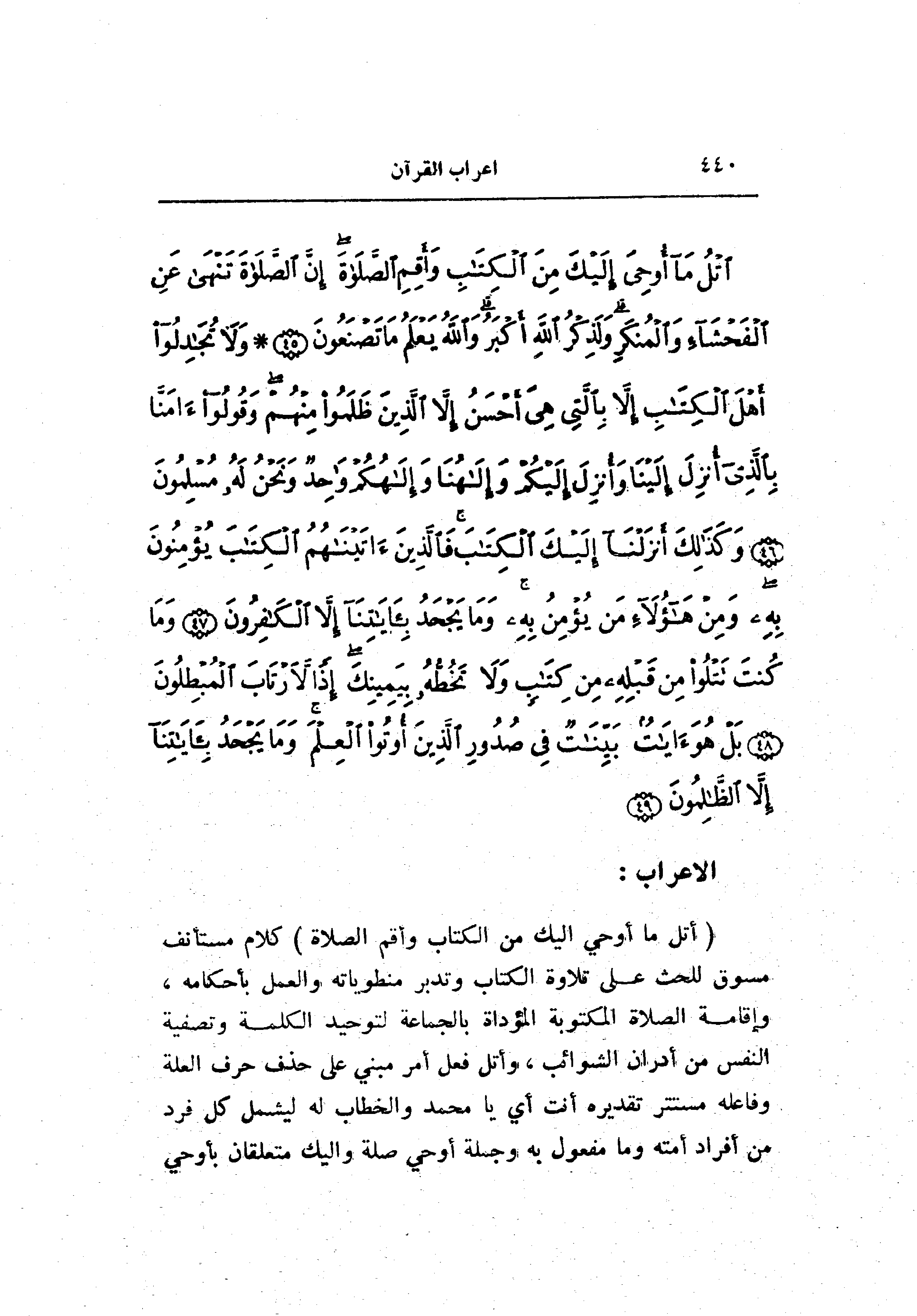 (اتْلُ ما أُوحِيَ إِلَيْكَ مِنَ الْكِتابِ وَأَقِمِ الصَّلاةَ) كلام مستأنف مسوق للحث على تلاوة الكتاب وتدبر منطوياته والعمل بأحكامه، وإقامة الصلاة المكتوبة المؤداة بالجماعة لتوحيد الكلمة وتصفية النفس من أدران الشوائب، وأتل فعل أمر مبني على حذف حرف العلة وفاعله مستتر تقديره أنت أي يا محمد والخطاب له ليشمل كل فرد من أفراد أمته وما مفعول به وجملة أوحي صلة وإليك متعلقان بأوحي