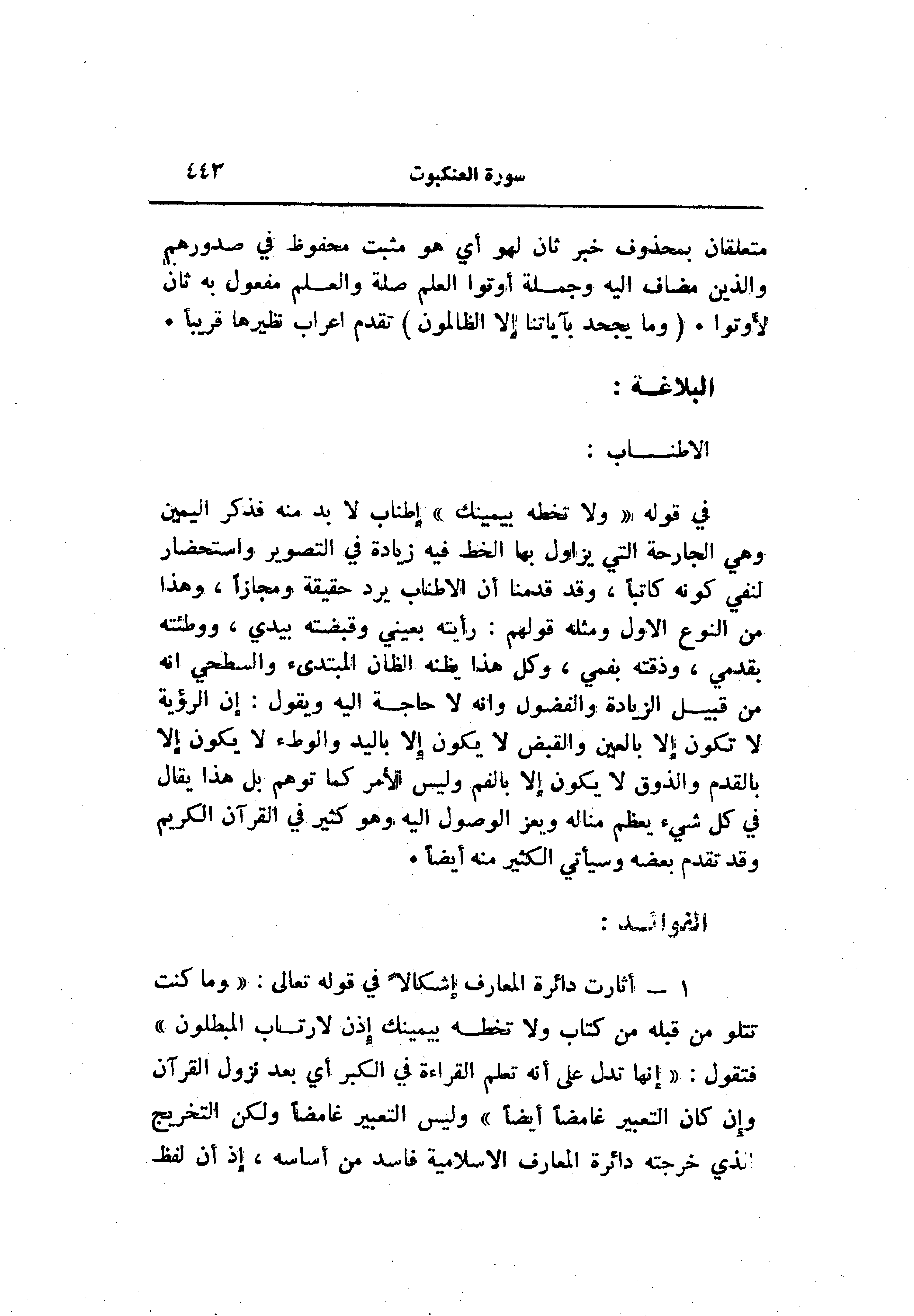 في قوله «ولا تخطه بيمينك» إطناب لا بد منه فذكر اليمين وهي الجارحة التي يزاول بها الخط فيه زيادة في التصوير واستحضار لنفي كونه كاتبا، وقد قدمنا أن الاطناب يرد حقيقة ومجازا، وهذا من النوع الاول ومثله قولهم: رأيته بعيني وقبضته بيدي، ووطئته بقدمي، وذقته بفمي، وكل هذا يظنه الظان المبتدئ والسطحي انه من قبيل الزيادة والفضول وانه لا حاجة اليه ويقول: إن الرؤية لا تكون إلا بالعين والقبض لا يكون إلا باليد والوطء لا يكون إلا بالقدم والذوق لا يكون إلا بالفم وليس الأمر كما توهم بل هذا يقال في كل شيء يعظم مناله ويعز الوصول اليه وهو كثير في القرآن الكريم وقد تقدم بعضه وسيأتي الكثير منه أيضا.