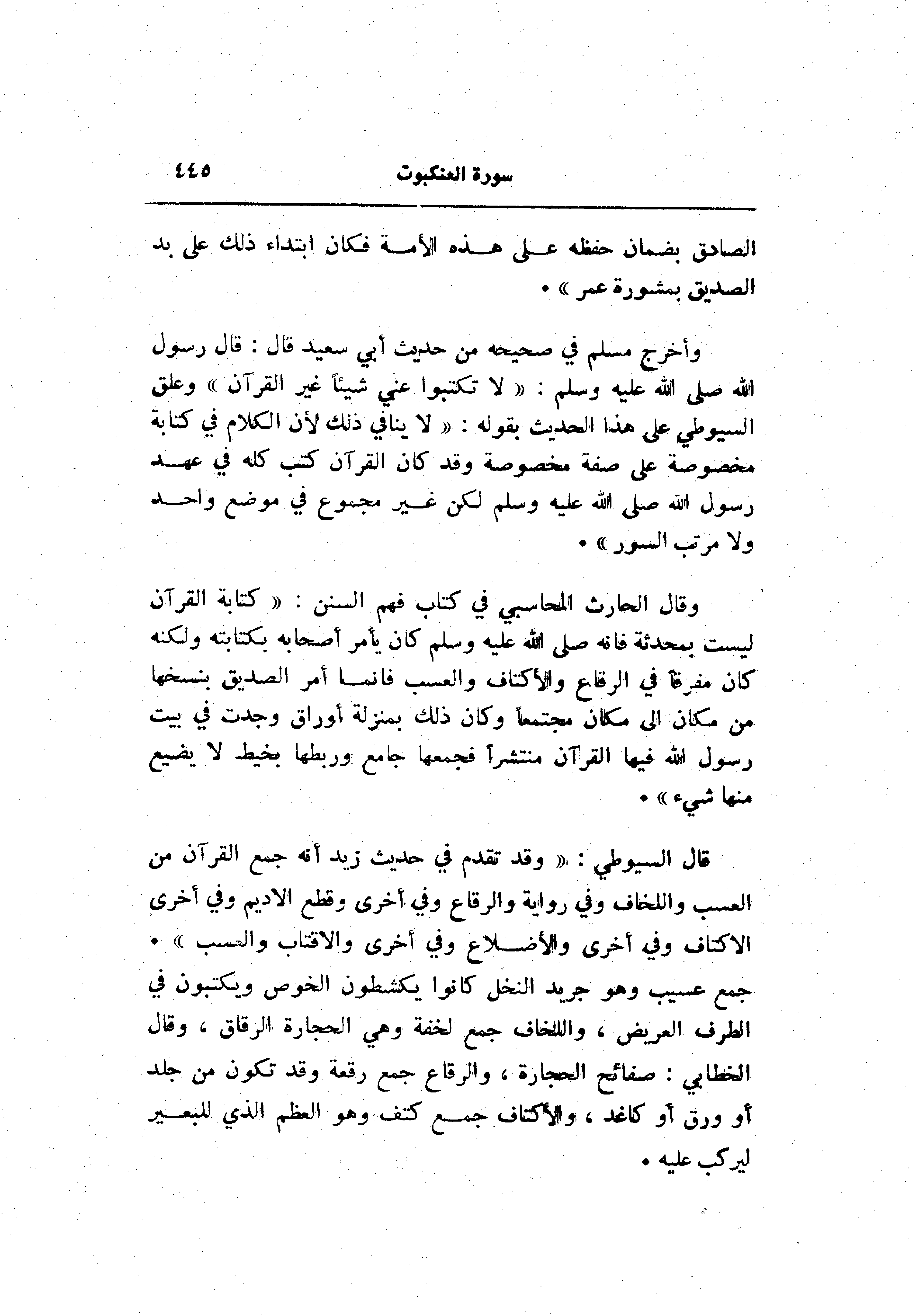 وأخرج مسلم في صحيحه من حديث أبي سعيد قال: قال رسول الله صلى الله عليه وسلم: «لا تكتبوا عني شيئا غير القرآن» وعلق السيوطي على هذا الحديث بقوله: «لا ينا في ذلك لأن الكلام في كتابة مخصوصة على صفة مخصوصة وقد كان القرآن كتب كله في عهد رسول الله صلى الله عليه وسلم لكن غير مجموع في موضع واحد ولا مرتب السور» .