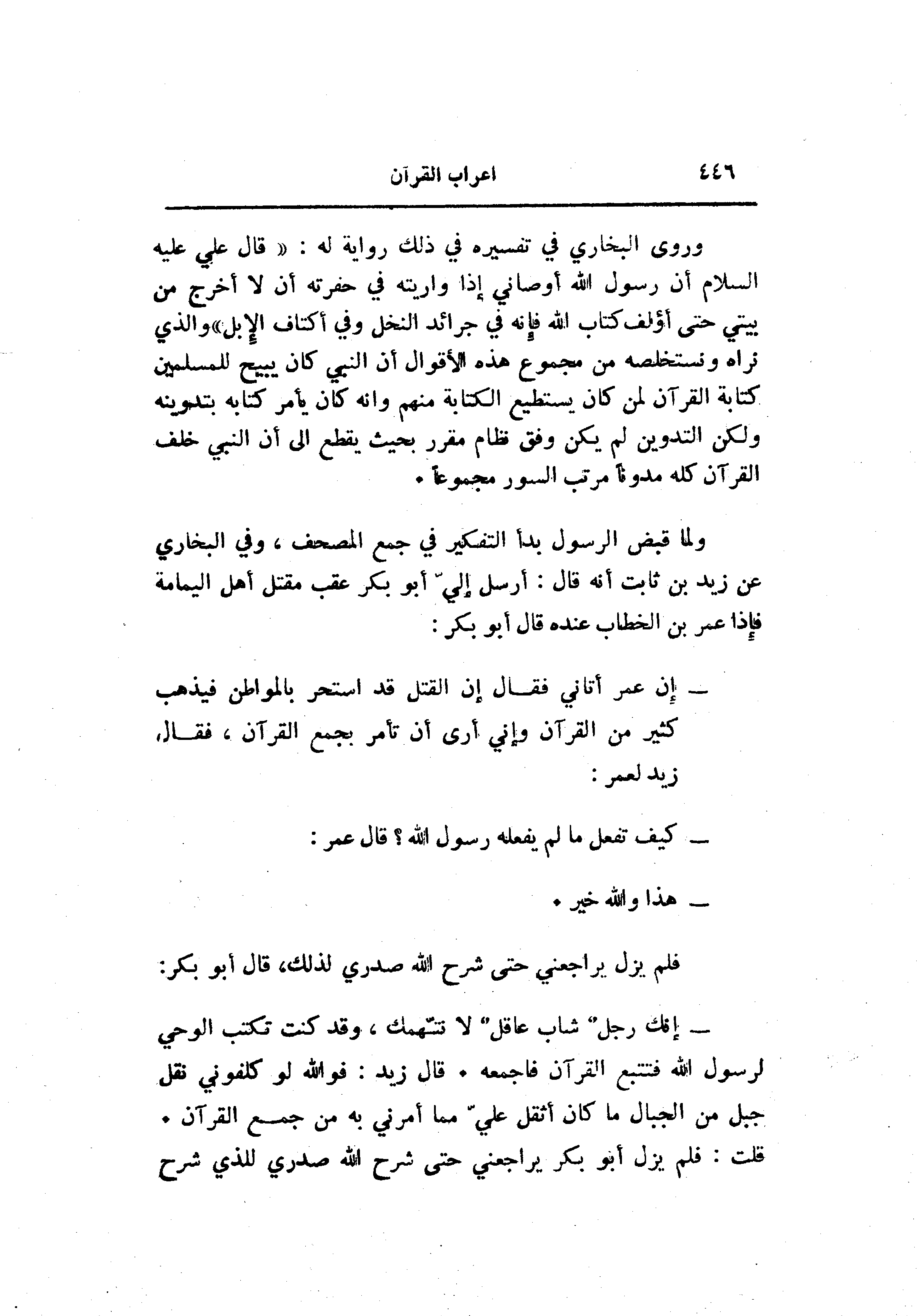 - إن عمر أتاني فقال إن القتل قد استحر بالمواطن فيذهب كثير من القرآن وإني أرى أن تأمر بجمع القرآن، فقال زيد لعمر:
