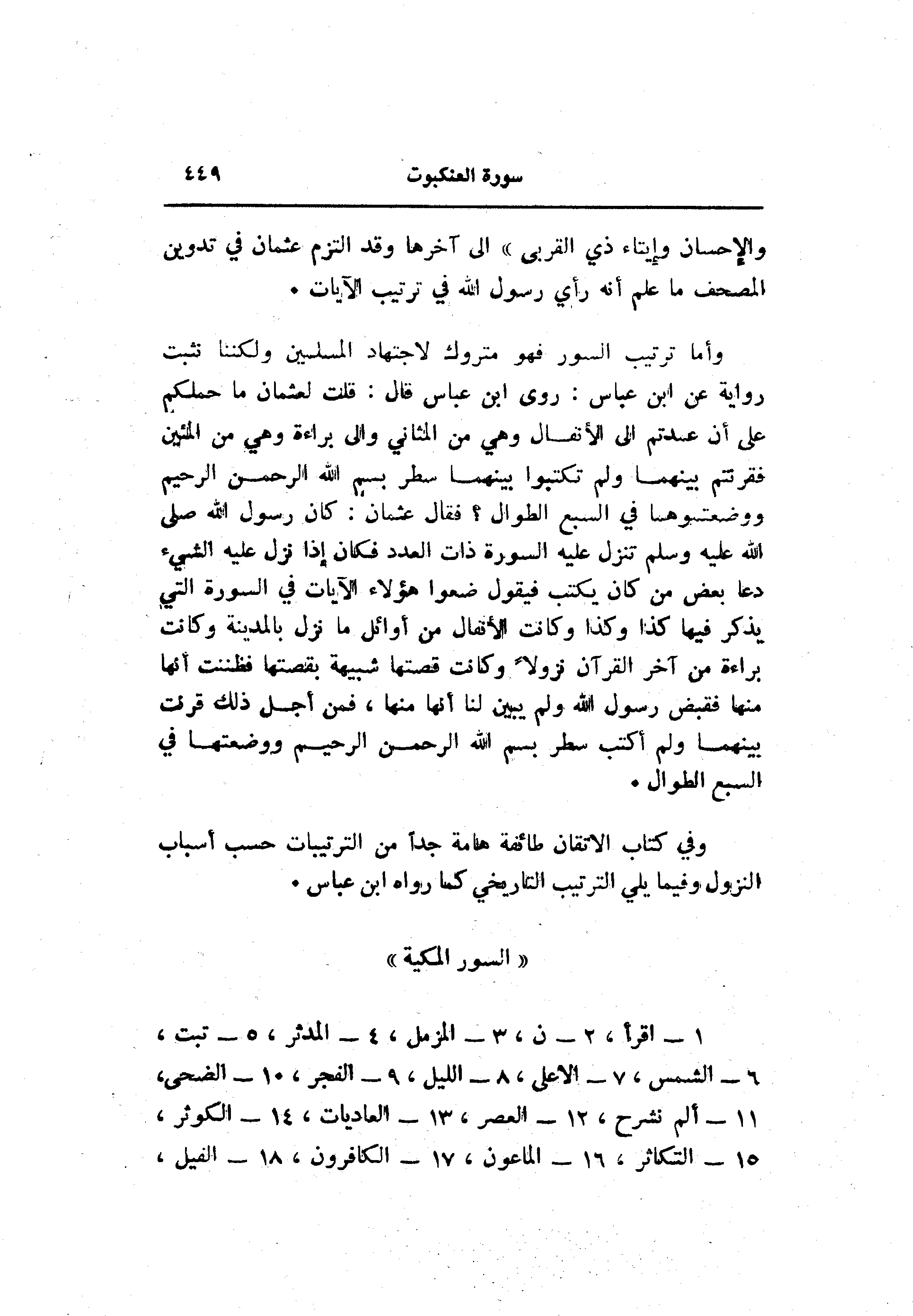 وفي كتاب الإتقان طائفة هامة جدا من الترتيبات حسب أسباب النزول وفيما يلي الترتيب التاريخي كما رواه ابن عباس.