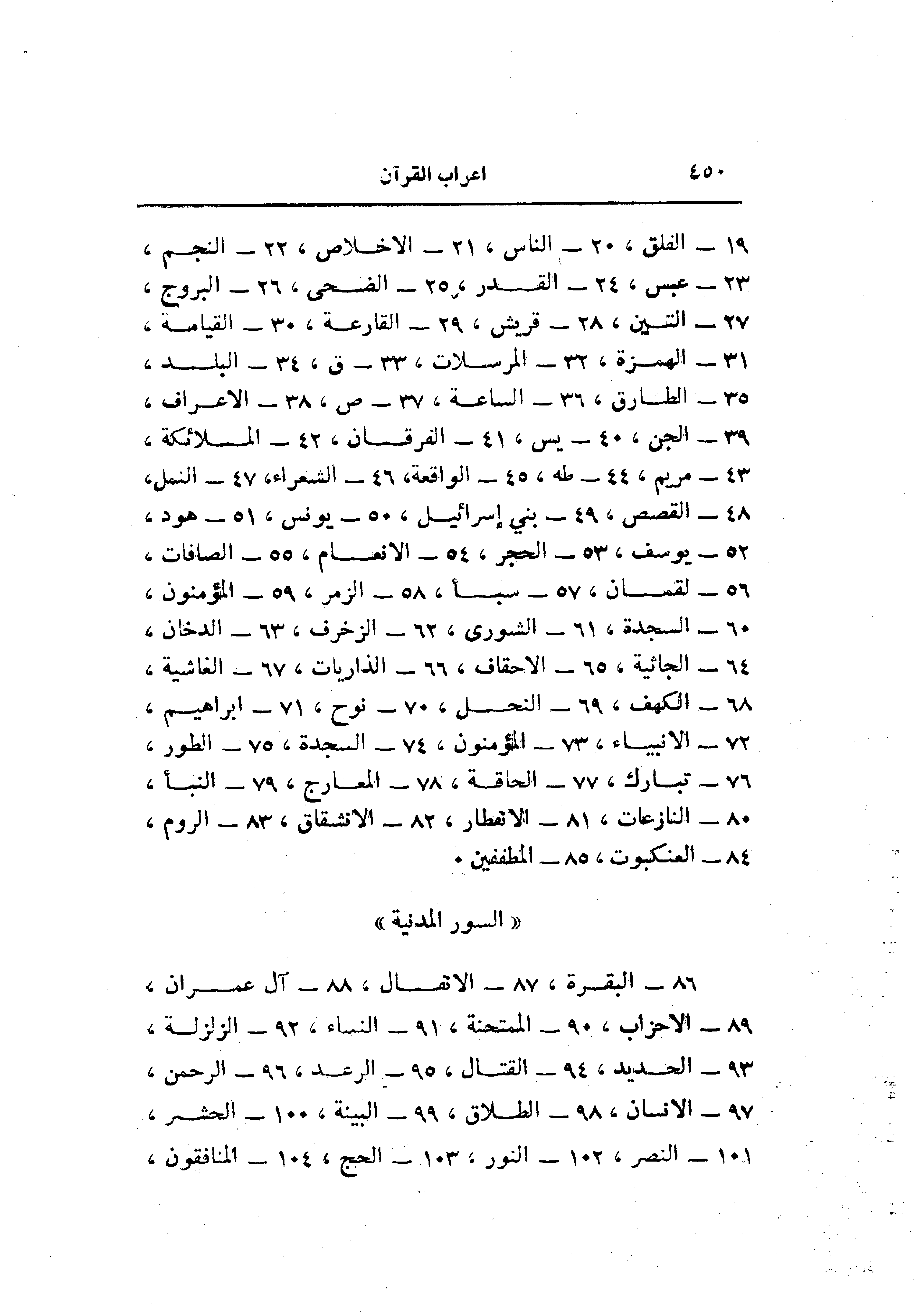 19- الفلق، 20- الناس، 21- الإخلاص، 22- النجم، 23- عبس، 24- القدر، 25- الضحى، 26- البروج، 27- التين، 28- قريش، 29- القارعة، 30- القيامة، 31- الهمزة، 32- المرسلات، 33- ق، 34- البلد، 35- الطارق، 36- الساعة، 37- ص، 38- الأعراف، 39- الجن، 40- يس، 41- الفرقان، 42- الملائكة، 43- مريم، 44- طه، 45- الواقعة، 46- الشعراء، 47- النمل، 48- القصص، 49- بني إسرائيل، 50- يونس، 51- هود، 52- يوسف، 53- الحجر، 54- الانعام، 55- الصافات، 56- لقمان، 57- سبأ، 58- الزمر، 59- المؤمنون، 60- السجدة، 61- الشورى، 62- الزخرف، 63- الدخان، 64- الجاثية، 65- الأحقاف، 66- الذاريات، 67- الغاشية، 68- الكهف، 69- النحل، 70- نوح، 71- ابراهيم، 72- الأنبياء، 73- المؤمنون، 74- السجدة، 75- الطور، 76- تبارك، 77- الحاقة، 78- المعارج، 79- النبأ، 80- النازعات، 81- الانفطار، 82- الانشقاق، 83- الروم، 84- العنكبوت، 85- المطففين.