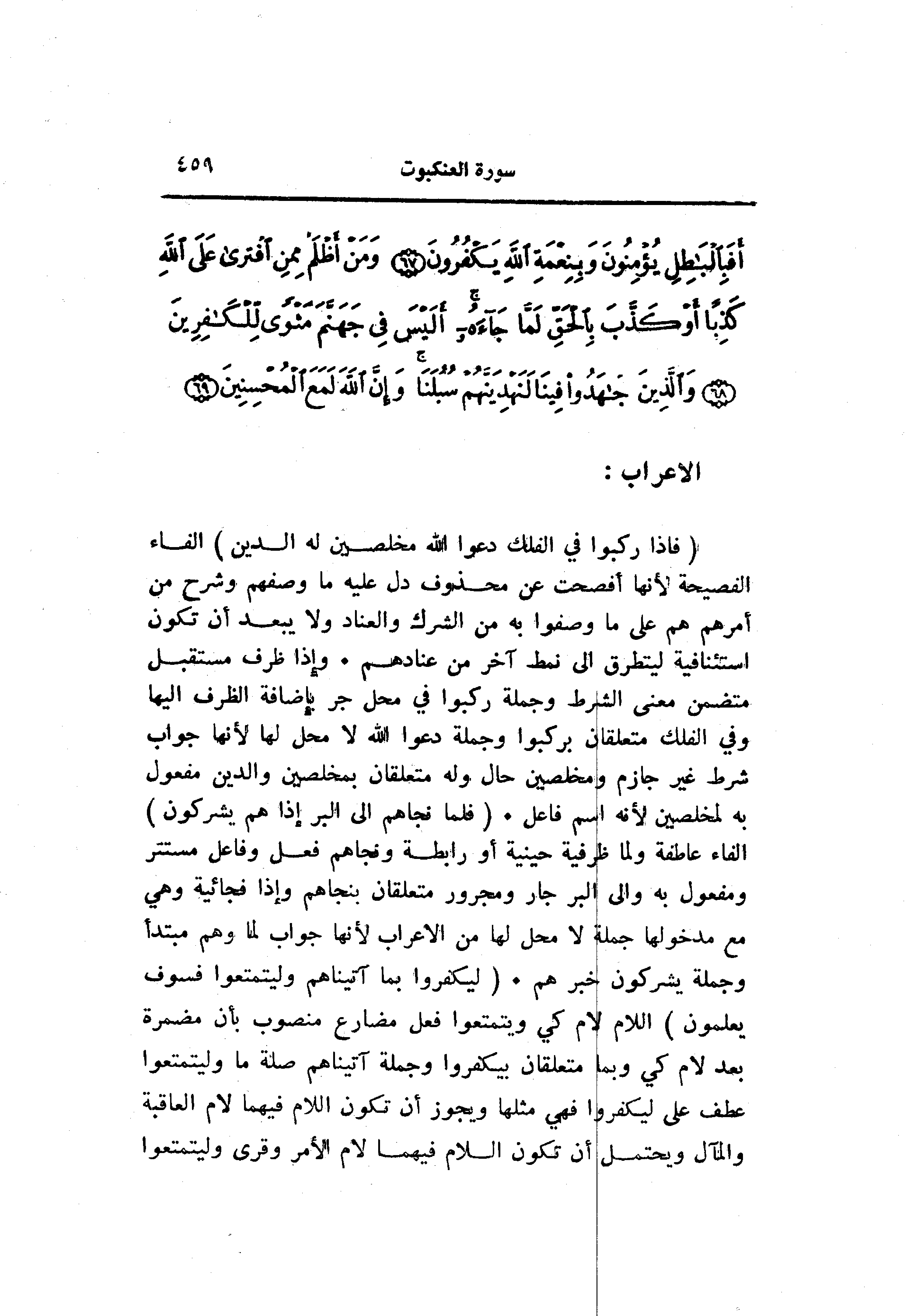 (فَإِذا رَكِبُوا فِي الْفُلْكِ دَعَوُا اللَّهَ مُخْلِصِينَ لَهُ الدِّينَ) الفاء الفصيحة لأنها أفصحت عن محذوف دل عليه ما وصفهم وشرح من أمرهم هم على ما وصفوا به من الشرك والعناد ولا يبعد أن تكون استئنافية ليتطرق الى نمط آخر من عنادهم. وإذا ظرف مستقبل متضمن معنى الشرط وجملة ركبوا في محل جر بإضافة الظرف إليها وفي الفلك متعلقان بركبوا وجملة دعوا الله لا محل لها لأنها جواب شرط غير جازم ومخلصين حال وله متعلقان بمخلصين والدين مفعول به لمخلصين لأنه اسم فاعل. (فَلَمَّا نَجَّاهُمْ إِلَى الْبَرِّ إِذا هُمْ يُشْرِكُونَ) الفاء عاطفة ولما ظرفية حينية أو رابطة ونجاهم فعل وفاعل مستتر ومفعول به والى البر جار ومجرور متعلقان بنجاهم وإذا فجائية وهي مع مدخولها جملة لا محل لها من الإعراب لأنها جواب لما وهم مبتدأ وجملة يشركون خبر هم. (لِيَكْفُرُوا بِما آتَيْناهُمْ وَلِيَتَمَتَّعُوا فَسَوْفَ يَعْلَمُونَ) اللام لام كي ويتمتعوا فعل مضارع منصوب بأن مضمرة بعد لام كي وبما متعلقان بيكفروا وجملة آتيناهم صلة ما وليتمتعوا عطف على ليكفروا فهي مثلها ويجوز أن تكون اللام فيهما لام العاقبة والمآل ويحتمل أن تكون اللام فيهما لام الأمر وقرى وليتمتعوا