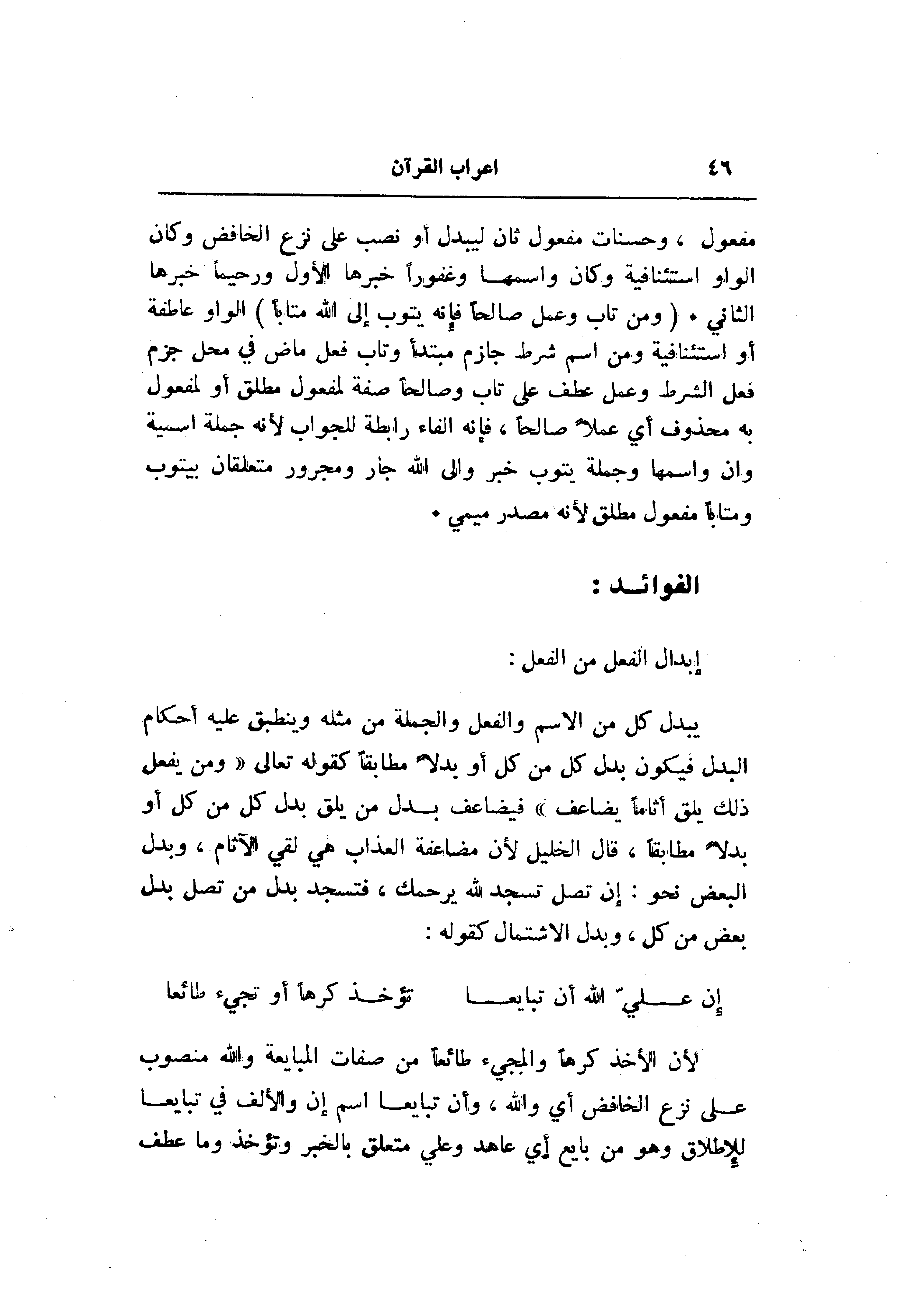 يبدل كل من الاسم والفعل والجملة من مثله وينطبق عليه أحكام البدل فيكون بدل كل من كل أو بدلا مطابقا كقوله تعالى «ومن يفعل ذلك يلق أثاما يضاعف» فيضاعف بدل من يلق بدل كل من كل أو بدلا مطابقا، قال الخليل لأن مضاعفة العذاب هي لقي الآثام، وبدل البعض نحو: إن تصل تسجد لله يرحمك، فتسجد بدل من تصل بدل بعض من كل، وبدل الاشتمال كقوله:
