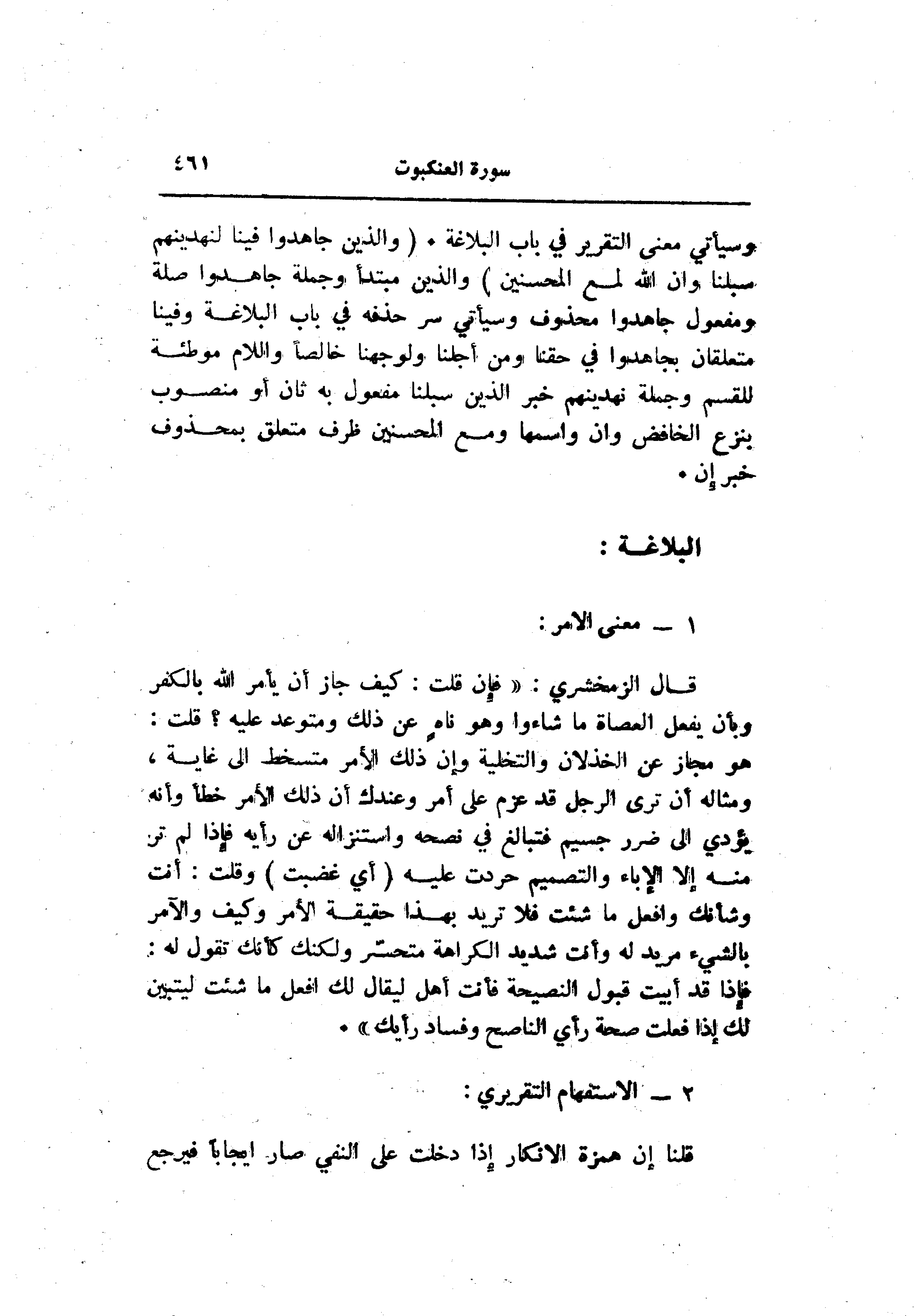 وسيأتي معنى التقرير في باب البلاغة. (وَالَّذِينَ جاهَدُوا فِينا لَنَهْدِيَنَّهُمْ سُبُلَنا وَإِنَّ اللَّهَ لَمَعَ الْمُحْسِنِينَ) والذين مبتدأ وجملة جاهدوا صلة ومفعول جاهدوا محذوف وسيأتي سر حذفه في باب البلاغة وفينا متعلقان بجاهدوا في حقنا ومن أجلنا ولو جهنا خالصا واللام موطئة للقسم وجملة نهدينهم خبر الذين سبلنا مفعول به ثان أو منصوب بنزع الخافض وان واسمها ومع المحسنين ظرف متعلق بمحذوف خبر إن.