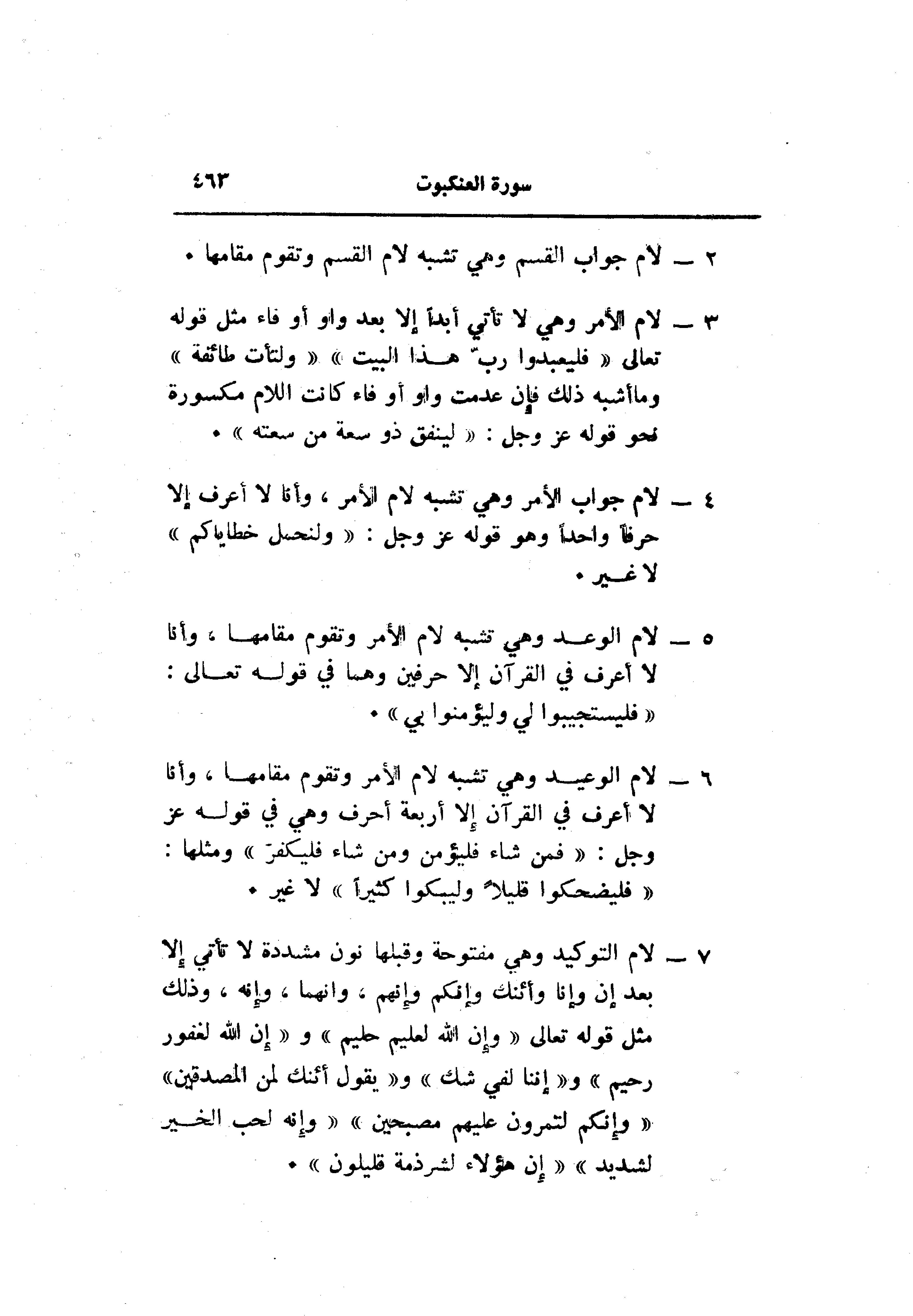 7- لام التوكيد وهي مفتوحة وقبلها نون مشددة لا تأتي إلا بعد إن وإنا وأ إنك وإنكم وإنهم، وانهما، وإنه، وذلك مثل قوله تعالى «وإن الله لعليم حليم» و «إن الله لغفور رحيم» و «إننا لفي شك» و «يقول أإنك لمن المصدقين» «وإنكم لتمرون عليهم مصبحين» «وإنه لحب الخير لشديد» «إن هؤلاء لشرذمة قليلون» .