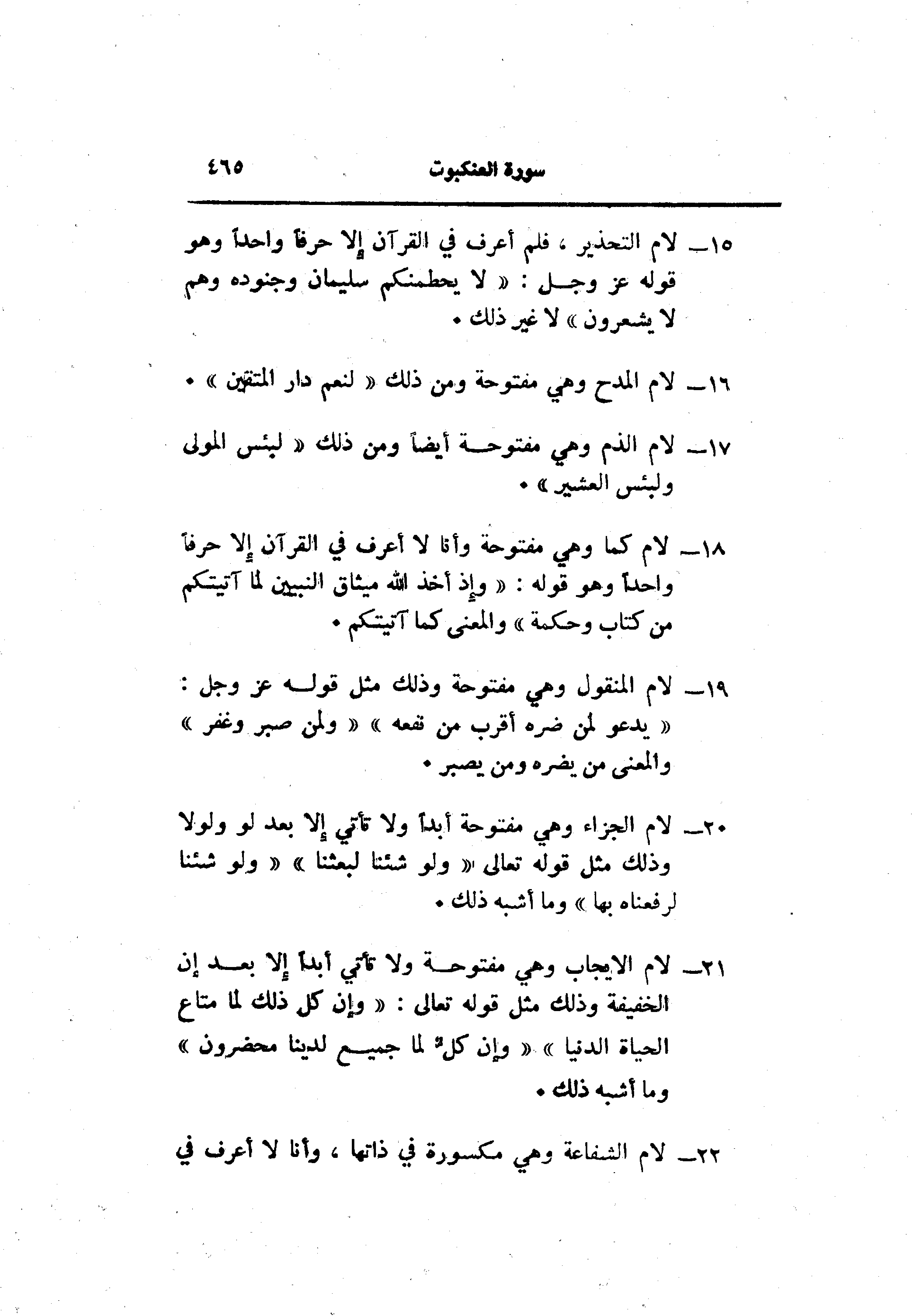 15- لام التحذير، فلم أعرف في القرآن إلا حرفا واحدا وهو قوله عز وجل: «لا يحطمنكم سليمان وجنوده وهم لا يشعرون» لا غير ذلك.