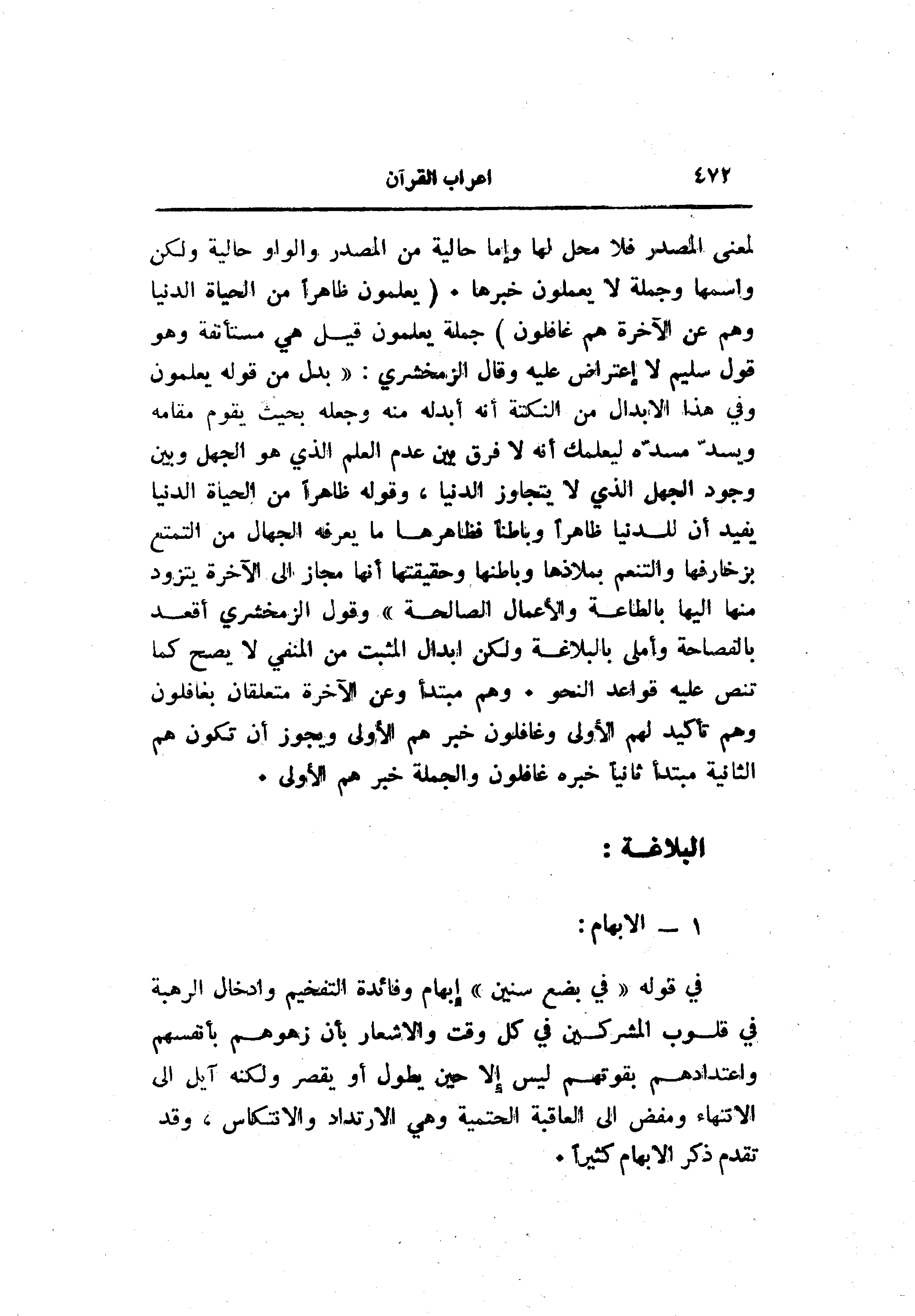 لمعنى المصدر فلا محل لها وإما حالية من المصدر والواو حالية ولكن واسمها وجملة لا يعملون خبرها. (يَعْلَمُونَ ظاهِراً مِنَ الْحَياةِ الدُّنْيا وَهُمْ عَنِ الْآخِرَةِ هُمْ غافِلُونَ) جملة يعلمون قيل هي مستأنفة وهو قول سليم لا اعتراض عليه وقال الزمخشري: «بدل من قوله يعلمون وفي هذا الابدال من النكتة أنه أبدله منه وجعله بحيث يقوم مقامه ويسدّ مسدّه ليعلمك أنه لا فرق بين عدم العلم الذي هو الجهل وبين وجود الجهل الذي لا يتجاوز الدنيا، وقوله ظاهرا من الحياة الدنيا يفيد أن للدنيا ظاهرا وباطنا فظاهرها ما يعرفه الجهال من التمتع بزخارفها والتنعم بملاذها وباطنها وحقيقتها أنها مجاز الى الآخرة يتزود منها إليها بالطاعة والأعمال الصالحة» وقول الزمخشري أقعد بالفصاحة وأملى بالبلاغة ولكن ابدال المثبت من المنفي لا يصح كما تنص عليه قواعد النحو. وهم مبتدأ وعن الآخرة متعلقان بغافلون وهم تأكيد لهم الأولى وغافلون خبرهم الأولى ويجوز أن تكون هم الثانية مبتدأ ثانيا خبره غافلون والجملة خبر هم الأولى.