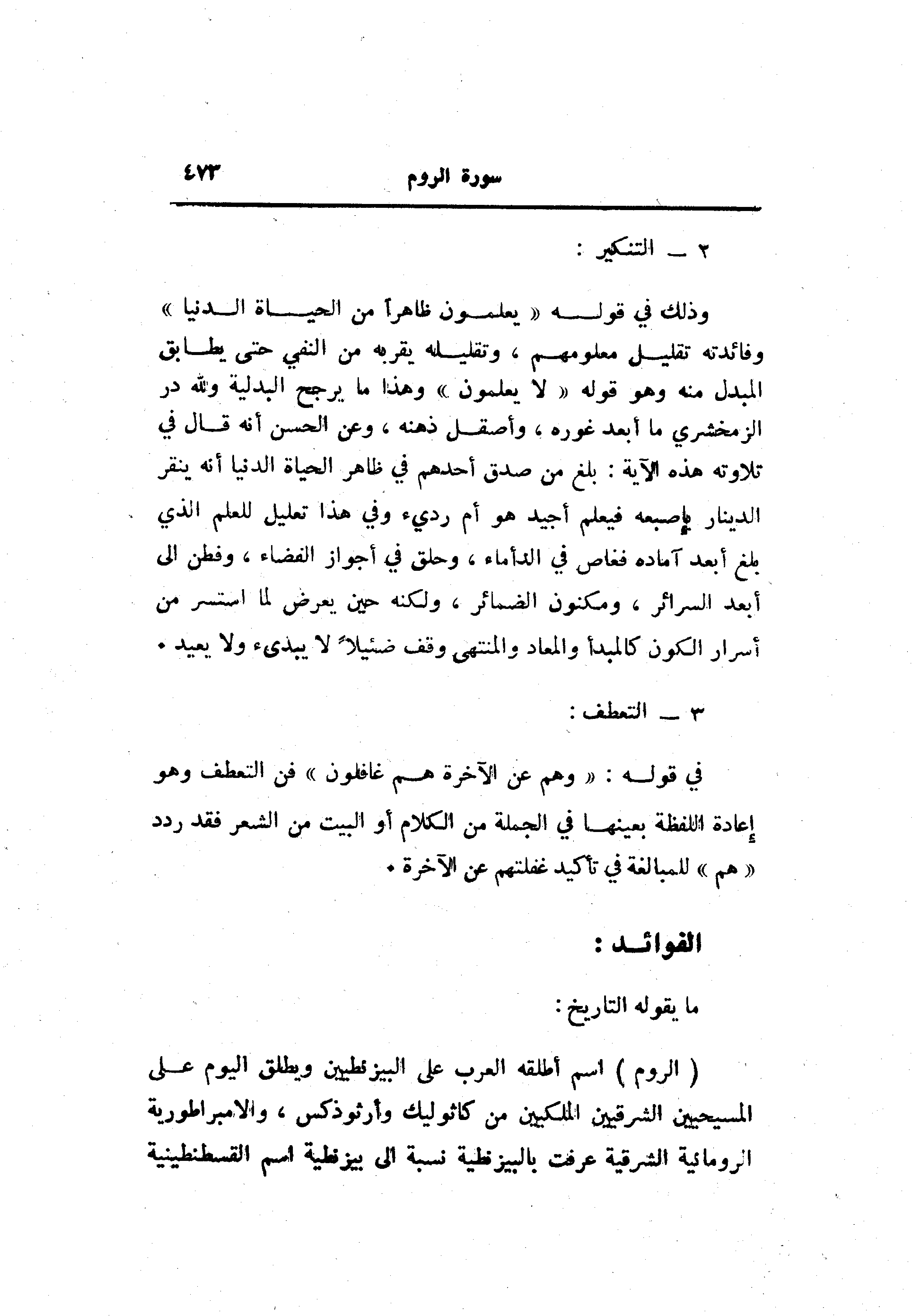 وذلك في قوله «يعلمون ظاهرا من الحياة الدنيا» وفائدته تقليل معلومهم، وتقليله يقربه من النفي حتى يطابق المبدل منه وهو قوله «لا يعلمون» وهذا ما يرجح البالية ولله در الزمخشري ما أبعد غوره، وأصقل ذهنه، وعن الحسن انه قال في تلاوته هذه الآية: بلغ من صدق أحدهم في ظاهر الحياة الدنيا أنه ينقر الدينار بإصبعه فيعلم أجيد هو أم رديء وفي هذا تعليل للعلم الذي بلغ أبعد آماده فغاص في الدأماء، وحلق في أجواز الفضاء، وفطن الى أبعد السرائر، ومكنون الضمائر، ولكنه حين يعرض لما استسر من أسرار الكون كالمبدأ والمعاد والمنتهى وقف ضئيلا لا يبدىء ولا يعيد.