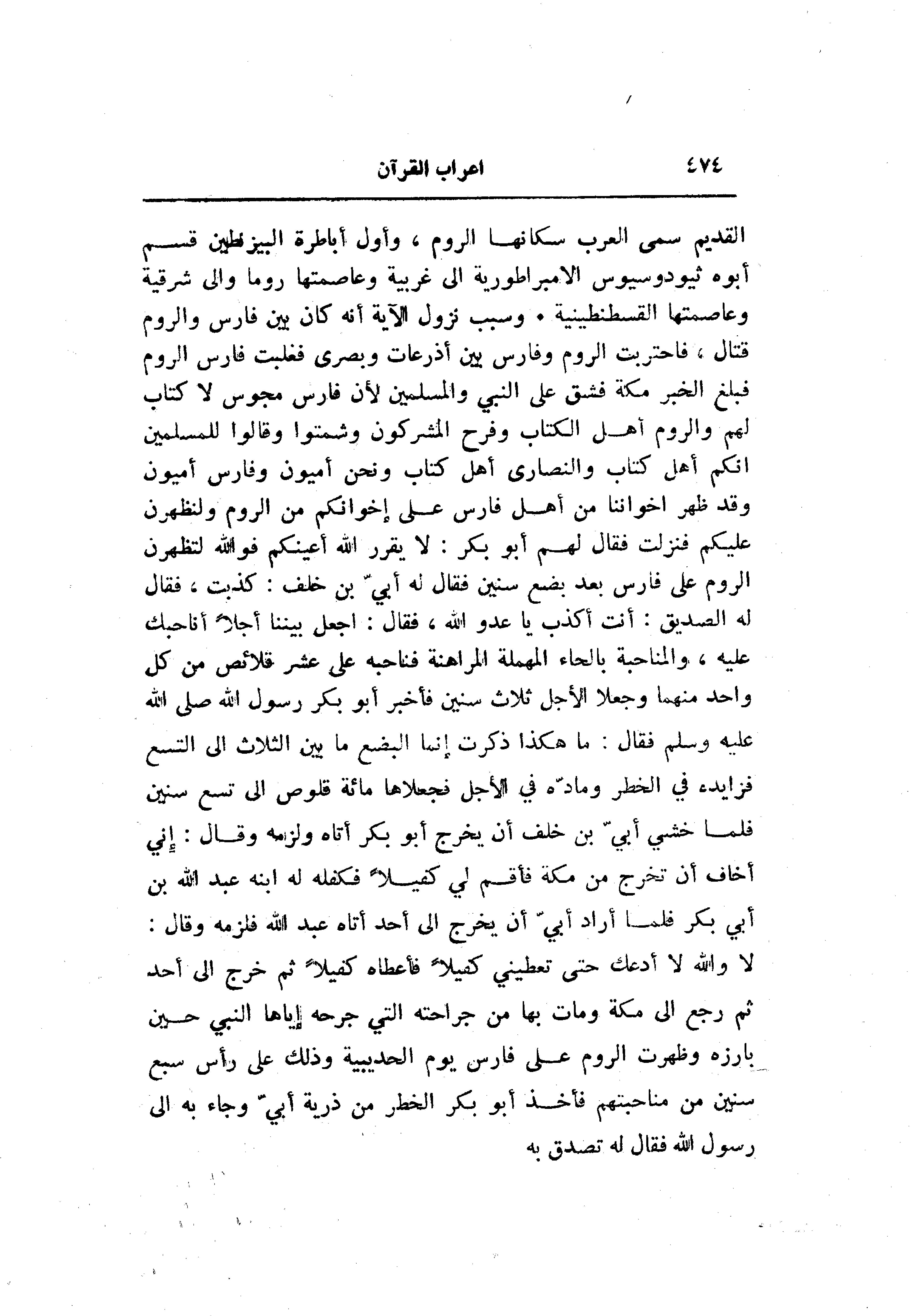 القديم سمى العرب سكانها الروم، وأول أباطرة البيزنطين قسم أبوه ثيودوسيوس الامبراطورية الى غربية وعاصمتها روما والى شرقية وعاصمتها القسطنطينية. وسبب نزول الآية أنه كان بين فارس والروم قتال، فاحتربت الروم وفارس بين أذرعات وبصرى فغلبت فارس الروم فبلغ الخبر مكة فشق على النبي والمسلمين لأن فارس مجوس لا كتاب لهم والروم أهل الكتاب وفرح المشركون وشمتوا وقالوا للمسلمين انكم أهل كتاب والنصارى أهل كتاب ونحن أميون وفارس أميون وقد ظهر إخواننا من أهل فارس على إخوانكم من الروم ولنظهرن عليكم فنزلت فقال لهم أبو بكر: لا يقرر الله أعينكم فو الله لتظهرن الروم على فارس بعد بضع سنين فقال له أبيّ بن خلف: كذبت، فقال له الصديق: أنت أكذب يا عدو الله، فقال: اجعل بيننا أجلا أنا حبك عليه، والمناحبة بالحاء المهملة المراهنة فناحبه على عشر قلائص من كل واحد منهما وجعلا الأجل ثلاث سنين فأخبر أبو بكر رسول الله صلى الله عليه وسلم فقال: ما هكذا ذكرت إنما البضع ما بين الثلاث الى التسع فزايده في الخطر ومادّه في الأجل فجعلاها مائة قلوص الى تسع سنين فلما خشي أبيّ بن خلف أن يخرج أبو بكر أتاه ولزمه وقال: إني أخاف أن تخرج من مكة فأقم لي كفيلا فكفله له ابنه عبد الله بن أبي بكر فلما أراد أبيّ أن يخرج الى أحد أتاه عبد الله فلزمه وقال: