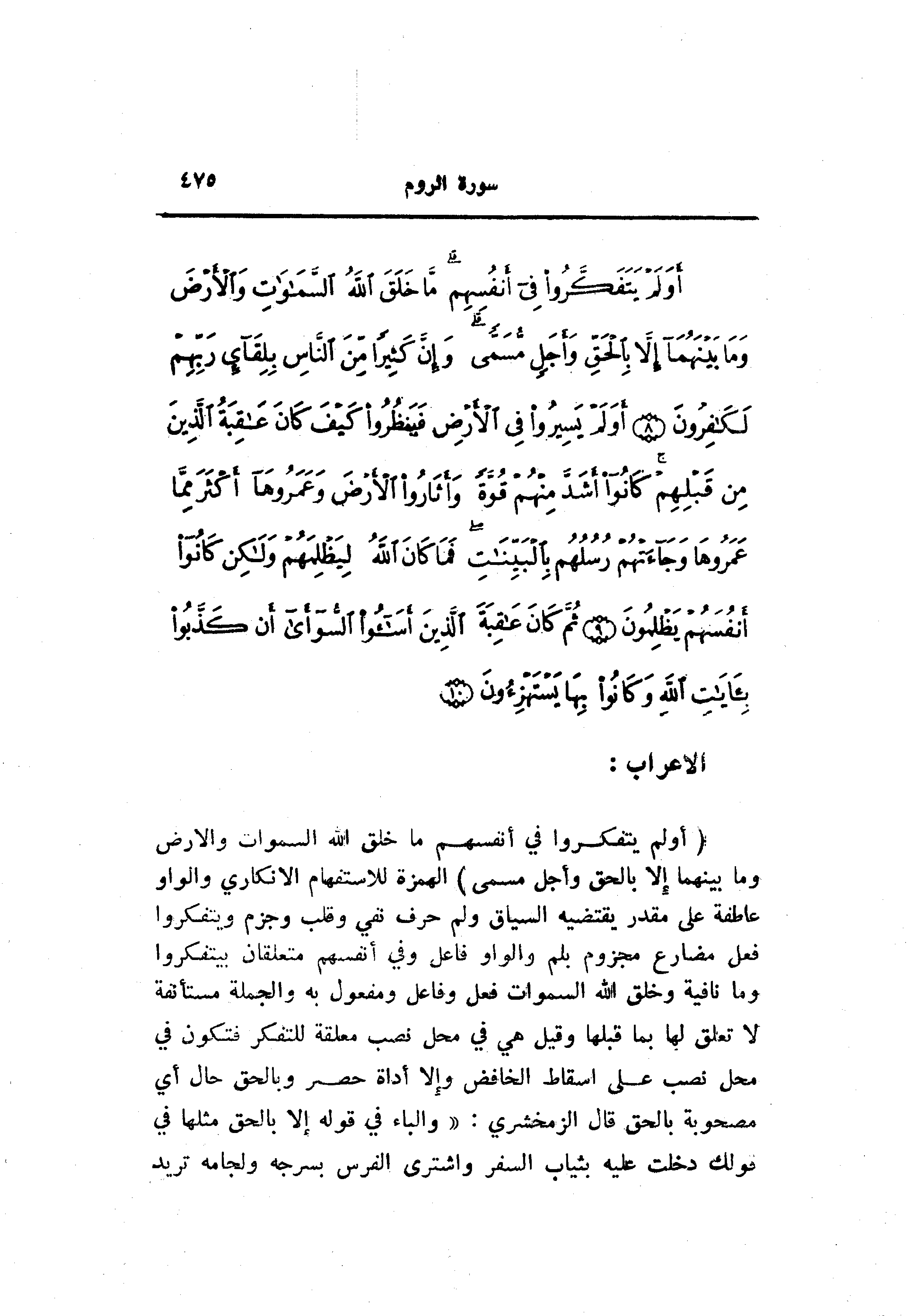 (أَوَلَمْ يَتَفَكَّرُوا فِي أَنْفُسِهِمْ ما خَلَقَ اللَّهُ السَّماواتِ وَالْأَرْضَ وَما بَيْنَهُما إِلَّا بِالْحَقِّ وَأَجَلٍ مُسَمًّى) الهمزة للاستفهام الانكاري والواو عاطفة على مقدر يقتضيه السياق ولم حرف نفي وقلب وجزم ويتفكروا فعل مضارع مجزوم بلم والواو فاعل وفي أنفسهم متعلقان بيتفكروا وما نافية وخلق الله السموات فعل وفاعل ومفعول به والجملة مستأنفة لا تعلق لها بما قبلها وقيل هي في محل نصب معلقة للتفكر فتكون في محل نصب على إسقاط الخافض وإلا أداة حصر وبالحق حال أي مصحوبة بالحق قال الزمخشري: «والباء في قوله إلا بالحق مثلها في قولك دخلت عليه بثياب السفر واشترى الفرس بسرجه ولجامه تريد