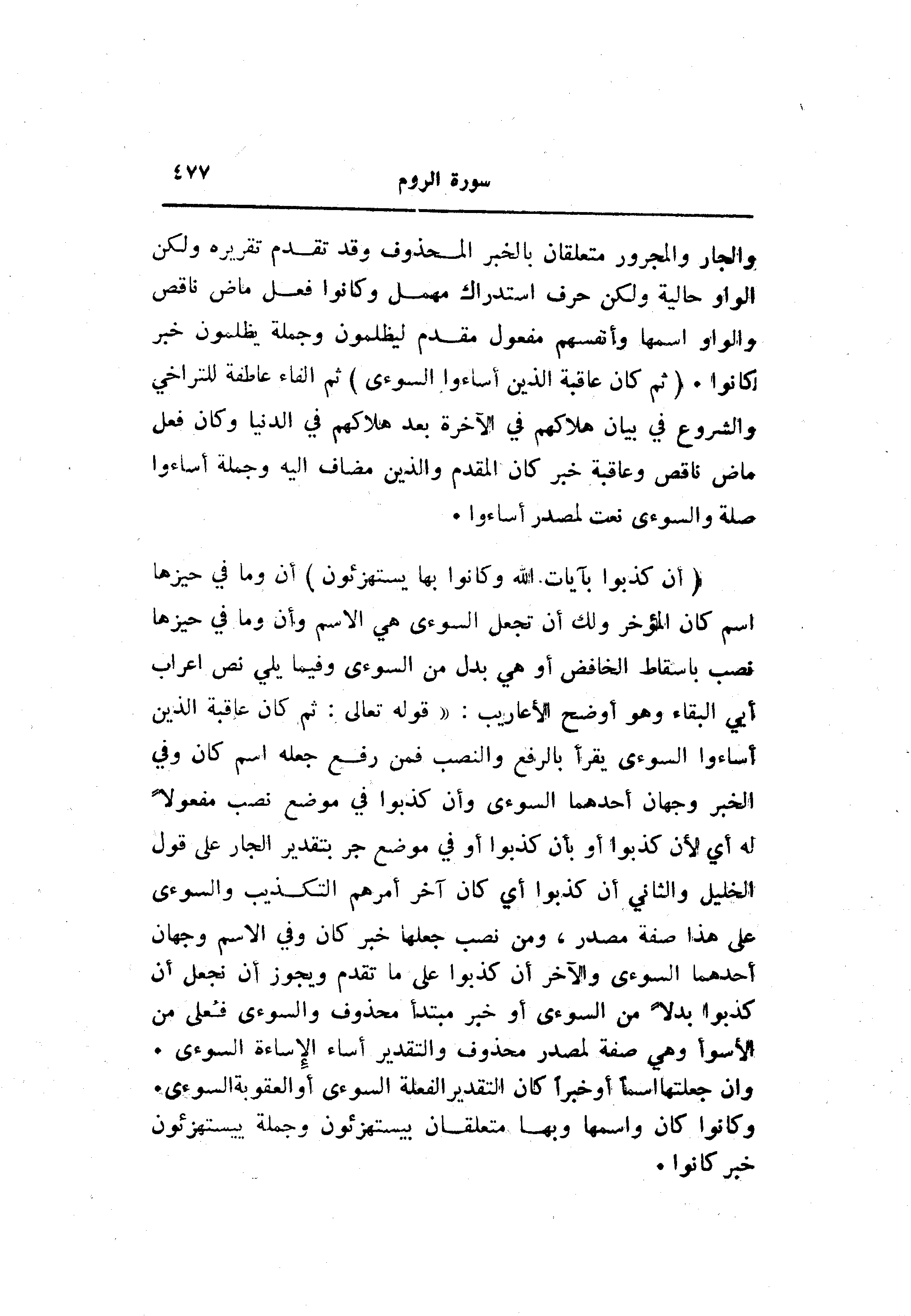 (أَنْ كَذَّبُوا بِآياتِ اللَّهِ وَكانُوا بِها يَسْتَهْزِؤُنَ) أن وما في حيزها اسم كان المؤخر ولك أن تجعل السوءى هي الاسم وأن وما في حيزها نصب بإسقاط الخافض أو هي بدل من السوءى وفيما يلي نص اعراب أبي البقاء وهو أوضح الأعاريب: «قوله تعالى: ثم كان عاقبة الذين أساءوا السوءى يقرأ بالرفع والنصب فمن رفع جعله اسم كان وفي الخبر وجهان أحدهما السوءى وأن كذبوا في موضع نصب مفعولا له أي لأن كذبوا أو بأن كذبوا أو في موضع جر بتقدير الجار على قول الخليل والثاني أن كذبوا أي كان آخر أمرهم التكذيب والسوءى على هذا صفة مصدر، ومن نصب جعلها خبر كان وفي الاسم وجهان أحدهما السوءى والآخر أن كذبوا على ما تقدم ويجوز أن نجعل أن كذبوا بدلا من السوءى أو خبر مبتدأ محذوف والسوءى فعلى من الأسوأ وهي صفة لمصدر محذوف والتقدير أساء الإساءة السوءى.