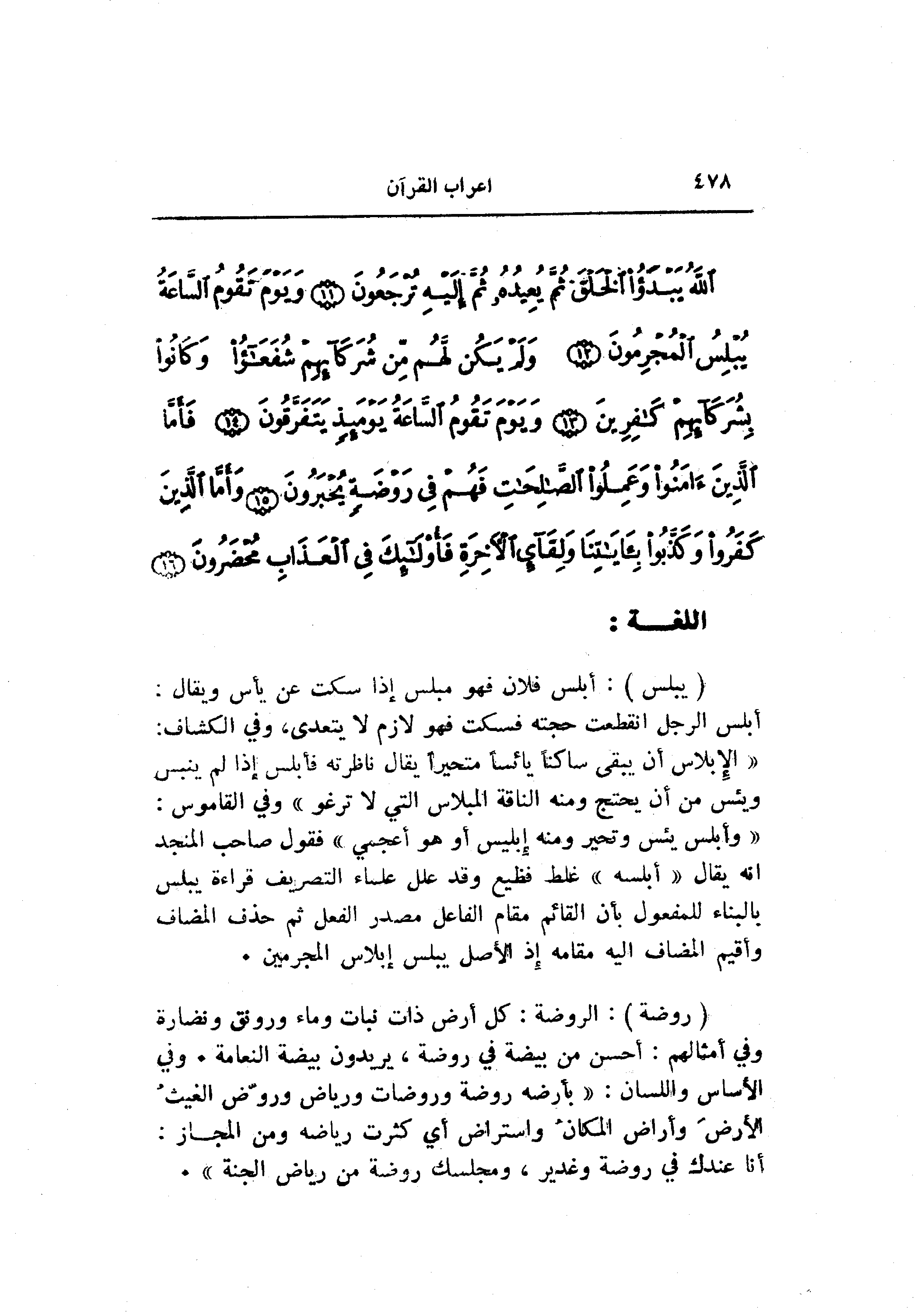 «وأبلس يئس وتحير ومنه إبليس أو هو أعجمي» فقول صاحب المنجد انه يقال «أبلسه» غلط فظيع وقد علل علساء التصريف قراءة يبلس بالبناء للمفعول بأن القائم مقام الفاعل مصدر الفعل ثم حذف المضاف وأقيم المضاف اليه مقامه إذ الأصل يبلس إبلاس المجرمين.