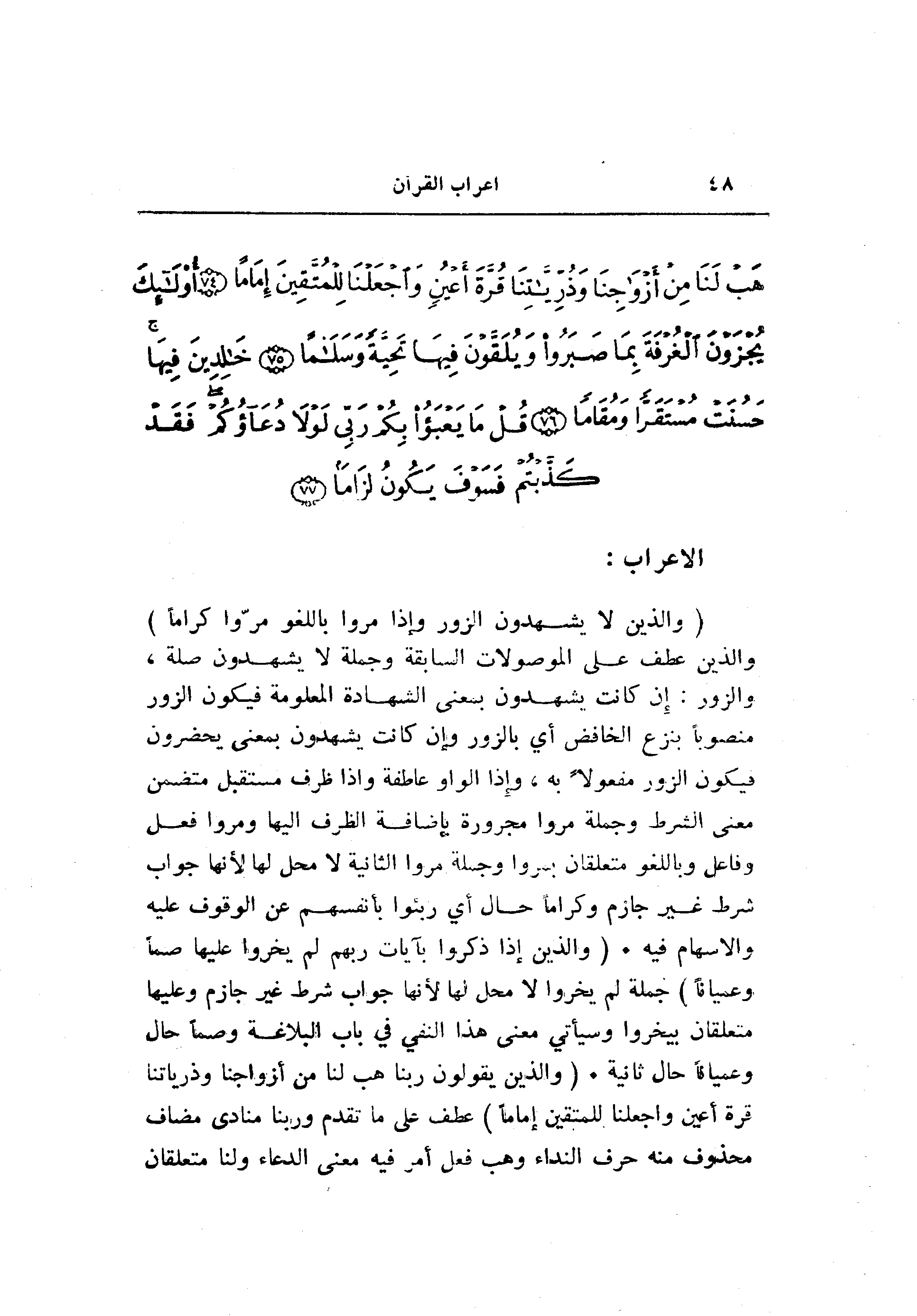 (وَالَّذِينَ لا يَشْهَدُونَ الزُّورَ وَإِذا مَرُّوا بِاللَّغْوِ مَرُّوا كِراماً) والذين عطف على الموصولات السابقة وجملة لا يشهدون صلة، والزور: إن كانت يشهدون بمعنى الشهادة المعلومة فيكون الزور منصوبا بنزع الخافض أي بالزور وإن كانت يشهدون بمعنى يحضرون فيكون الزور مفعولا به، وإذا الواو عاطفة وإذا ظرف مستقبل متضمن معنى الشرط وجملة مروا مجرورة بإضافة الظرف إليها ومروا فعل وفاعل وباللغو متعلقان بمروا وجملة مروا الثانية لا محل لها لأنها جواب شرط غير جازم وكراما حال أي ربئوا بأنفسهم عن الوقوف عليه والاسهام فيه. (وَالَّذِينَ إِذا ذُكِّرُوا بِآياتِ رَبِّهِمْ لَمْ يَخِرُّوا عَلَيْها صُمًّا وَعُمْياناً) جملة لم يخروا لا محل لها لأنها جواب شرط غير جازم وعليها متعلقان بيخروا وسيأتي معنى هذا النفي في باب البلاغة وصما حال وعميانا حال ثانية. (وَالَّذِينَ يَقُولُونَ رَبَّنا هَبْ لَنا مِنْ أَزْواجِنا وَذُرِّيَّاتِنا قُرَّةَ أَعْيُنٍ وَاجْعَلْنا لِلْمُتَّقِينَ إِماماً) عطف على ما تقدم وربنا منادى مضاف محذوف منه حرف النداء وهب فعل أمر فيه معنى الدعاء ولنا متعلقان