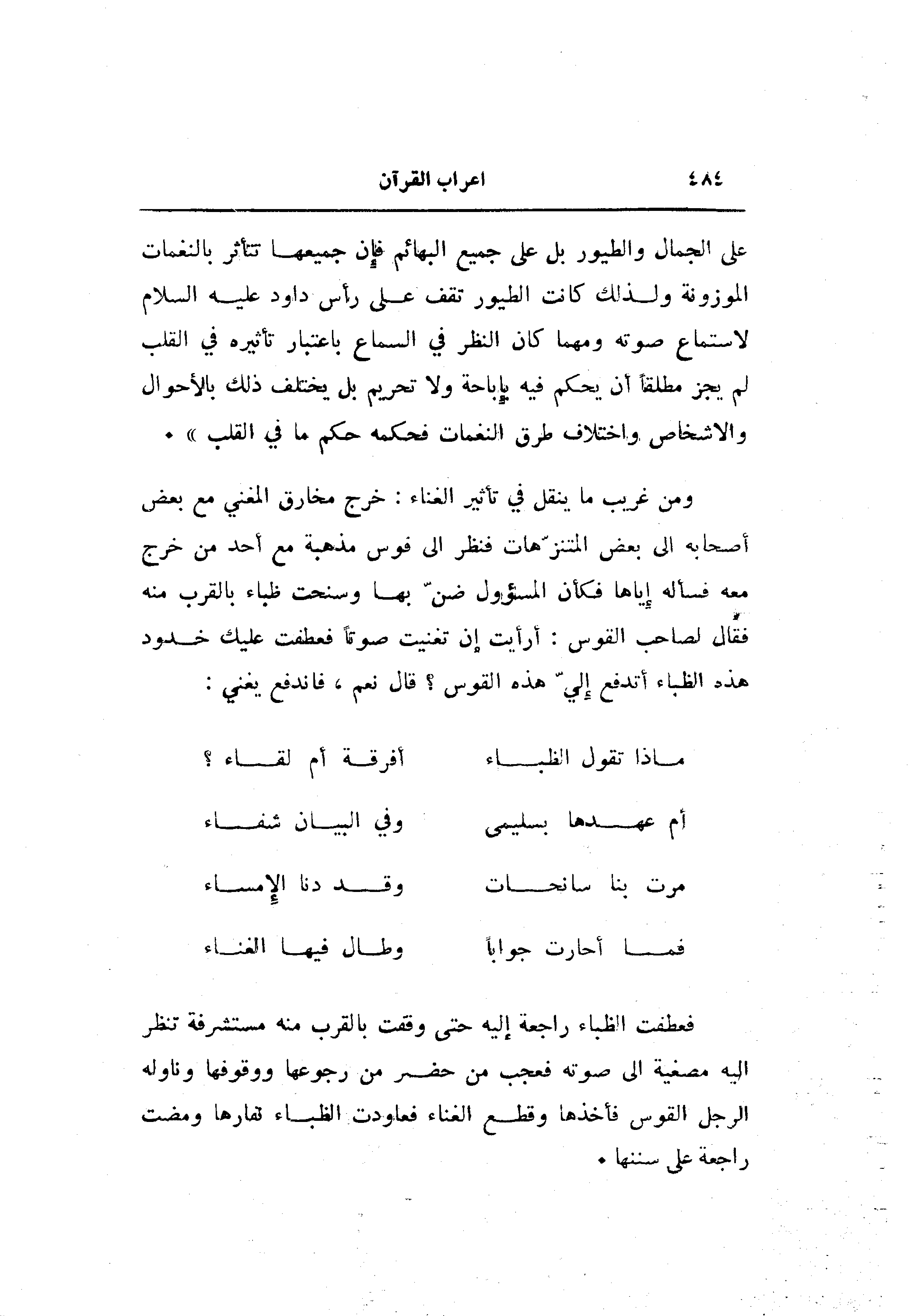 على الجمال والطيور بل على جميع البهائم فإن جميعها تتأثر بالنغمات الموزونة ولذلك كانت الطيور تقف على رأس داود عليه السلام لاستماع صوته ومهما كان النظر في السماع باعتبار تأثيره في القلب لم يجز مطلقا أن يحكم فيه بإباحة ولا تحريم بل يختلف ذلك بالأحوال والاشخاص واختلاف طرق النغمات فحكمه حكم ما في القلب» .