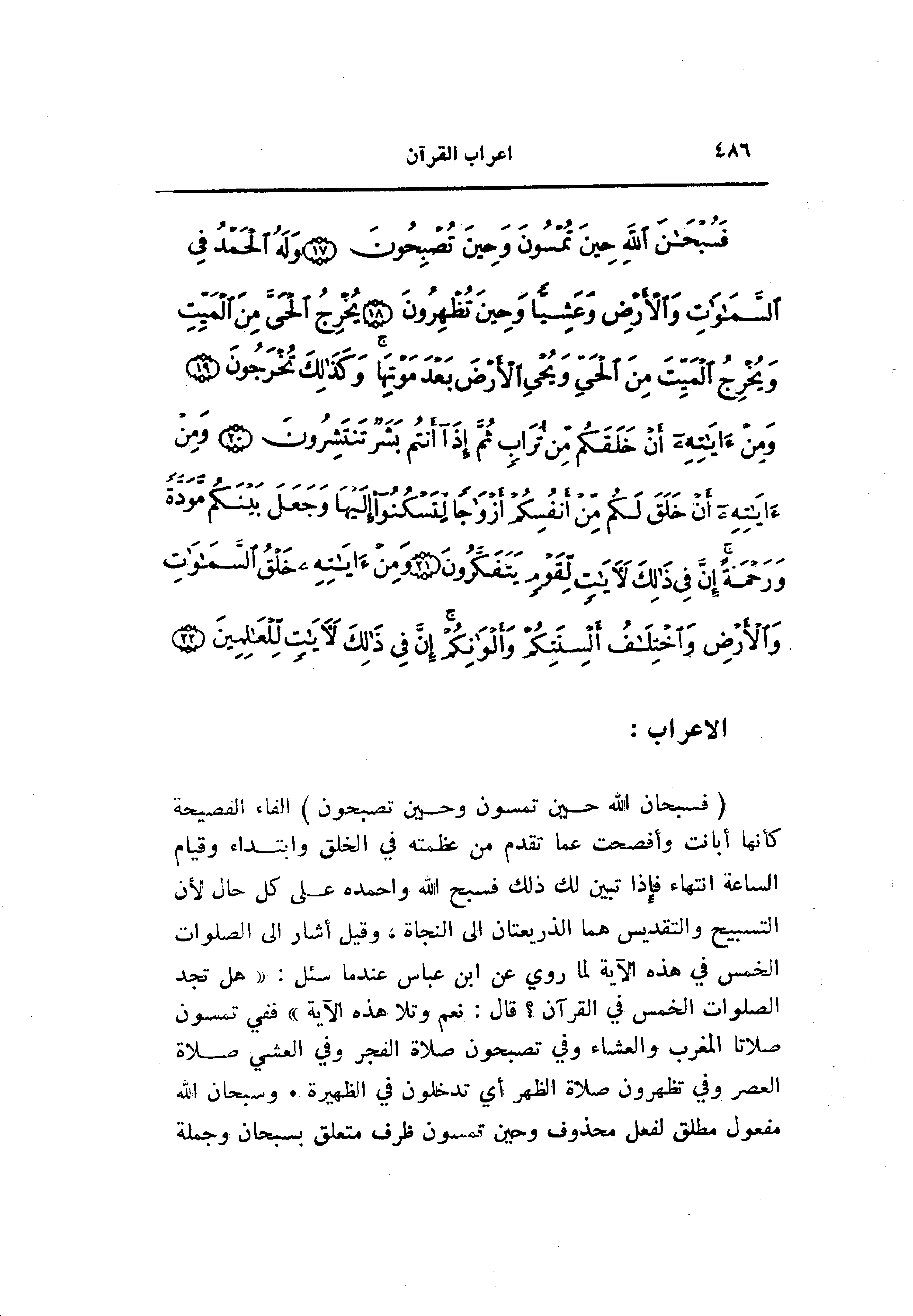 (فَسُبْحانَ اللَّهِ حِينَ تُمْسُونَ وَحِينَ تُصْبِحُونَ) الفاء الفصيحة كأنها أبانت وأفصحت عما تقدم من عظمته في الخلق وابتداء وقيام الساعة انتهاء فإذا تبين لك ذلك فسبح الله واحمده على كل حال لأن التسبيح والتقديس هما الذريعتان الى النجاة، وقيل أشار الى الصلوات الخمس في هذه الآية لما روي عن ابن عباس عند ما سئل: «هل تجد الصلوات الخمس في القرآن؟ قال: نعم وتلا هذه الآية» ففي تمسون صلاتا المغرب والعشاء وفي تصبحون صلاة الفجر وفي العشي صلاة العصر وفي تظهرون صلاة الظهر أي تدخلون في الظهيرة. وسبحان الله مفعول مطلق لفعل محذوف وحين تمسون ظرف متعلق بسبحان وجملة