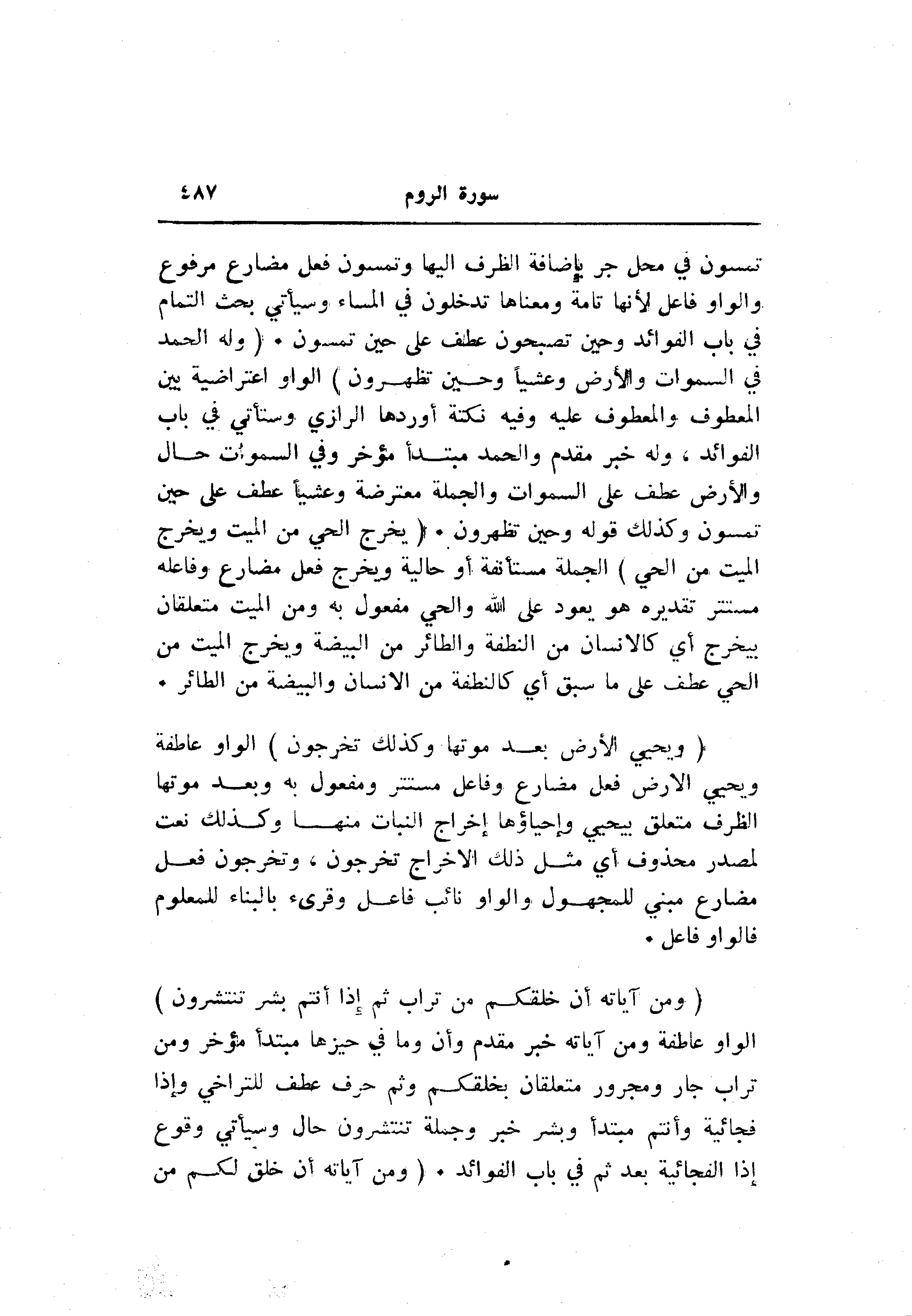 تمسون في محل جر بإضافة الظرف إليها وتمسون فعل مضارع مرفوع والواو فاعل لأنها تامة ومعناها تدخلون في المساء وسيأتي بحث التمام في باب الفوائد وحين تصبحون عطف على حين تمسون. (وَلَهُ الْحَمْدُ فِي السَّماواتِ وَالْأَرْضِ وَعَشِيًّا وَحِينَ تُظْهِرُونَ) الواو اعتراضية بين المعطوف والمعطوف عليه وفيه نكتة أوردها الرازي وستأتي في باب الفوائد، وله خبر مقدم والحمد مبتدأ مؤخر وفي السموات حال والأرض عطف على السموات والجملة معترضة وعشيا عطف على حين تمسون وكذلك قوله وحين تظهرون. (يُخْرِجُ الْحَيَّ مِنَ الْمَيِّتِ وَيُخْرِجُ الْمَيِّتَ مِنَ الْحَيِّ) الجملة مستأنفة أو حالية ويخرج فعل مضارع وفاعله مستتر تقديره هو يعود على الله والحي مفعول به ومن الميت متعلقان بيخرج أي كالانسان من النطفة والطائر من البيضة ويخرج الميت من الحي عطف على ما سبق أي كالنطفة من الإنسان والبيضة من الطائر.