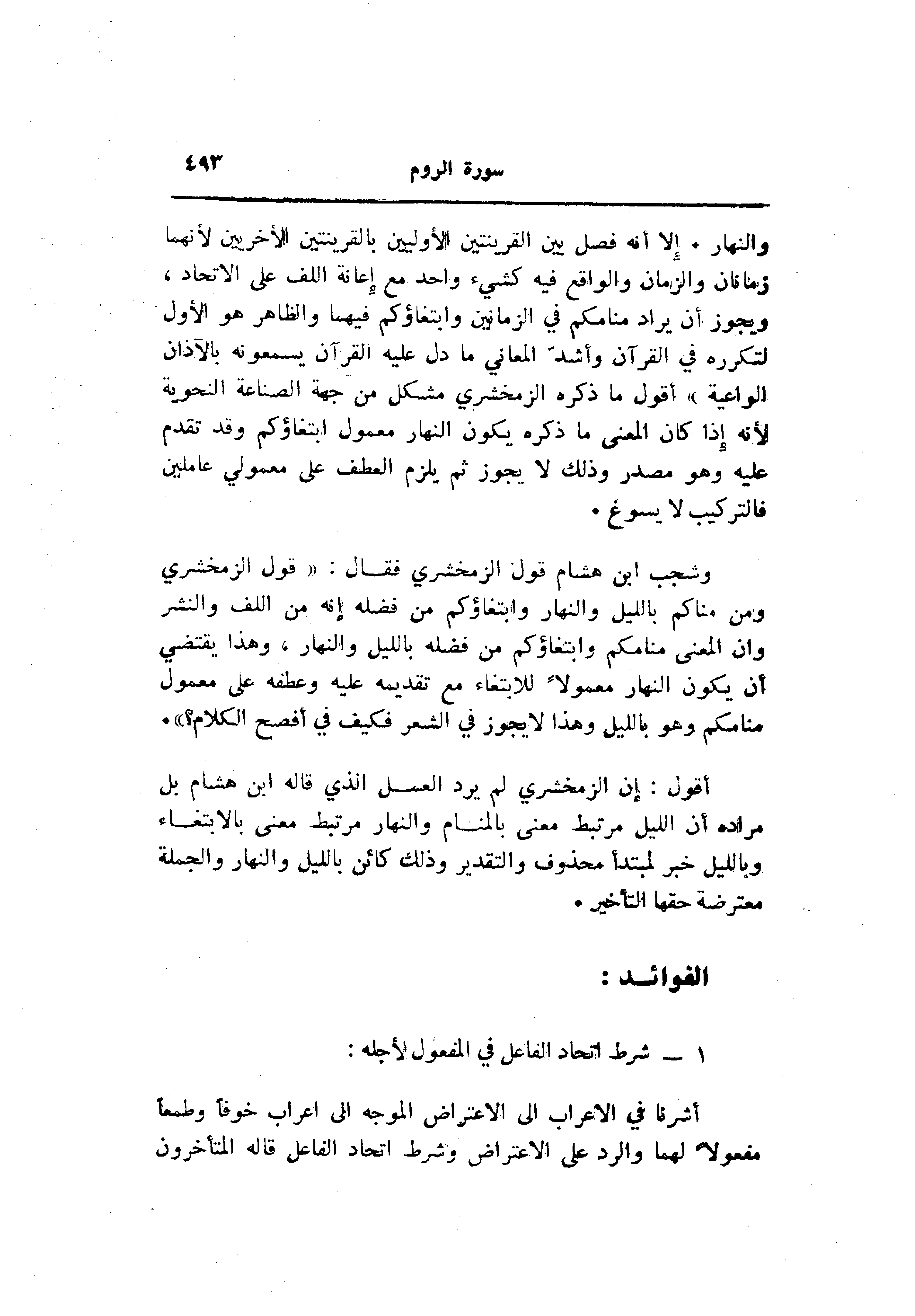 وشجب ابن هشام قول الزمخشري فقال: «قول الزمخشري ومن مناكم بالليل والنهار وابتغاؤكم من فضله إنه من اللف والنشر وان المعنى منامكم وابتغاؤكم من فضله بالليل والنهار، وهذا يقتضي أن يكون النهار معمولا للابتغاء مع تقديمه عليه وعطفه على معمول منامكم وهو بالليل وهذا لا يجوز في الشعر فكيف في أفصح الكلام؟» .