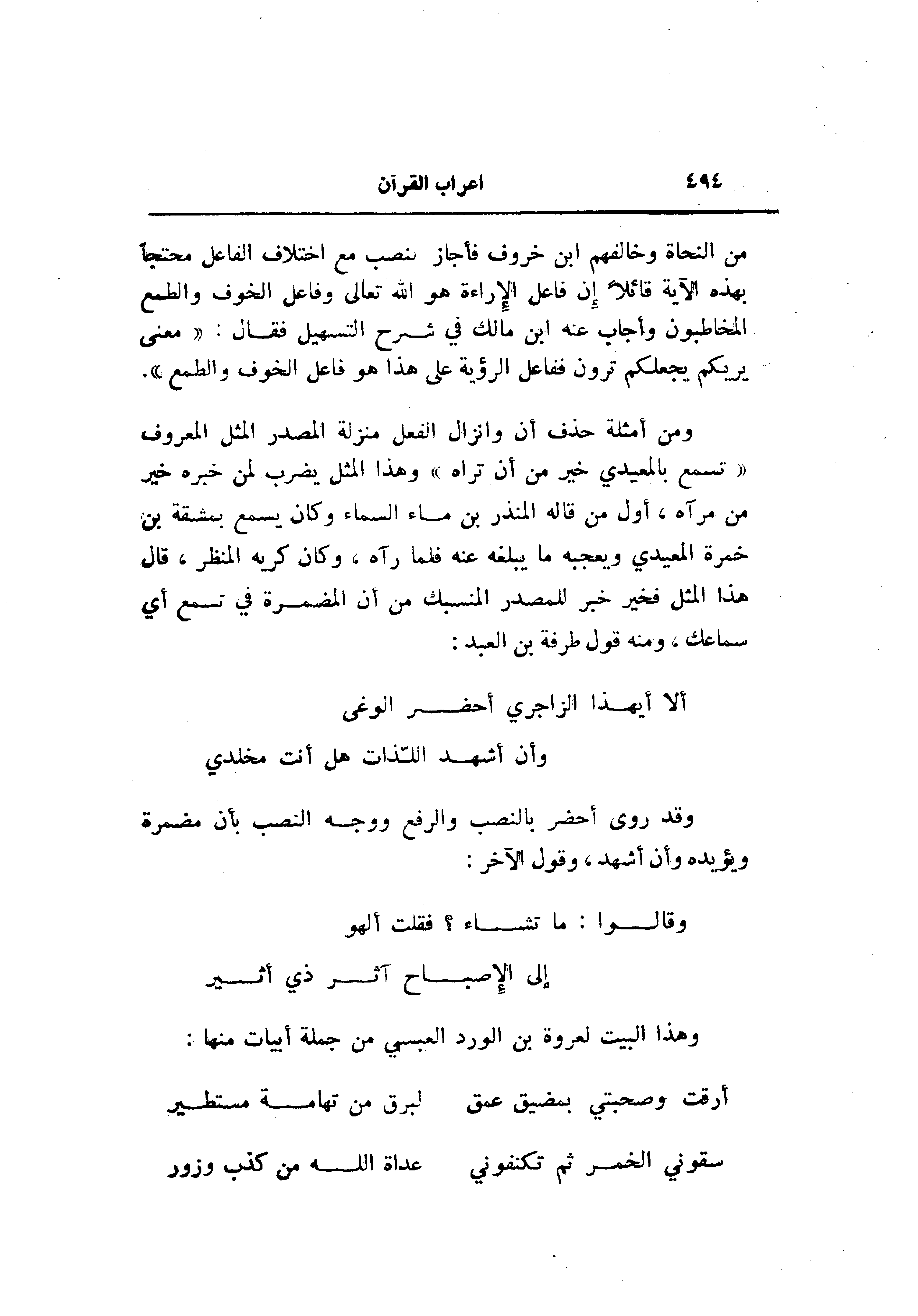 من النحاة وخالفهم ابن خروف فأجاز النصب مع اختلاف الفاعل محتجا بهذه الآية قائلا إن فاعل الإراءة هو الله تعالى وفاعل الخوف والطمع المخاطبون وأجاب عنه ابن مالك في شرح التسهيل فقال: «معنى يريكم يجعلكم ترون ففاعل الرؤية على هذا هو فاعل الخوف والطمع» .