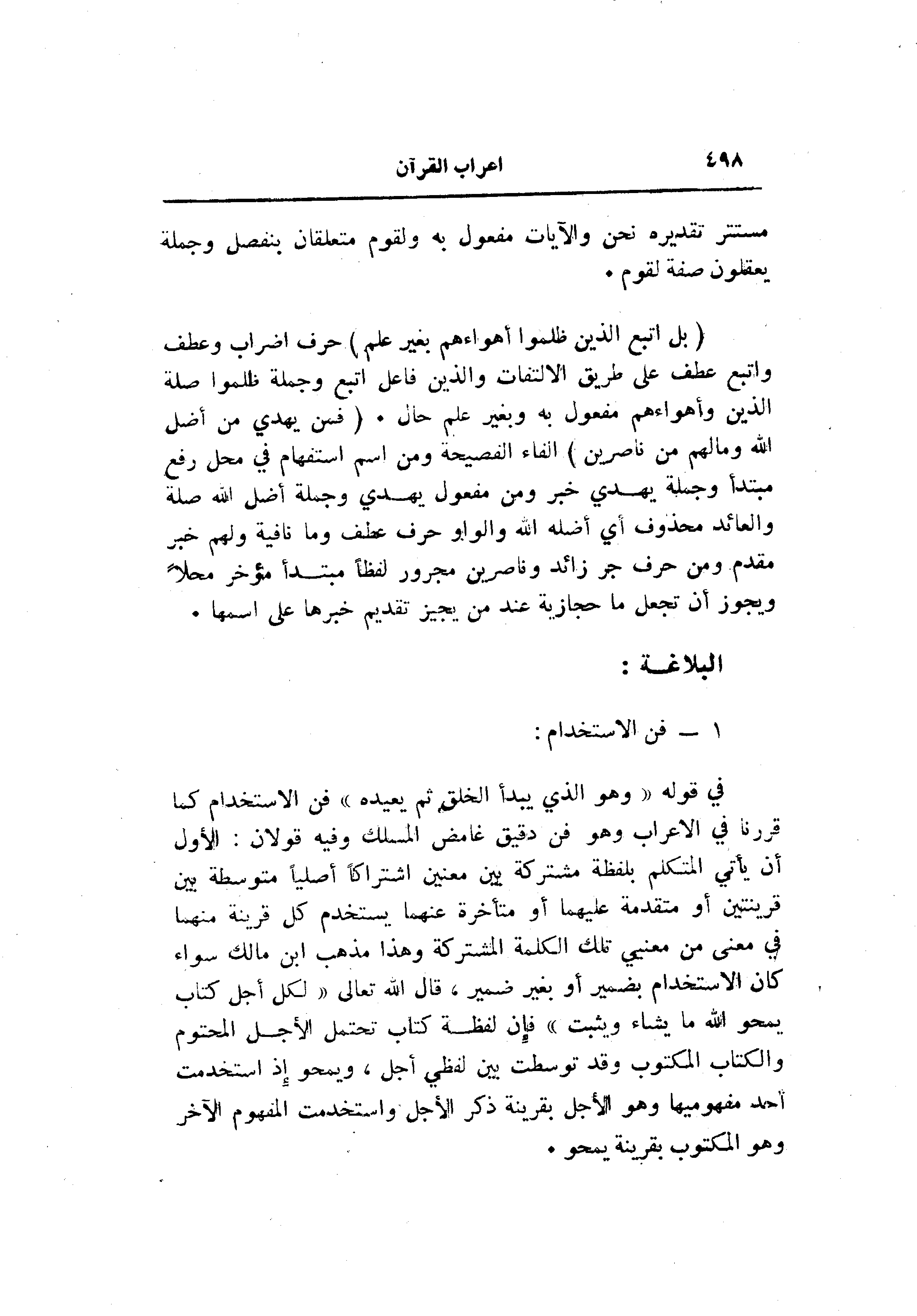 في قوله «وهو الذي يبدأ الخلق ثم يعيده» فن الاستخدام كما قررنا في الاعراب وهو فن دقيق غامض المسلك وفيه قولان: الأول أن يأتي المتكلم بلفظة مشتركة بين معنين اشتراكا أصليا متوسطة بين قرينتين أو متقدمة عليهما أو متأخرة عنهما يستخدم كل قرينة منهما في معنى من معنيي تلك الكلمة المشتركة وهذا مذهب ابن مالك سواء كان الاستخدام بضمير أو بغير ضمير، قال الله تعالى «لكل أجل كتاب يمحو الله ما يشاء ويثبت» فإن لفظة كتاب تحتمل الأجل المحتوم والكتاب المكتوب وقد توسطت بين لفظي أجل، ويمحو إذ استخدمت أحد مفهوميها وهو الأجل بقرينة ذكر الأجل واستخدمت المفهوم الآخر وهو المكتوب بقرينة يمحو.