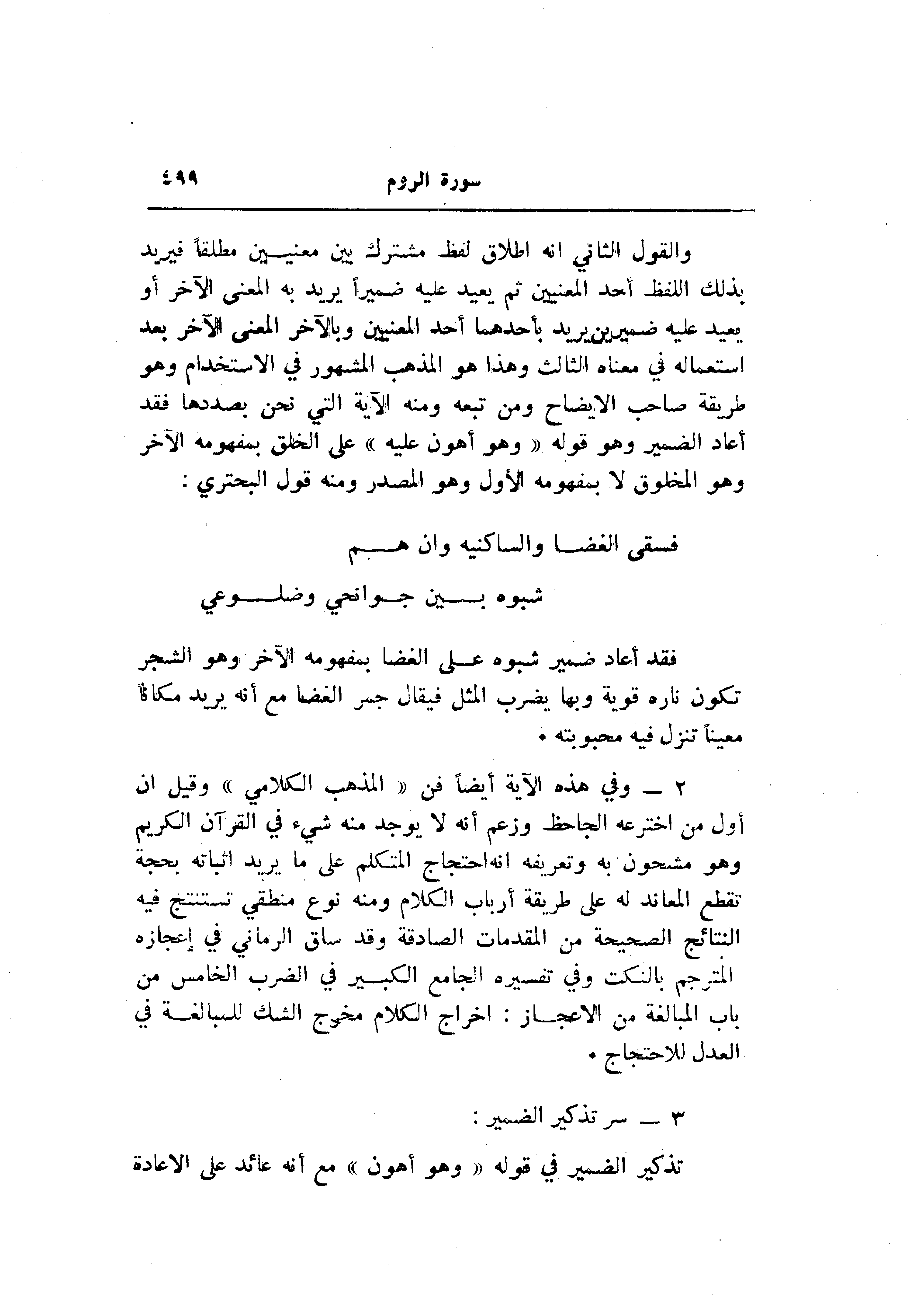 والقول الثاني انه اطلاق لفظ مشترك بين معنيين مطلقا فيريد بذلك اللفظ أحد المعنيين ثم يعيد عليه ضميرا يريد به المعنى الآخر أو يعيد عليه ضميرين يريد بأحدهما أحد المعنيين وبالآخر المعنى الآخر بعد استعماله في معناه الثالث وهذا هو المذهب المشهور في الاستخدام وهو طريقة صاحب الإيضاح ومن تبعه ومنه الآية التي نحن بصددها فقد أعاد الضمير وهو قوله «وهو أهون عليه» على الخلق بمفهومه الآخر وهو المخلوق لا بمفهومه الأول وهو المصدر ومنه قول البحتري:
