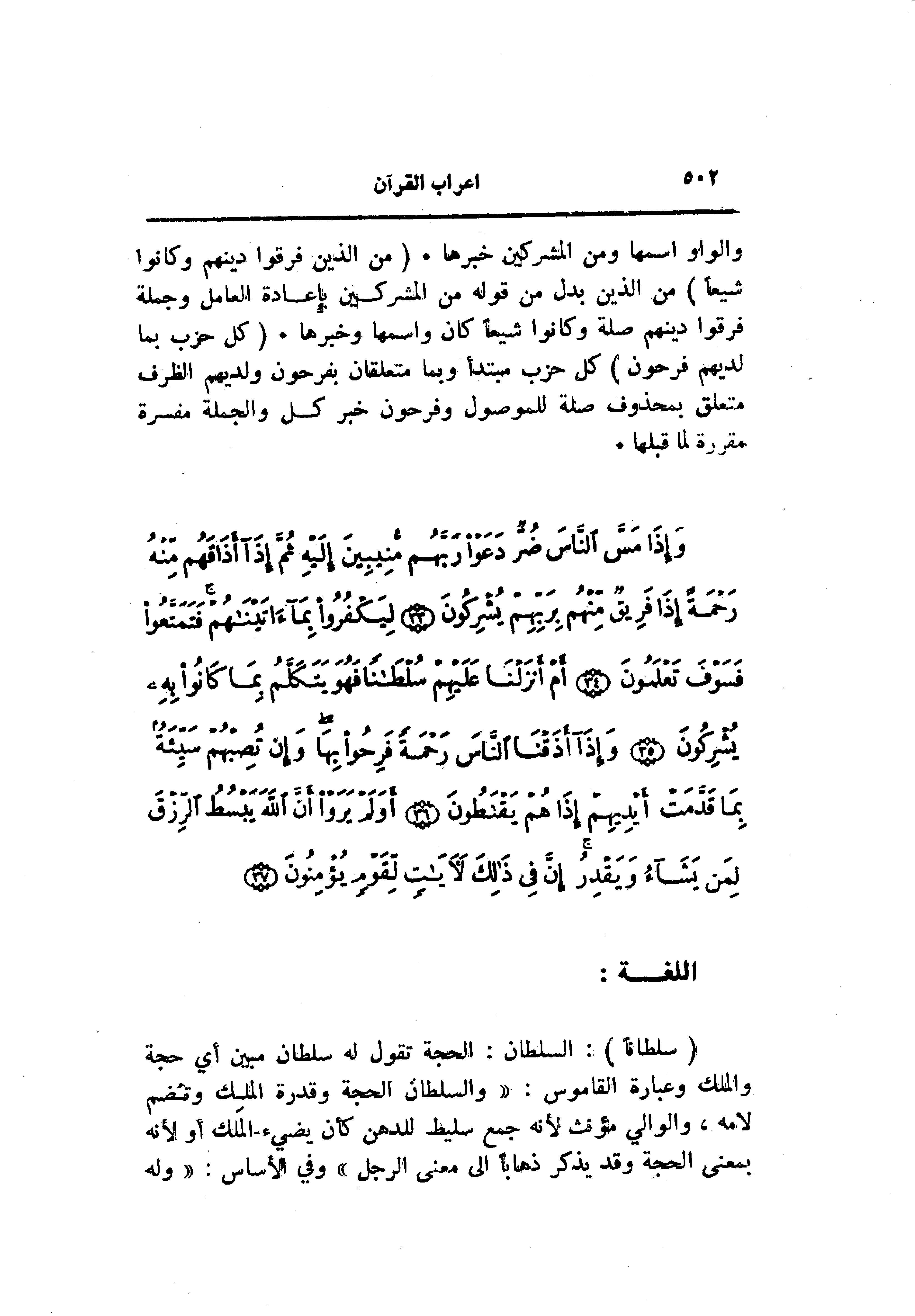 (سُلْطاناً) : السلطان: الحجة تقول له سلطان مبين أي حجة والملك وعبارة القاموس: «والسلطان الحجة وقدرة الملك وتضم لامه، والوالي مؤنث لأنه جمع سليط للدهن كأن يضيء الملك أو لأنه بمعنى الحجة وقد يذكر ذهابا الى معنى الرجل» وفي الأساس: «وله