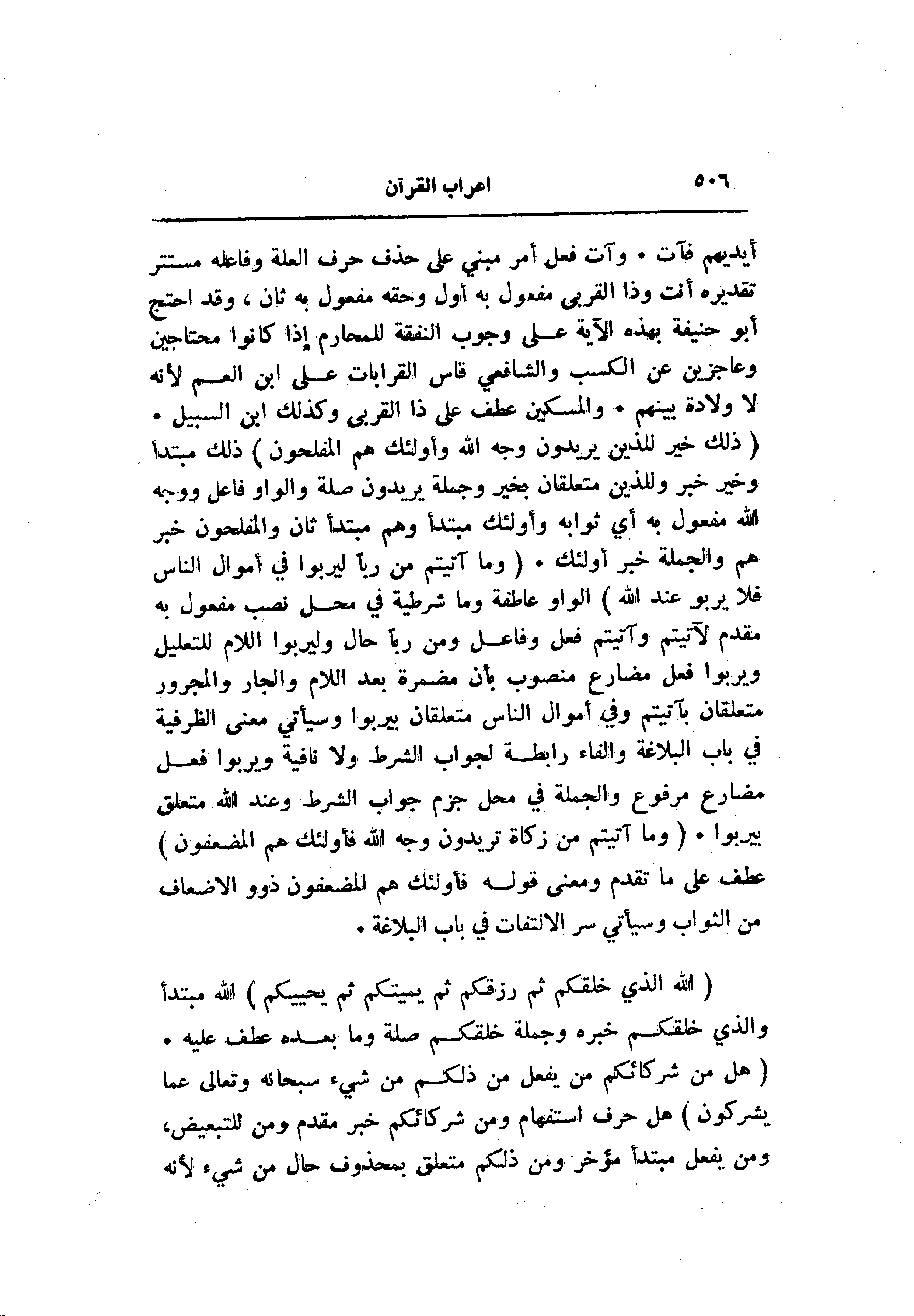 (ذلِكَ خَيْرٌ لِلَّذِينَ يُرِيدُونَ وَجْهَ اللَّهِ وَأُولئِكَ هُمُ الْمُفْلِحُونَ) ذلك مبتدأ وخير خبر وللذين متعلقان بخير وجملة يريدون صلة والواو فاعل ووجه الله مفعول به أي ثوابه وأولئك مبتدأ وهم مبتدأ ثان والمفلحون خبر هم والجملة خبر أولئك. (وَما آتَيْتُمْ مِنْ رِباً لِيَرْبُوَا فِي أَمْوالِ النَّاسِ فَلا يَرْبُوا عِنْدَ اللَّهِ) الواو عاطفة وما شرطية في محل نصب مفعول به مقدم لآتيتم وآتيتم فعل وفاعل ومن ربا حال وليربوا اللام للتعليل ويربوا فعل مضارع منصوب بأن مضمرة بعد اللام والجار والمجرور متعلقان بآتيتم وفي أموال الناس متعلقان بيربوا وسيأتي معنى الظرفية في باب البلاغة والفاء رابطة لجواب الشرط ولا نافية ويربوا فعل مضارع مرفوع والجملة في محل جزم جواب الشرط وعند الله متعلق بيربوا. (وَما آتَيْتُمْ مِنْ زَكاةٍ تُرِيدُونَ وَجْهَ اللَّهِ فَأُولئِكَ هُمُ الْمُضْعِفُونَ) عطف على ما تقدم ومعنى قوله فأولئك هم المضعفون ذوو الأضعاف من الثواب وسيأتي سر الالتفات في باب البلاغة.
