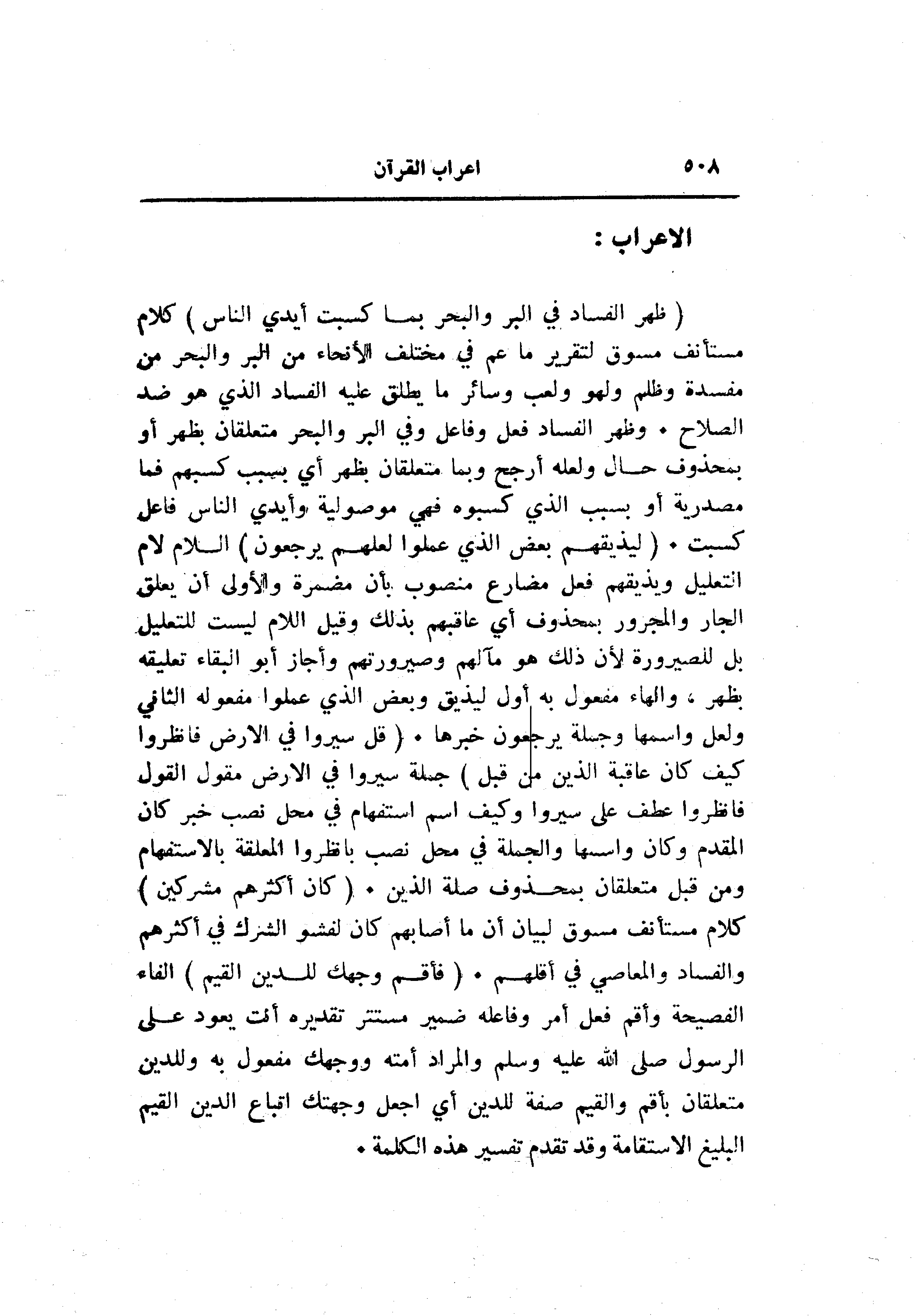 (ظَهَرَ الْفَسادُ فِي الْبَرِّ وَالْبَحْرِ بِما كَسَبَتْ أَيْدِي النَّاسِ) كلام مستأنف مسوق لتقرير ما عم في مختلف الأنحاء من البر والبحر من مفسدة وظلم ولهو ولعب وسائر ما يطلق عليه الفساد الذي هو ضد الصلاح. وظهر الفساد فعل وفاعل وفي البر والبحر متعلقان بظهر أو بمحذوف حال ولعله أرجح وبما متعلقان بظهر أي بسبب كسبهم فما مصدرية أو بسبب الذي كسبوه فهي موصولية وأيدي الناس فاعل كسبت. (لِيُذِيقَهُمْ بَعْضَ الَّذِي عَمِلُوا لَعَلَّهُمْ يَرْجِعُونَ) اللام لام التعليل ويذيقهم فعل مضارع منصوب بأن مضمرة والأولى أن يعلق الجار والمجرور بمحذوف أي عاقبهم بذلك وقيل اللام ليست للتعليل بل للصيرورة لأن ذلك هو مآلهم وصيرورتهم وأجاز أبو البقاء تعليقه بظهر، والهاء مفعول به أول ليذيق وبعض الذي عملوا مفعوله الثاني ولعل واسمها وجملة يرجعون خبرها. (قُلْ سِيرُوا فِي الْأَرْضِ فَانْظُرُوا كَيْفَ كانَ عاقِبَةُ الَّذِينَ مِنْ قَبْلُ) جملة سيروا في الأرض مقول القول فانظروا عطف على سيروا وكيف اسم استفهام في محل نصب خبر كان المقدم وكان واسمها والجملة في محل نصب بانظروا المعلقة بالاستفهام ومن قبل متعلقان بمحذوف صلة الذين. (كانَ أَكْثَرُهُمْ مُشْرِكِينَ) كلام مستأنف مسوق لبيان أن ما أصابهم كان لفشو الشرك في أكثرهم والفساد والمعاصي في أقلهم. (فَأَقِمْ وَجْهَكَ لِلدِّينِ الْقَيِّمِ) الفاء الفصيحة وأقم فعل أمر وفاعله ضمير مستتر تقديره أنت يعود على الرسول صلى الله عليه وسلم والمراد أمته ووجهك مفعول به وللدين متعلقان بأقم والقيم صفة للدين أي اجعل وجهتك اتباع الدين القيم البليغ الاستقامة وقد تقدم تفسير هذه الكلمة.