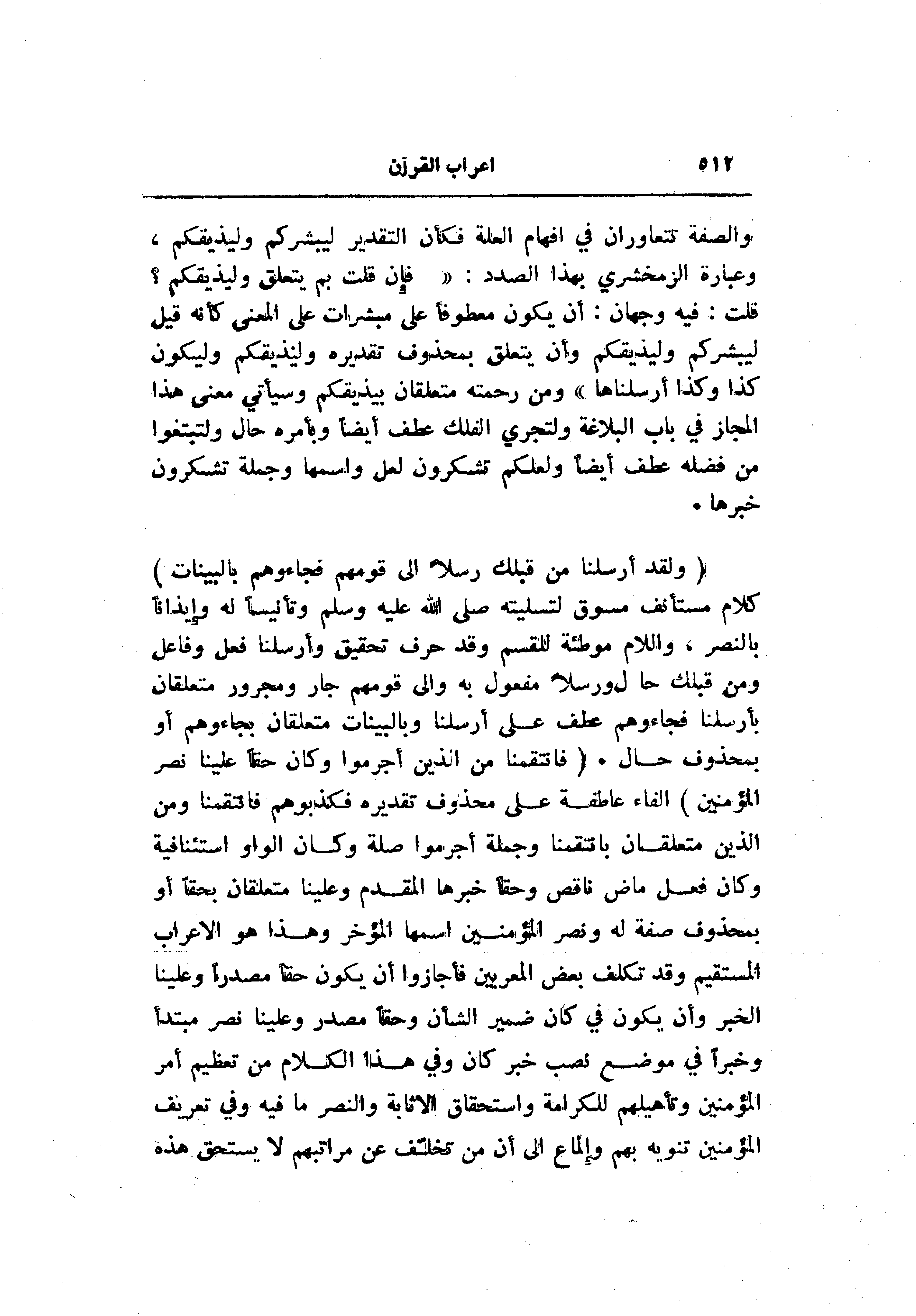قلت: فيه وجهان: أن يكون معطوفا على مبشرات على المعنى كأنه قيل ليبشركم وليذيقكم وأن يتعلق بمحذوف تقديره وليذيقكم وليكون كذا وكذا أرسلناها» ومن رحمته متعلقان بيذيقكم وسيأتي معنى هذا المجاز في باب البلاغة ولتجري الفلك عطف أيضا وبأمره حال ولتبتغوا من فضله عطف أيضا ولعلكم تشكرون لعل واسمها وجملة تشكرون خبرها.