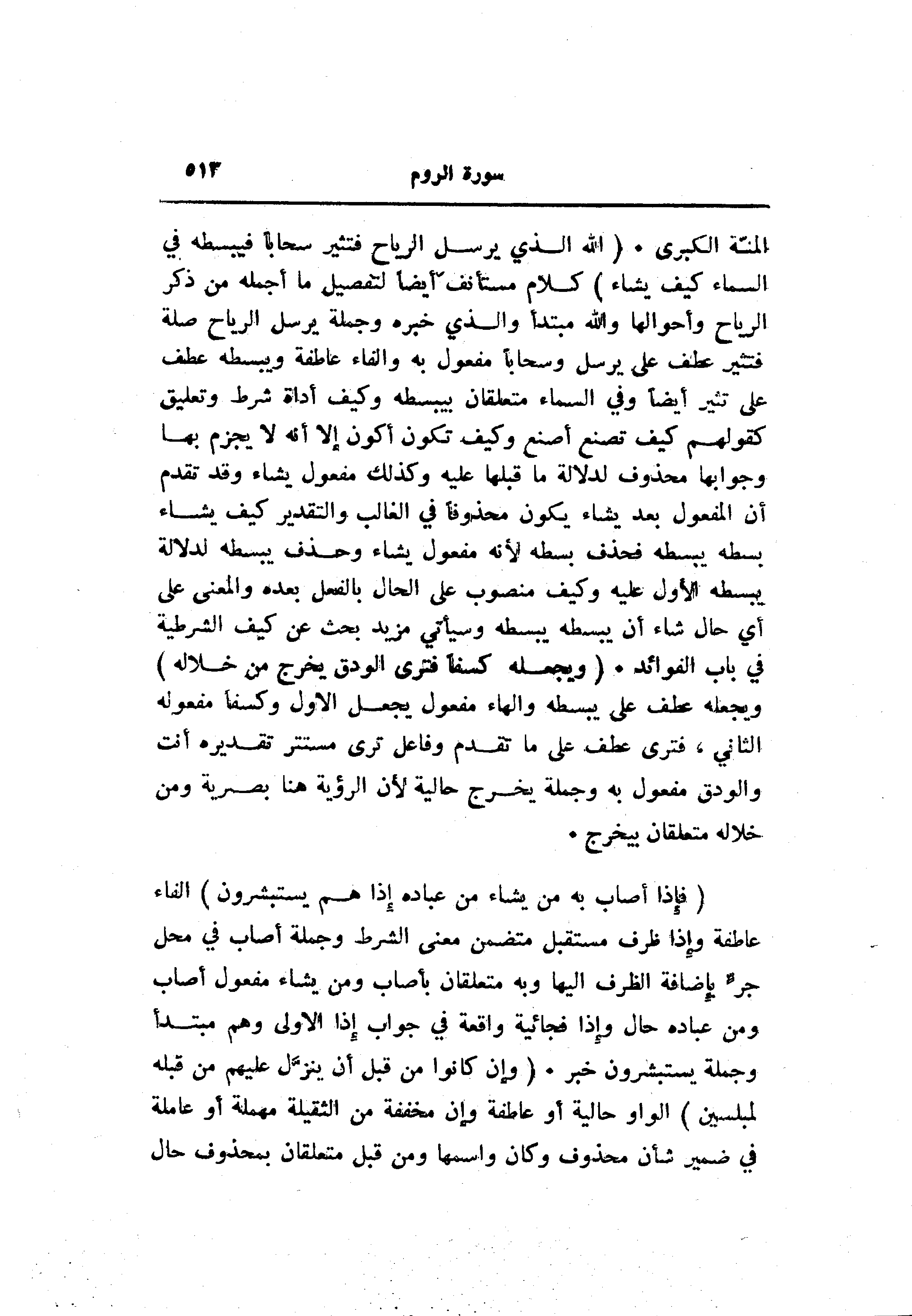 المنّة الكبرى. (اللَّهُ الَّذِي يُرْسِلُ الرِّياحَ فَتُثِيرُ سَحاباً فَيَبْسُطُهُ فِي السَّماءِ كَيْفَ يَشاءُ) كلام مستأنف أيضا لتفصيل ما أجمله من ذكر الرياح وأحوالها والله مبتدأ والذي خبره وجملة يرسل الرياح صلة فتثير عطف على يرسل وسحابا مفعول به والفاء عاطفة ويبسطه عطف على تثير أيضا وفي السماء متعلقان بيبسطه وكيف أداة شرط وتعليق كقولهم كيف تصنع أصنع وكيف تكون أكون إلا أنه لا يجزم بها وجوابها محذوف لدلالة ما قبلها عليه وكذلك مفعول يشاء وقد تقدم أن المفعول بعد يشاء يكون محذوفا في الغالب والتقدير كيف يشاء بسطه يبسطه فحذف بسطه لأنه مفعول يشاء وحذف يبسطه لدلالة يبسطه الأول عليه وكيف منصوب على الحال بالفعل بعده والمعنى على أي حال شاء أن يبسطه يبسطه وسيأتي مزيد بحث عن كيف الشرطية في باب الفوائد. (وَيَجْعَلُهُ كِسَفاً فَتَرَى الْوَدْقَ يَخْرُجُ مِنْ خِلالِهِ) ويجعله عطف على يبسطه والهاء مفعول يجعل الاول وكسفا مفعوله الثاني، فترى عطف على ما تقدم وفاعل ترى مستتر تقديره أنت والودق مفعول به وجملة يخرج حالية لأن الرؤية هنا بصرية ومن خلاله متعلقان بيخرج.