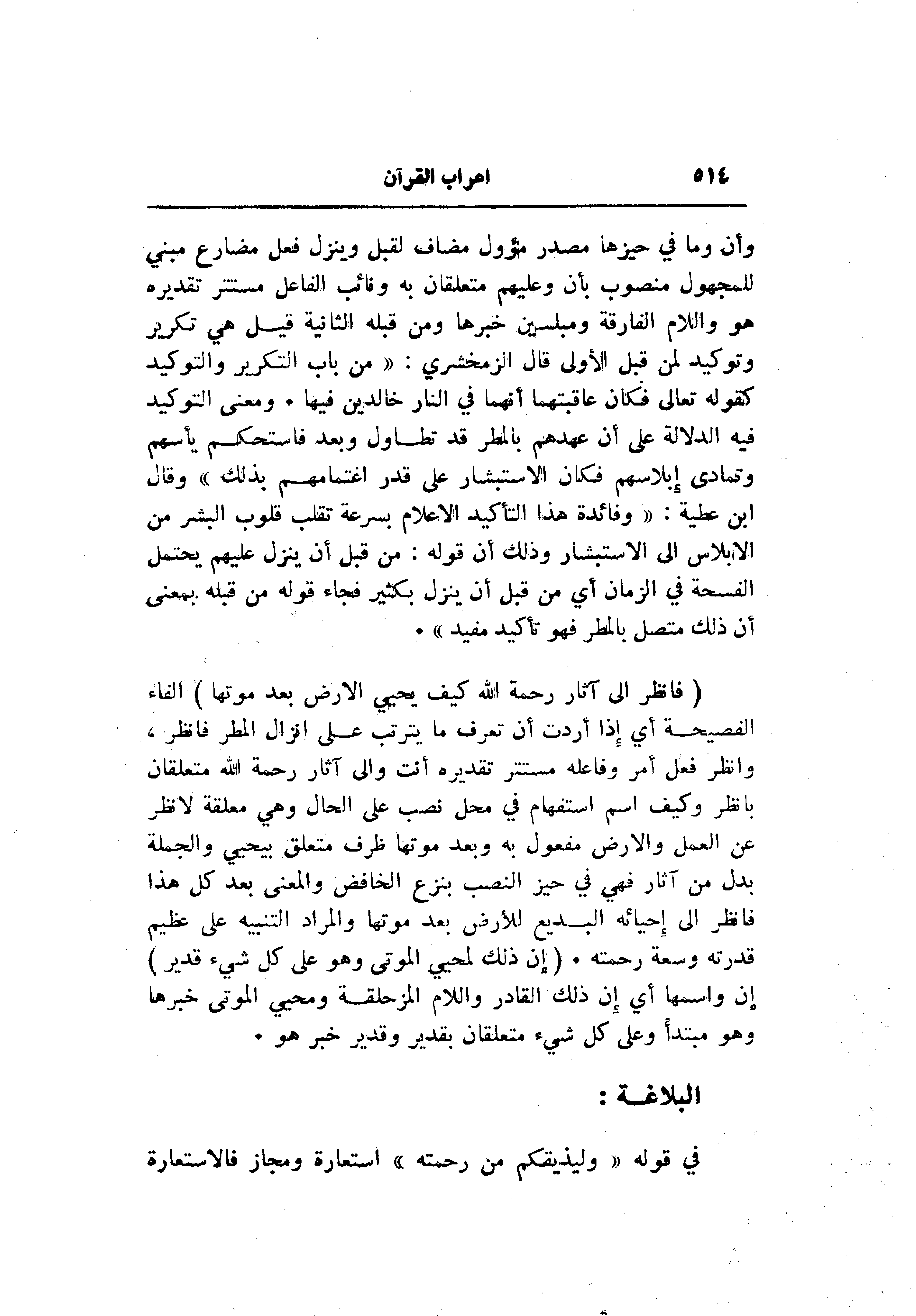 (فَانْظُرْ إِلى آثارِ رَحْمَتِ اللَّهِ كَيْفَ يُحْيِ الْأَرْضَ بَعْدَ مَوْتِها) الفاء الفصيحة أي إذا أردت أن تعرف ما يترتب على إنزال المطر فانظر، وانظر فعل أمر وفاعله مستتر تقديره أنت والى آثار رحمة الله متعلقان بانظر وكيف اسم استفهام في محل نصب على الحال وهي معلقة لانظر عن العمل والأرض مفعول به وبعد موتها ظرف متعلق بيحيي والجملة بدل من آثار فهي في حيز النصب بنزع الخافض والمعنى بعد كل هذا فانظر الى إحيائه البديع للأرض بعد موتها والمراد التنبيه على عظيم قدرته وسعة رحمته. (إِنَّ ذلِكَ لَمُحْيِ الْمَوْتى وَهُوَ عَلى كُلِّ شَيْءٍ قَدِيرٌ) إن واسمها أي إن ذلك القادر واللام المزحلقة ومحيي الموتى خبرها وهو مبتدأ وعلى كل شيء متعلقان بقدير وقدير خبر هو.
