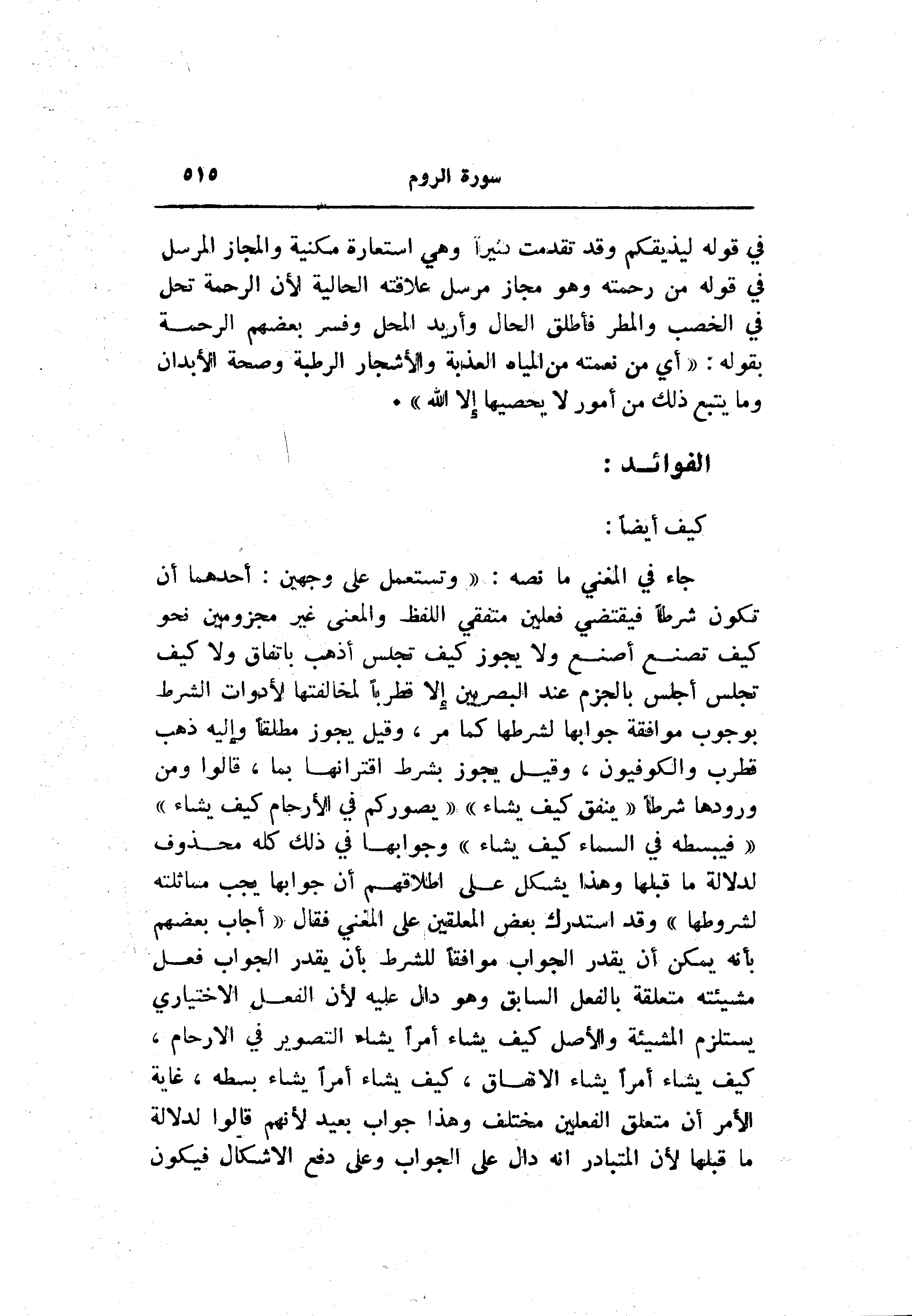 جاء في المغني ما نصه: «وتستعمل على وجهين: أحدهما أن تكون شرطا فيقتضي فعلين متفقي اللفظ والمعنى غير مجزومين نحو كيف تصنع أصنع ولا يجوز كيف تجلس أذهب باتفاق ولا كيف تجلس أجلس بالجزم عند البصريين إلا قطربا لمخالفتها لأدوات الشرط بوجوب موافقة جوابها لشرطها كما مر، وقيل يجوز مطلقا وإليه ذهب قطرب والكوفيون، وقيل يجوز بشرط اقترانها بما، قالوا ومن ورودها شرطا «ينفق كيف يشاء» «يصوركم في الأرحام كيف يشاء» «فيبسطه في السماء كيف يشاء» وجوابها في ذلك كله محذوف لدلالة ما قبلها وهذا يشكل على إطلاقهم أن جوابها يجب مماثلته لشروطها» وقد استدرك بعض المعلقين على المغني فقال «أجاب بعضهم بأنه يمكن أن يقدر الجواب موافقا للشرط بأن يقدر الجواب فعل مشيئته متعلقة بالفعل السابق وهو دال عليه لأن الفعل الاختياري يستلزم المشيئة والأصل كيف يشاء أمرا يشاء التصوير في الأرحام، كيف يشاء أمرا يشاء الانفاق، كيف يشاء أمرا يشاء بسطه، غاية الأمر أن متعلق الفعلين مختلف وهذا جواب بعيد لأنهم قالوا لدلالة ما قبلها لأن المتبادر انه دال على الجواب وعلى دفع الاشكال فيكون
